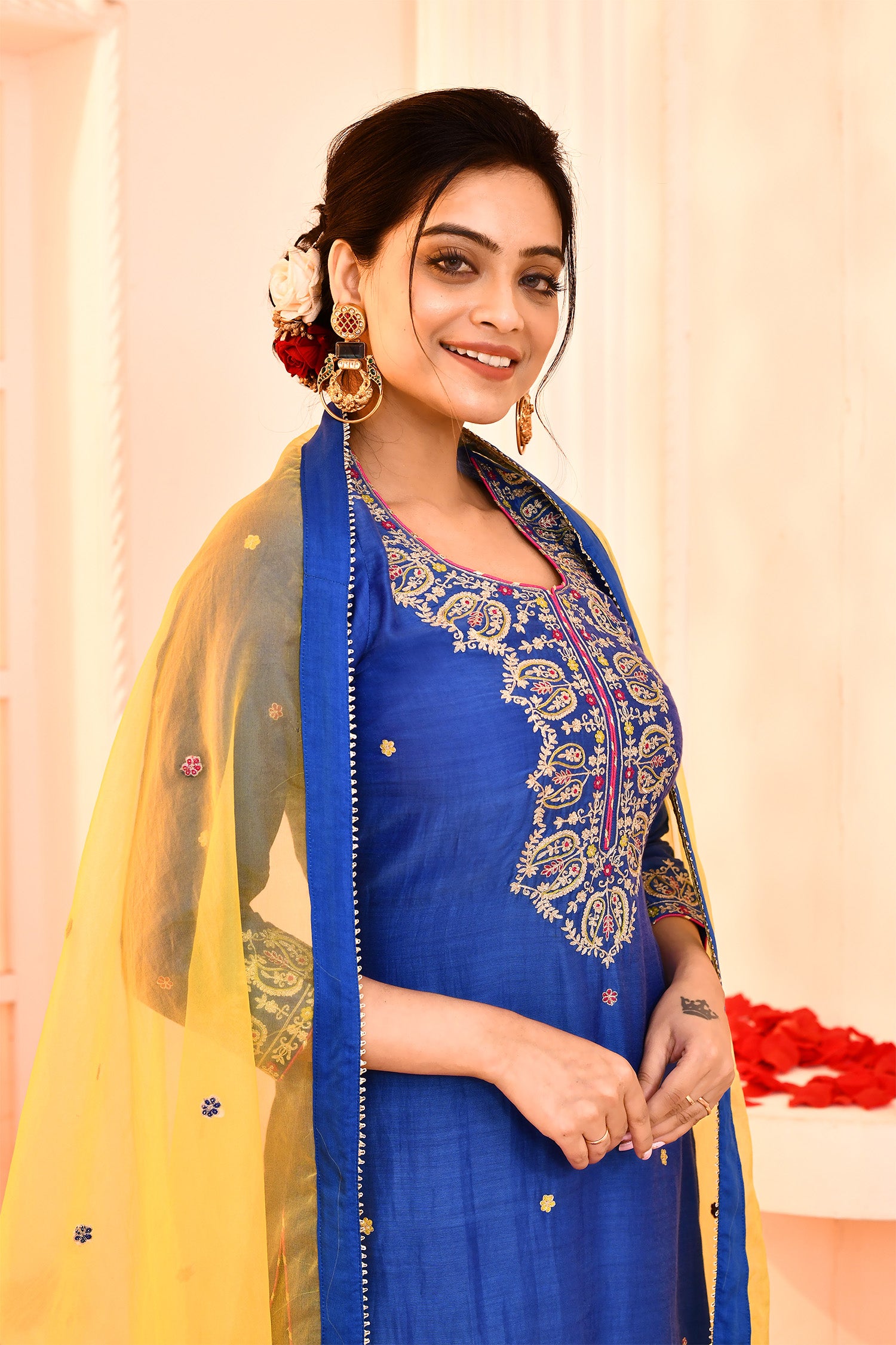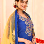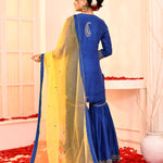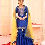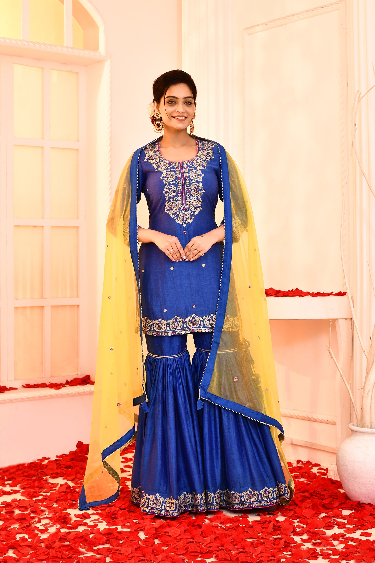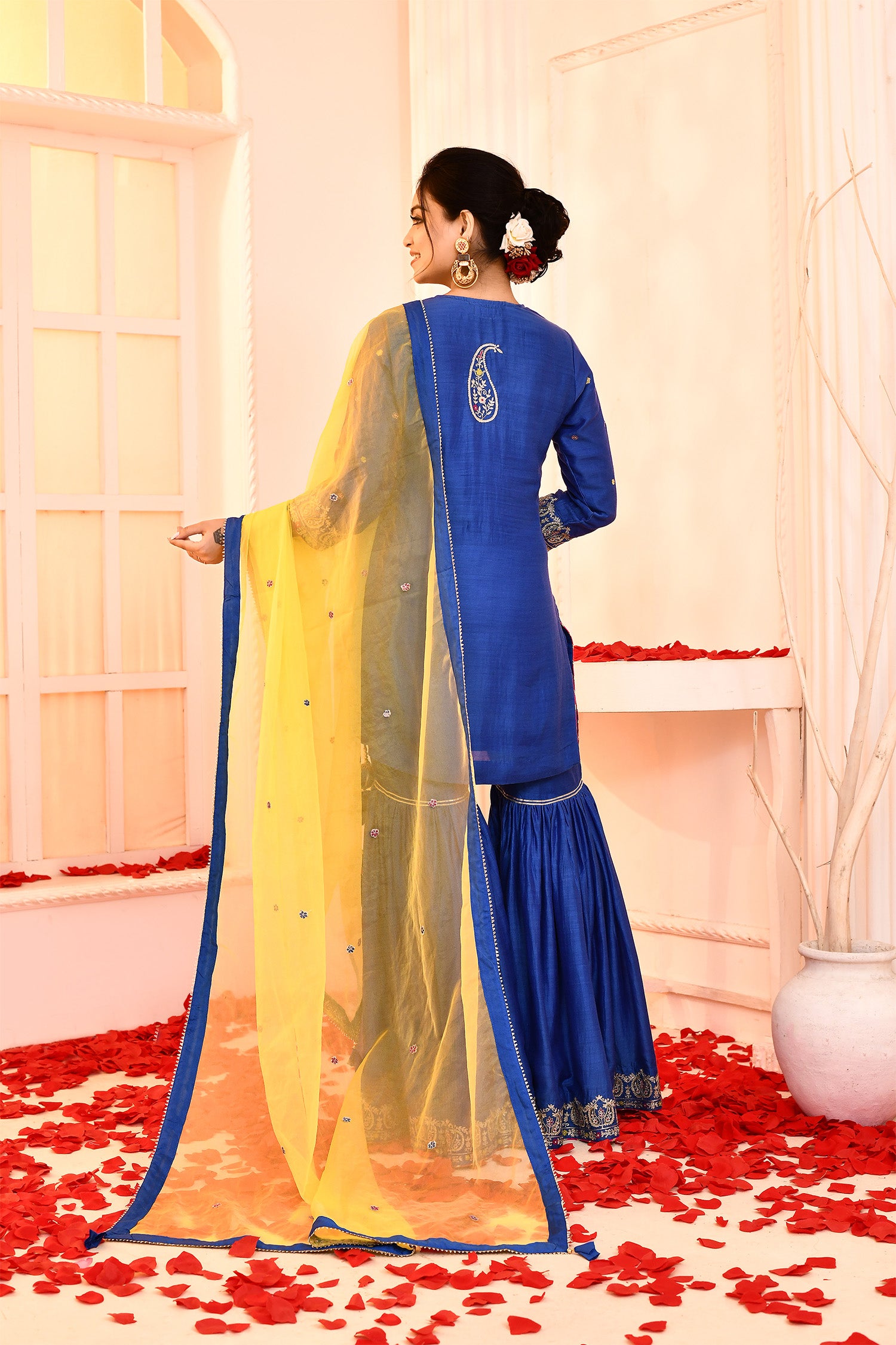 Blue Embroidered Cotton Silk Kurta And Gharara Set With Contrast Dupatta