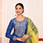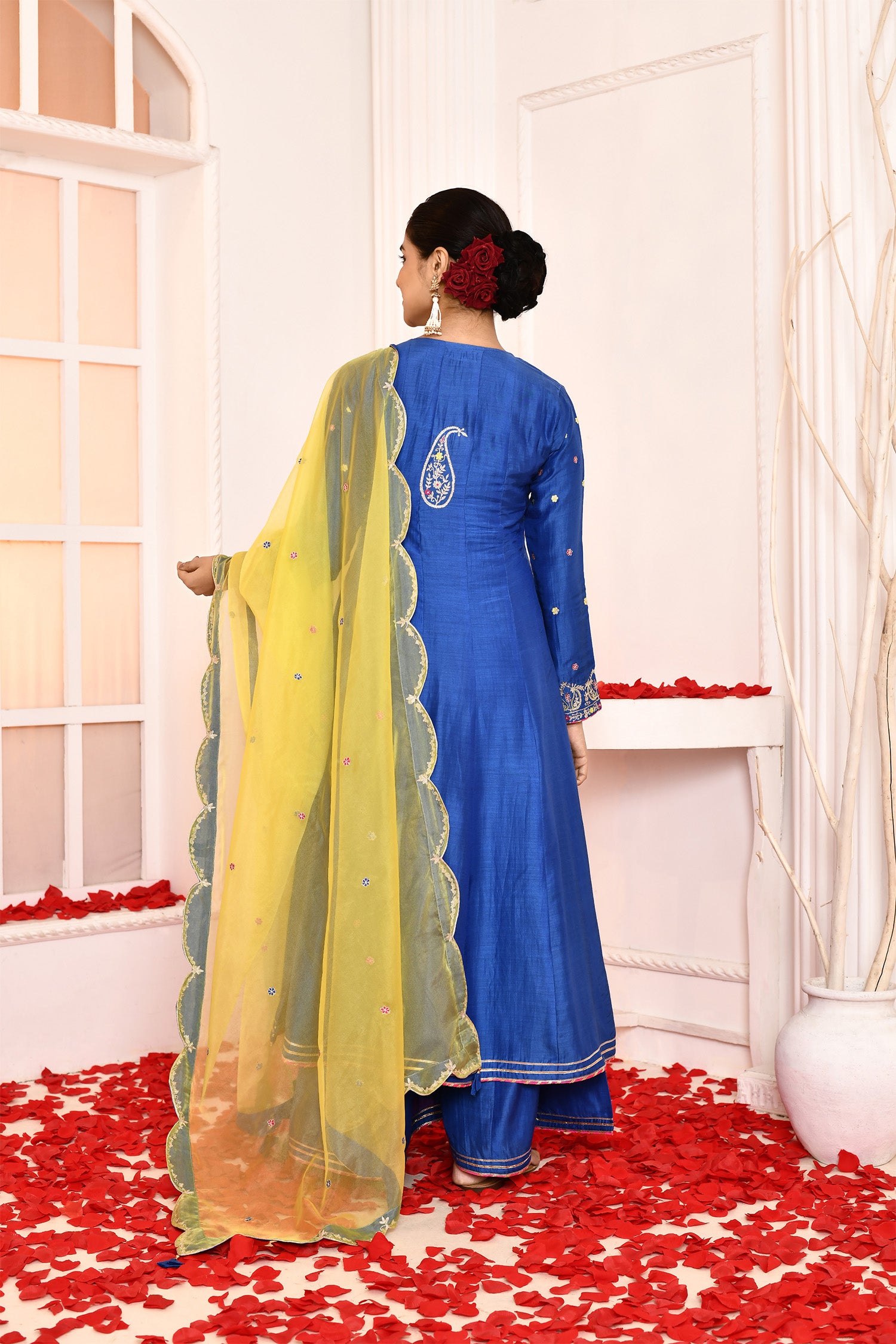 Blue Embroidery Neck Anarkali And Gottalace Finish Flair Palazzo Set