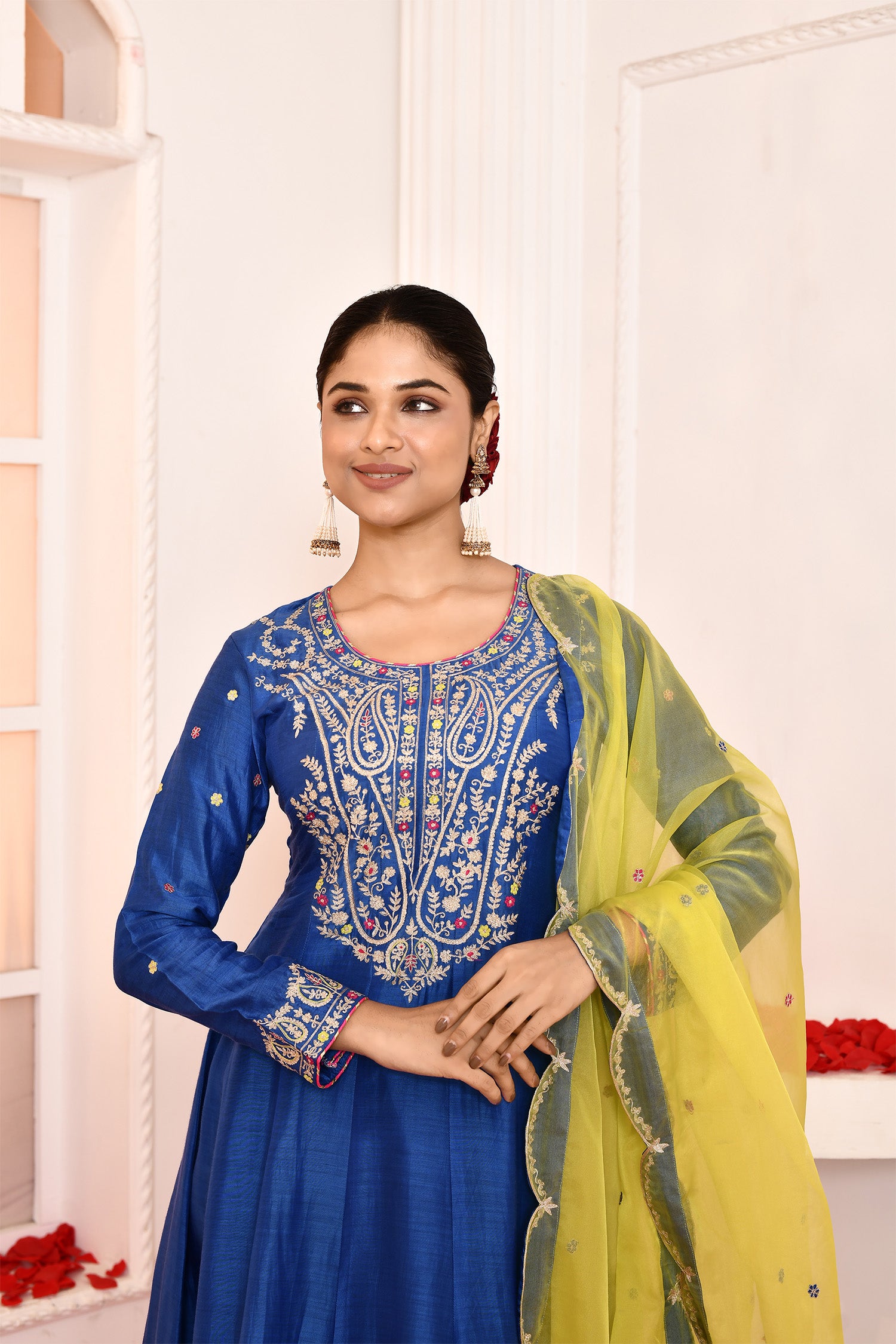 The aari Embroidery Neck cotton silk Anarkali And Gotta lace Finish Flair Plazzo With Contrast organza Dupatta Set for a casual yet dignified look along with the stylish comfort.