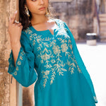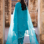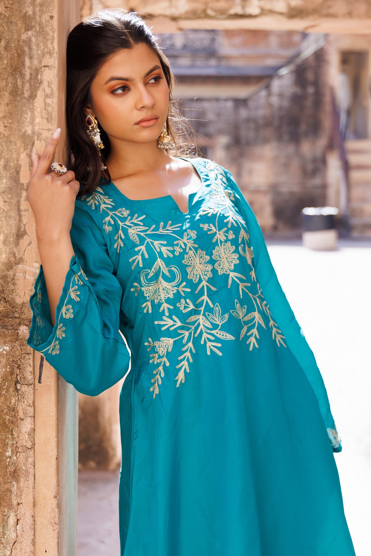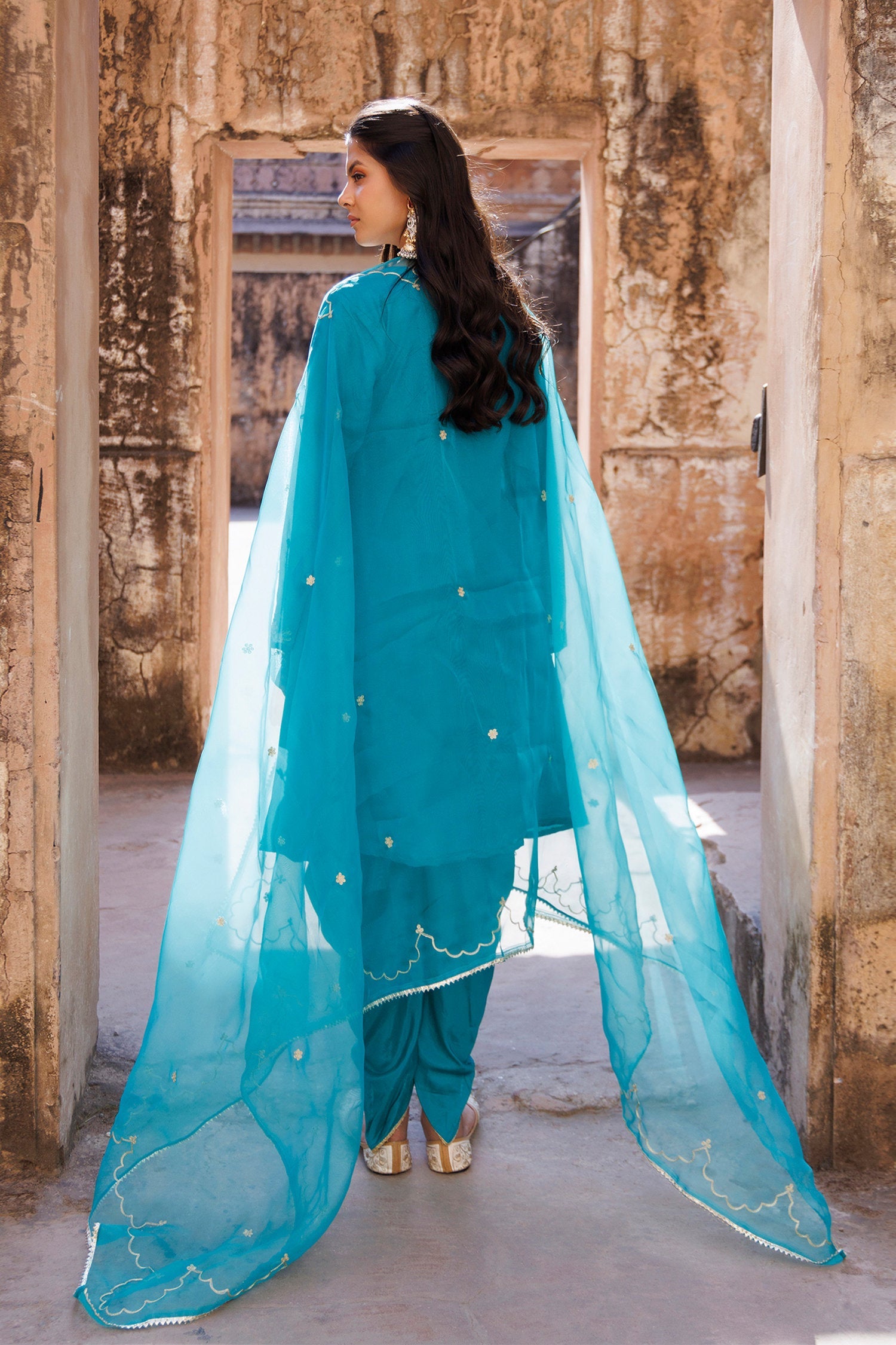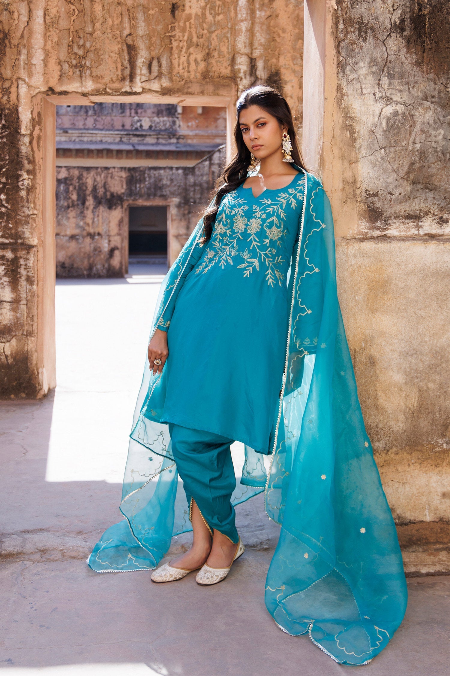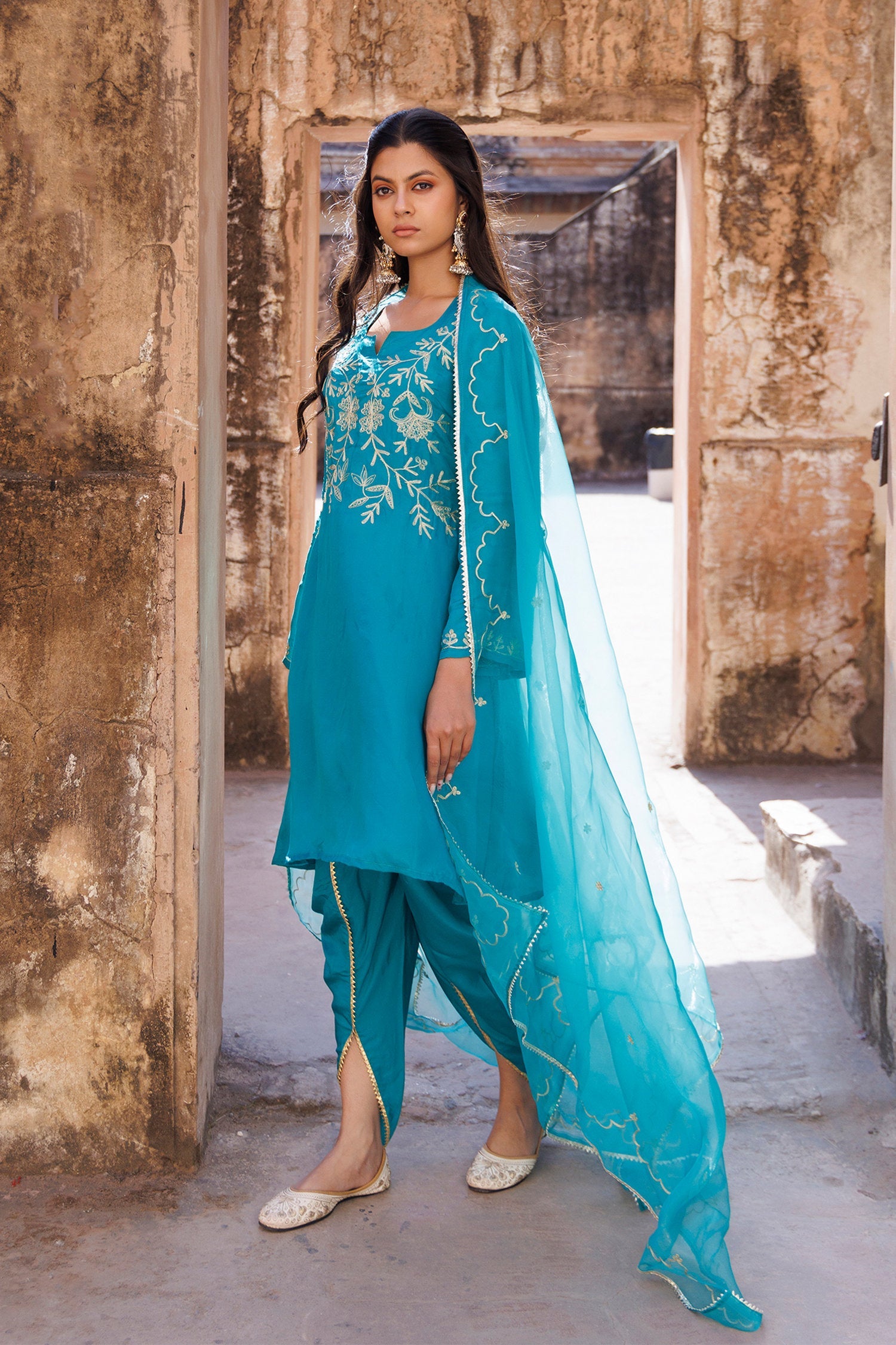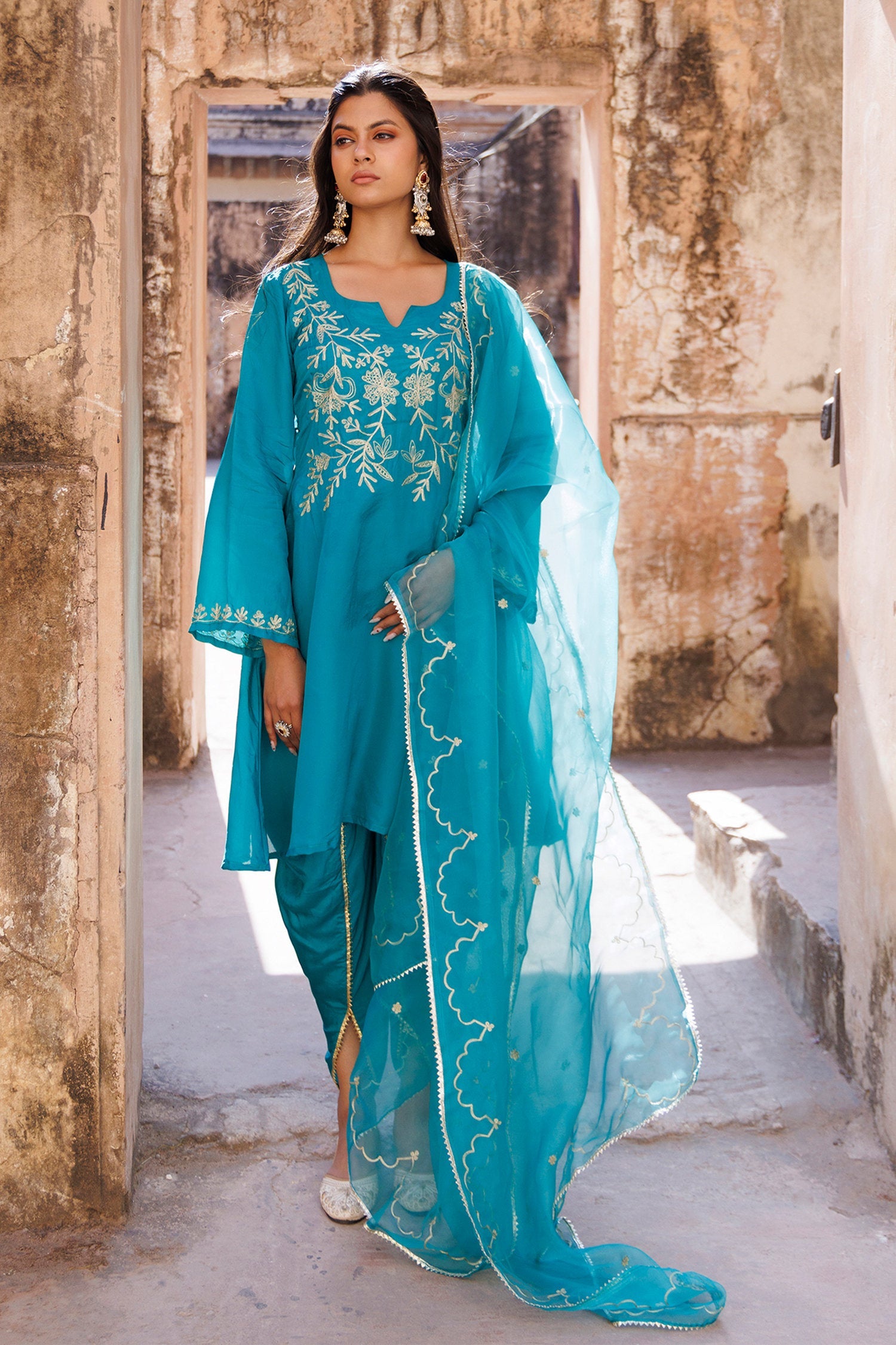 Blue green silk kurta set features V neckline and full sleeves adorned with aari embroidery .The dhoti pants giving a unique look and organza dupatta embellished with lace and scallop design spread all across the dupatta