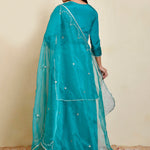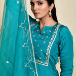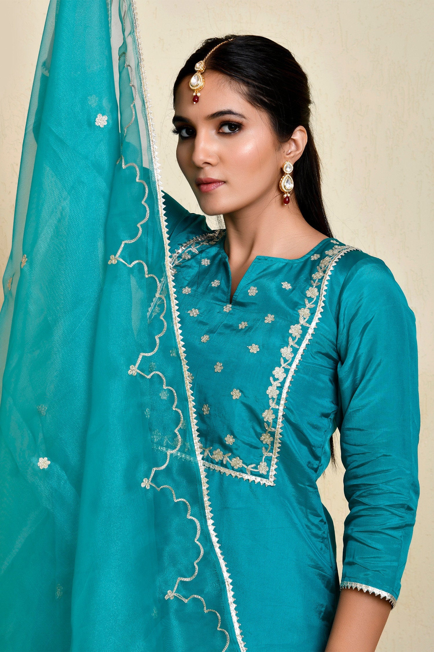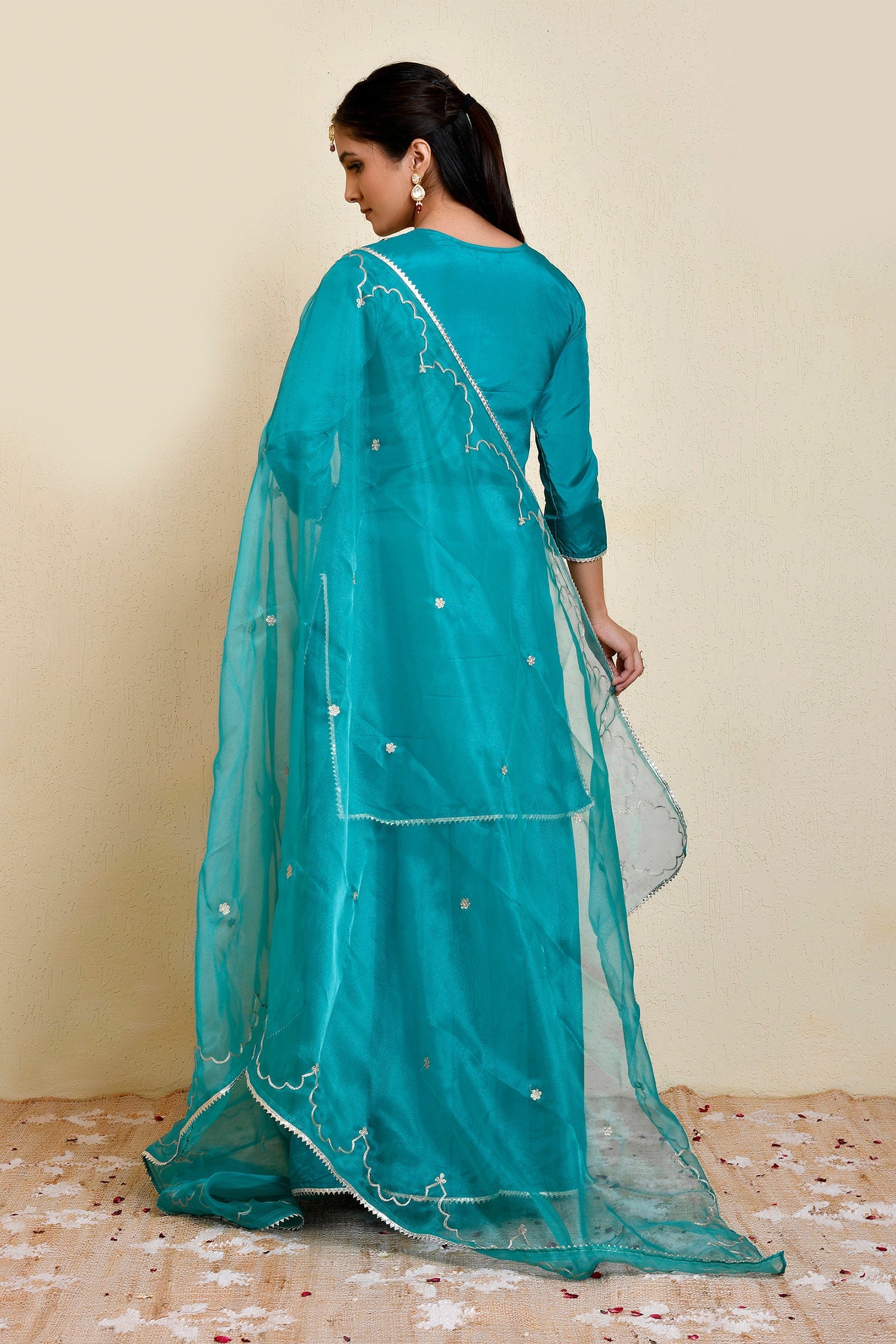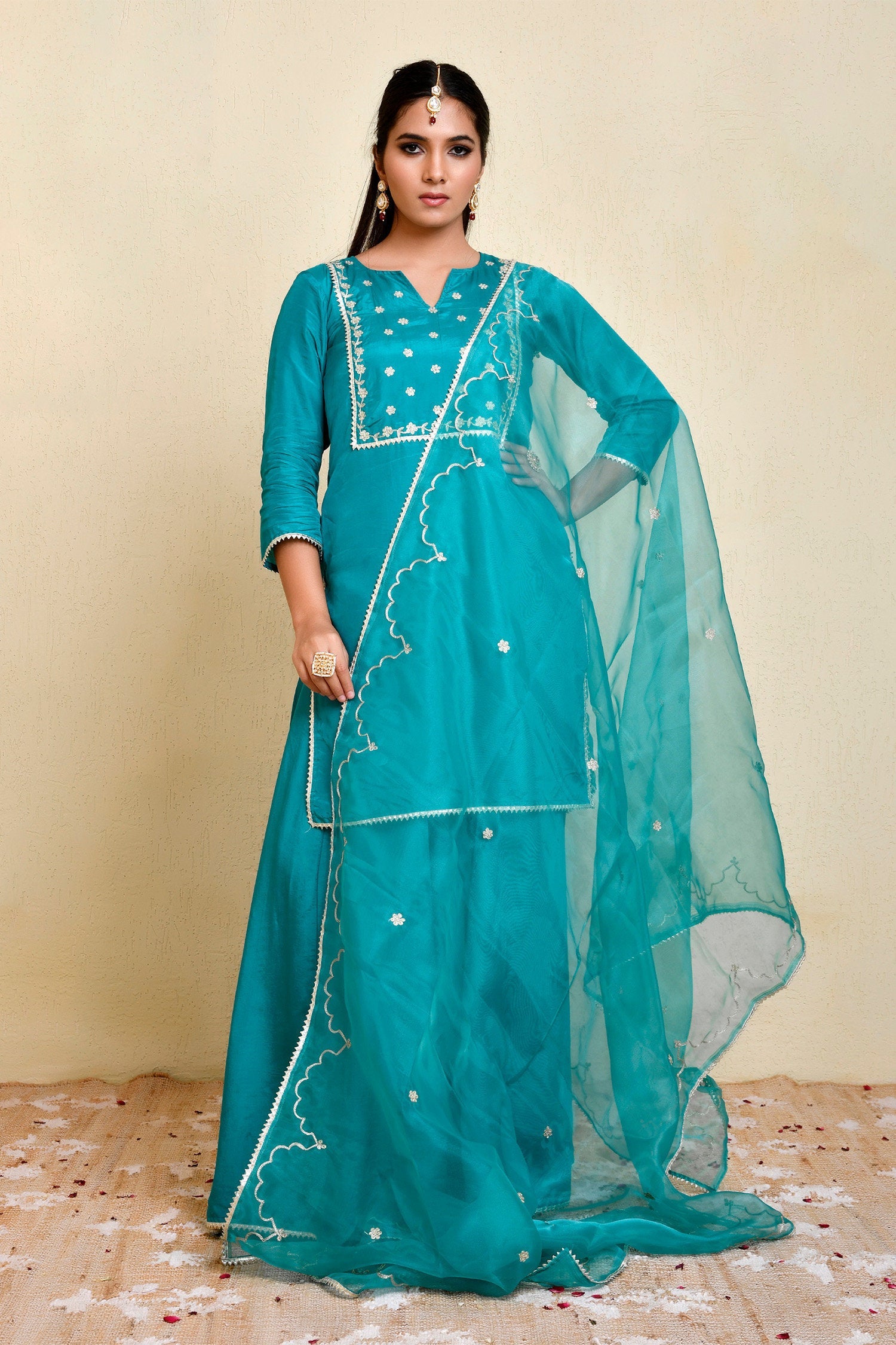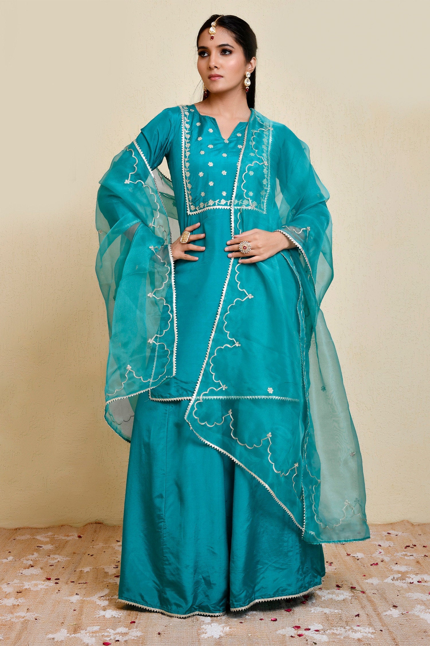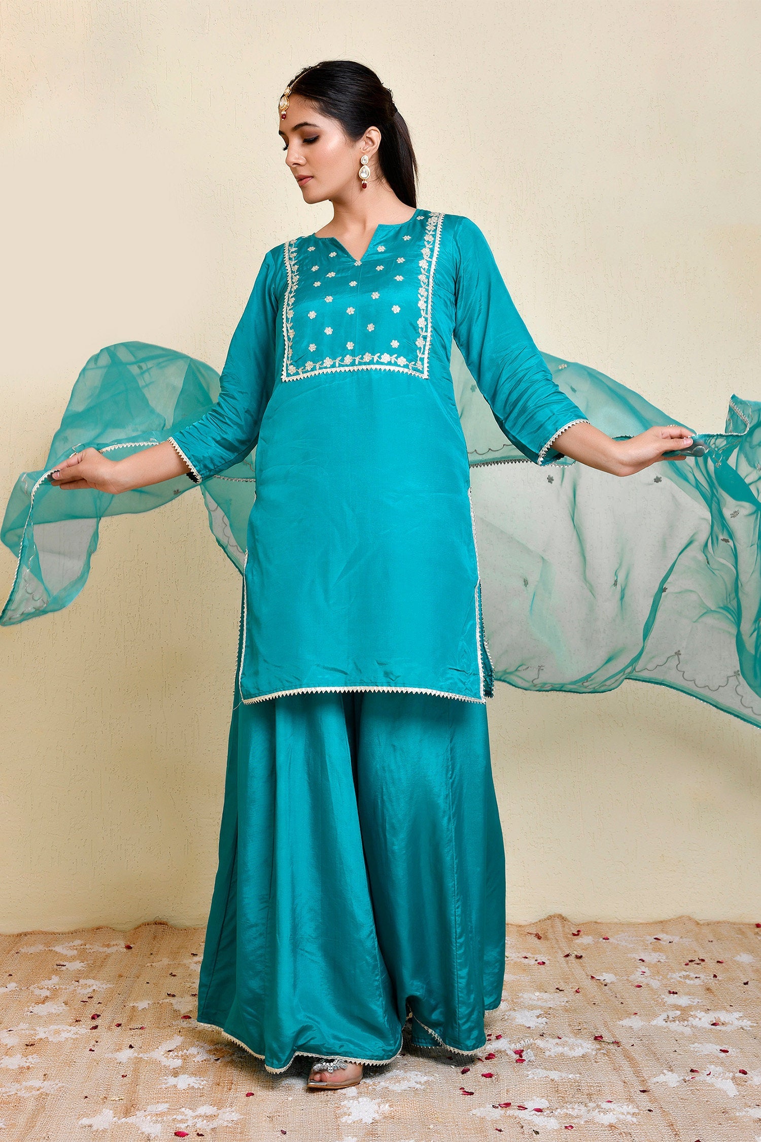 A perfect choice for the grand occasions includes Blue green silk kurti set adorned lace and floral design on top with sharara pants.The dupatta adorned with lace border and scallop like pattern adds the finishing touch to the entire garment.