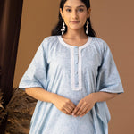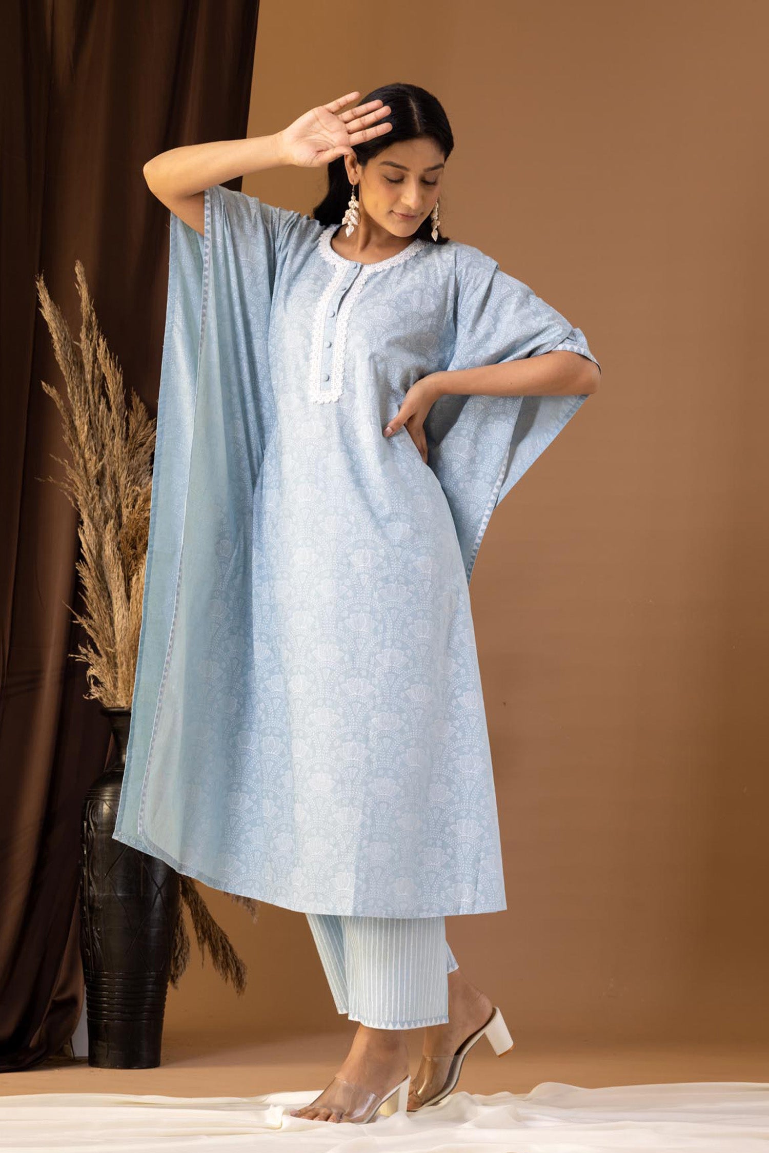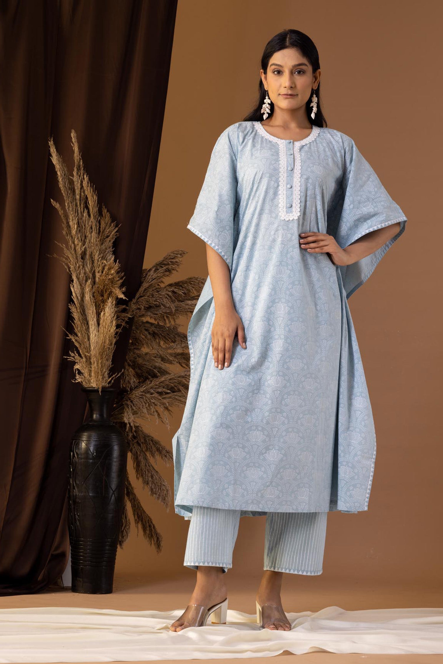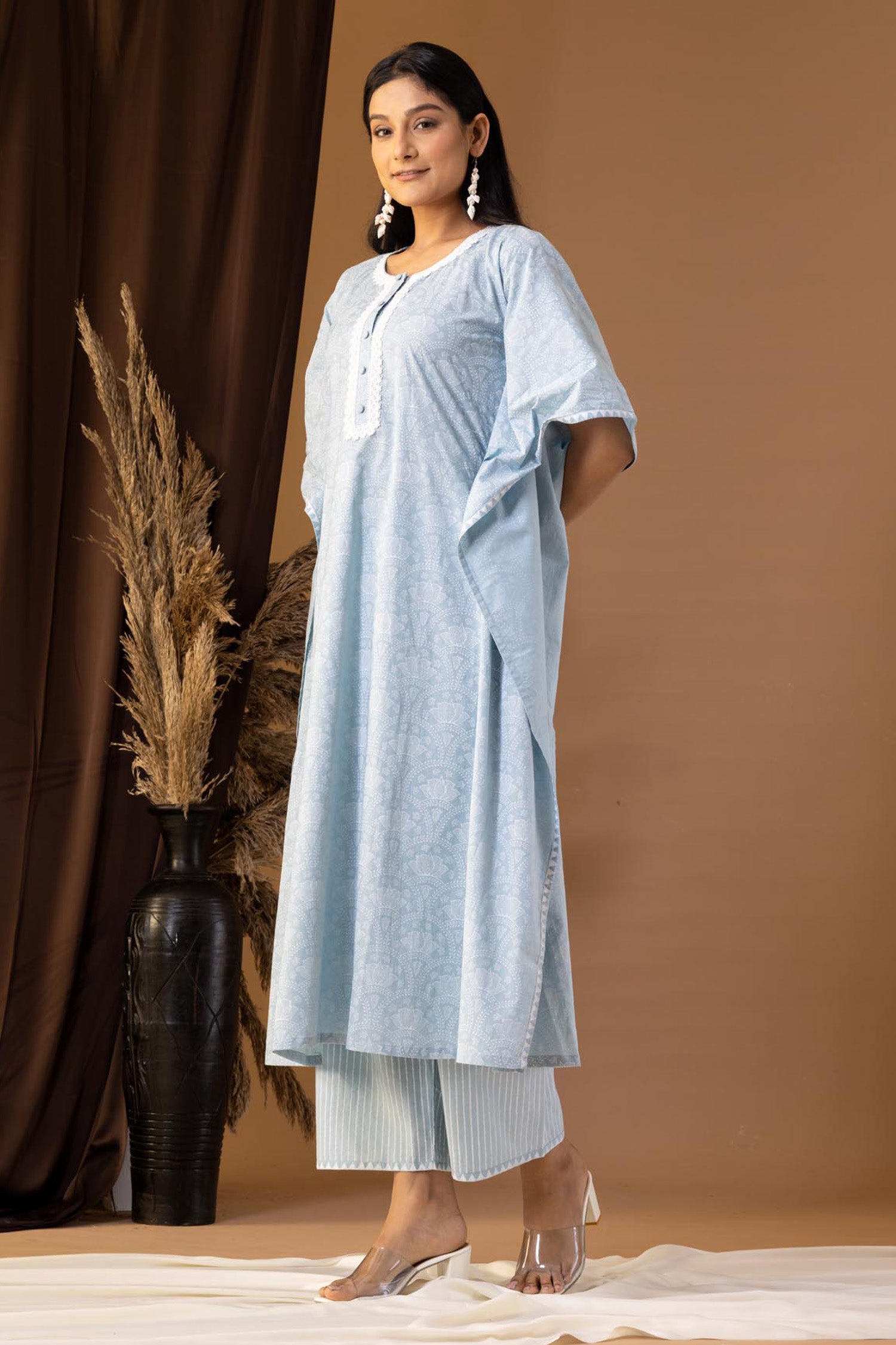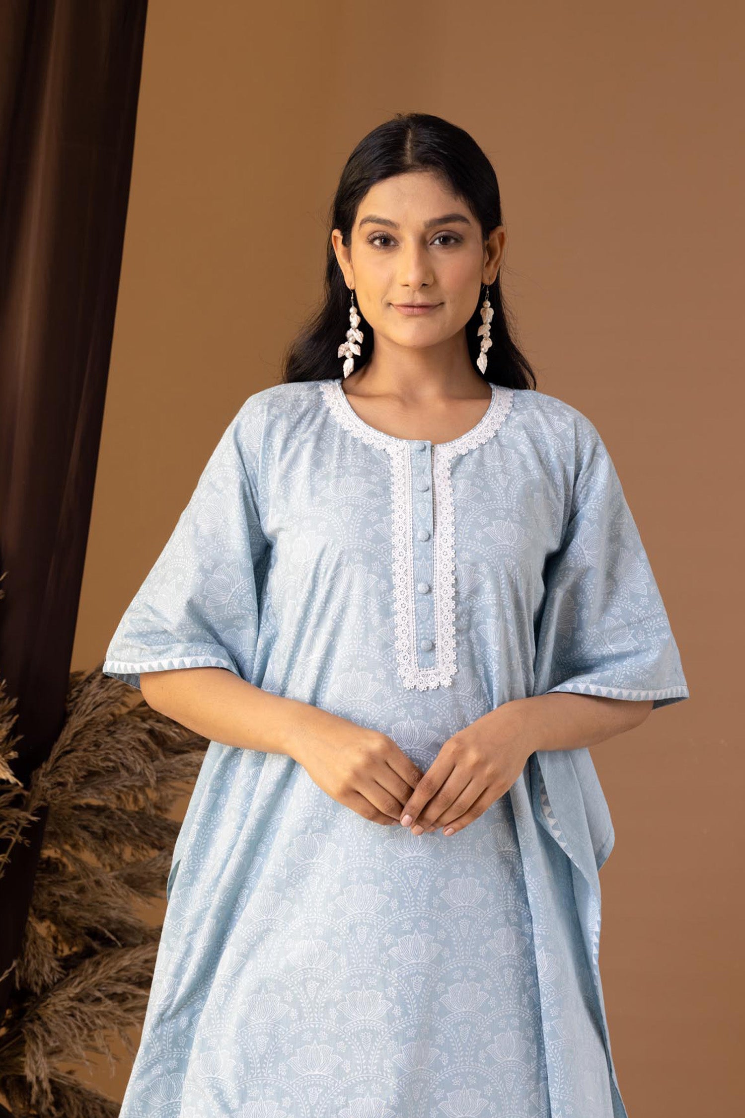 The Blue Khadi Printed Cotton Kaftan with lace detailing round neck with Plazzo for comfortable and a stylish look.