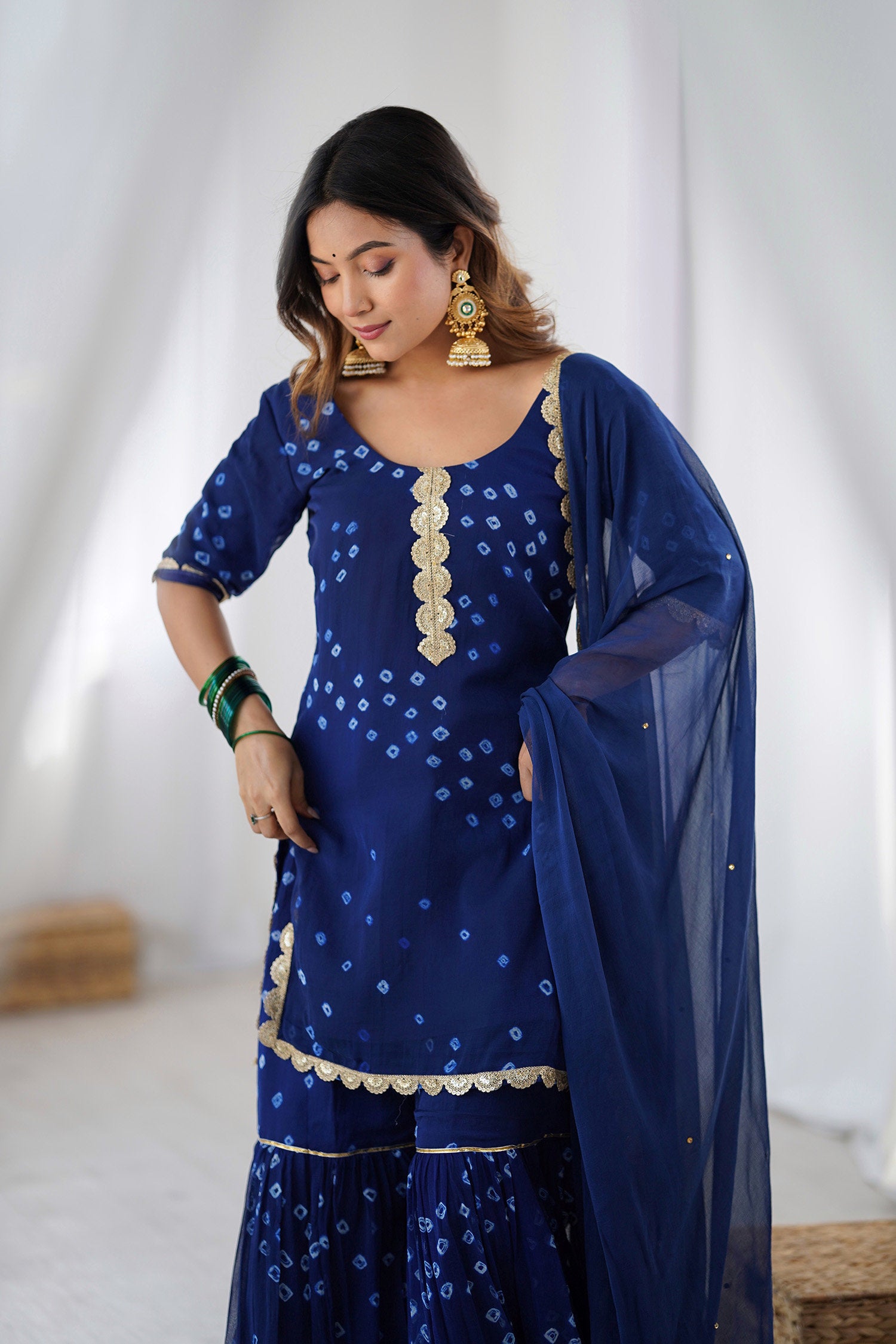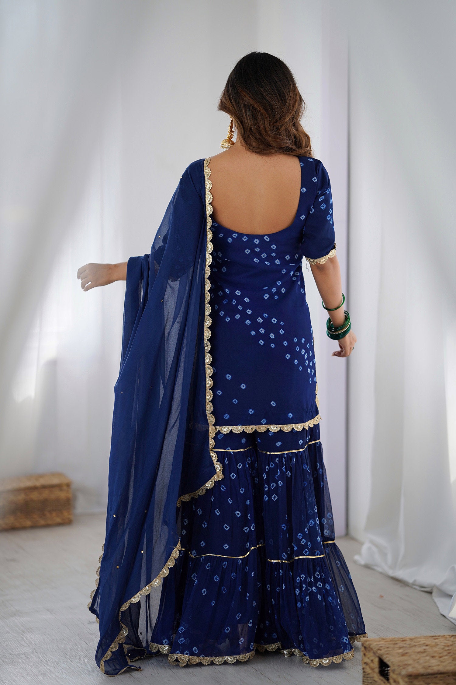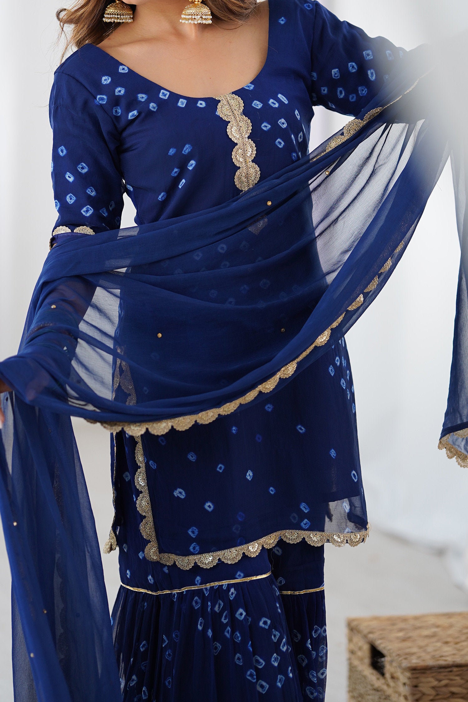 The blue chiffon handcrafted bandhani kurta set with round neck and lace detailing with flared sharara with lace work and a chiffon dupatta for an elegant look.