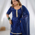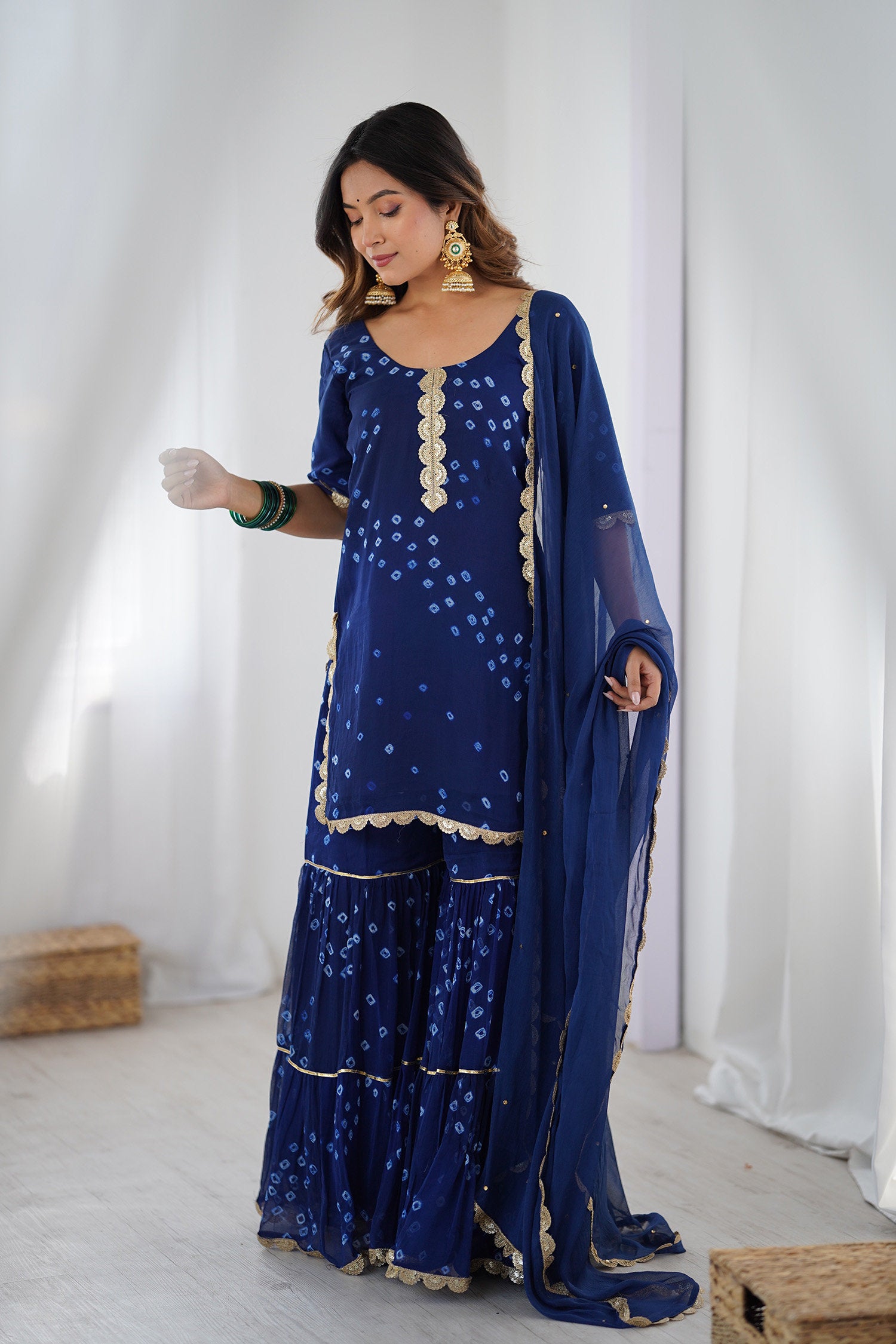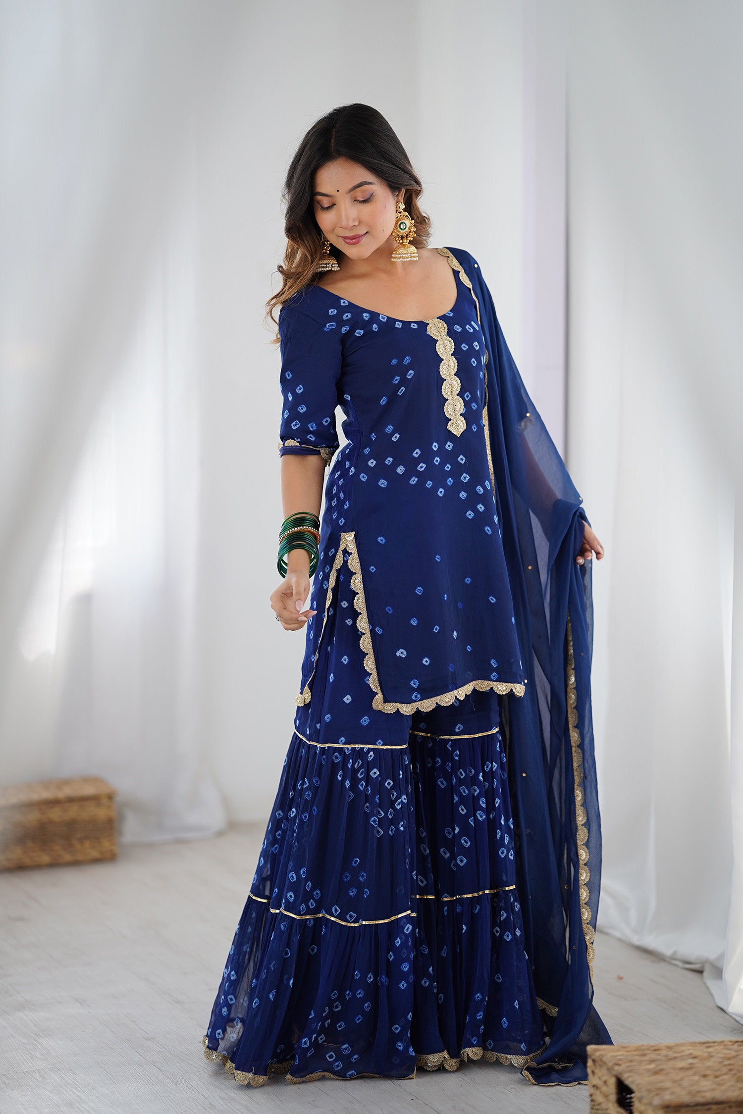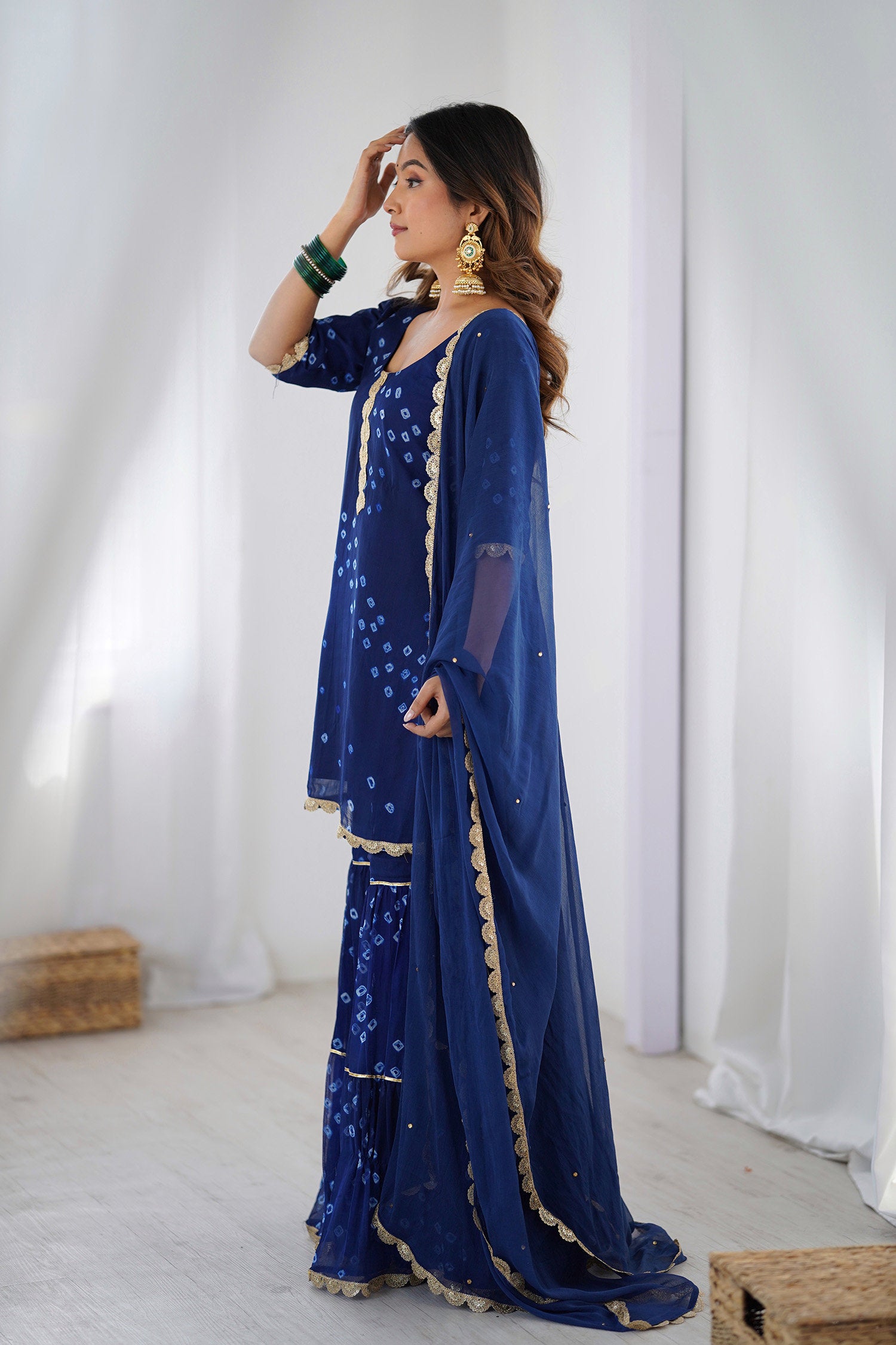 The blue chiffon handcrafted bandhani kurta set with round neck and lace detailing with flared sharara with lace work and a chiffon dupatta for an elegant look.