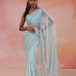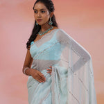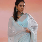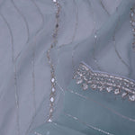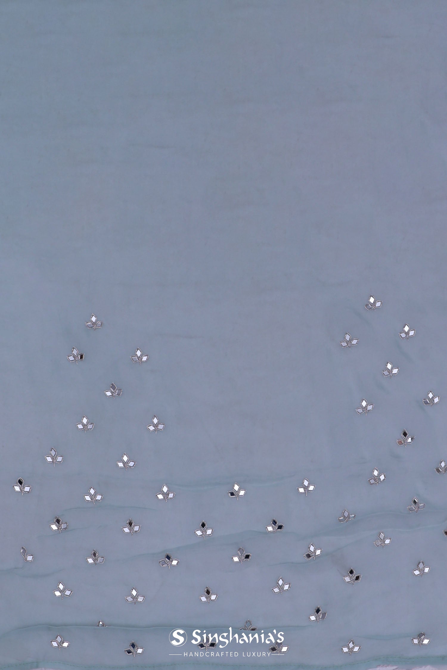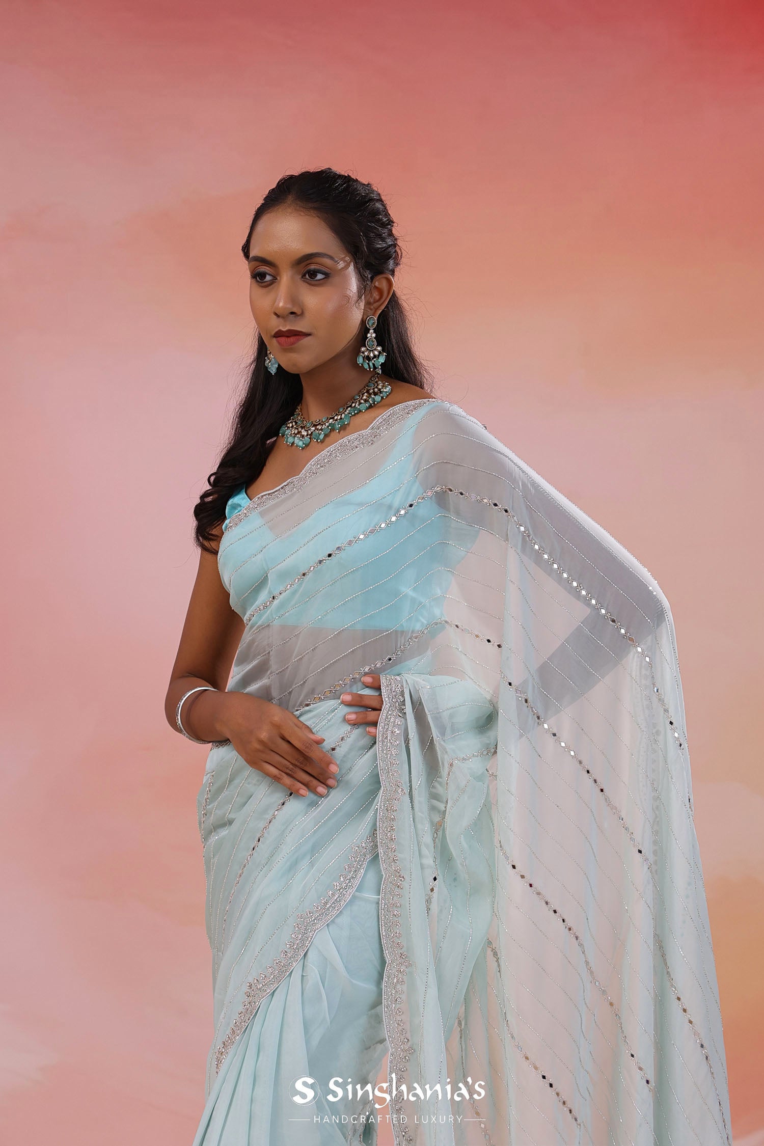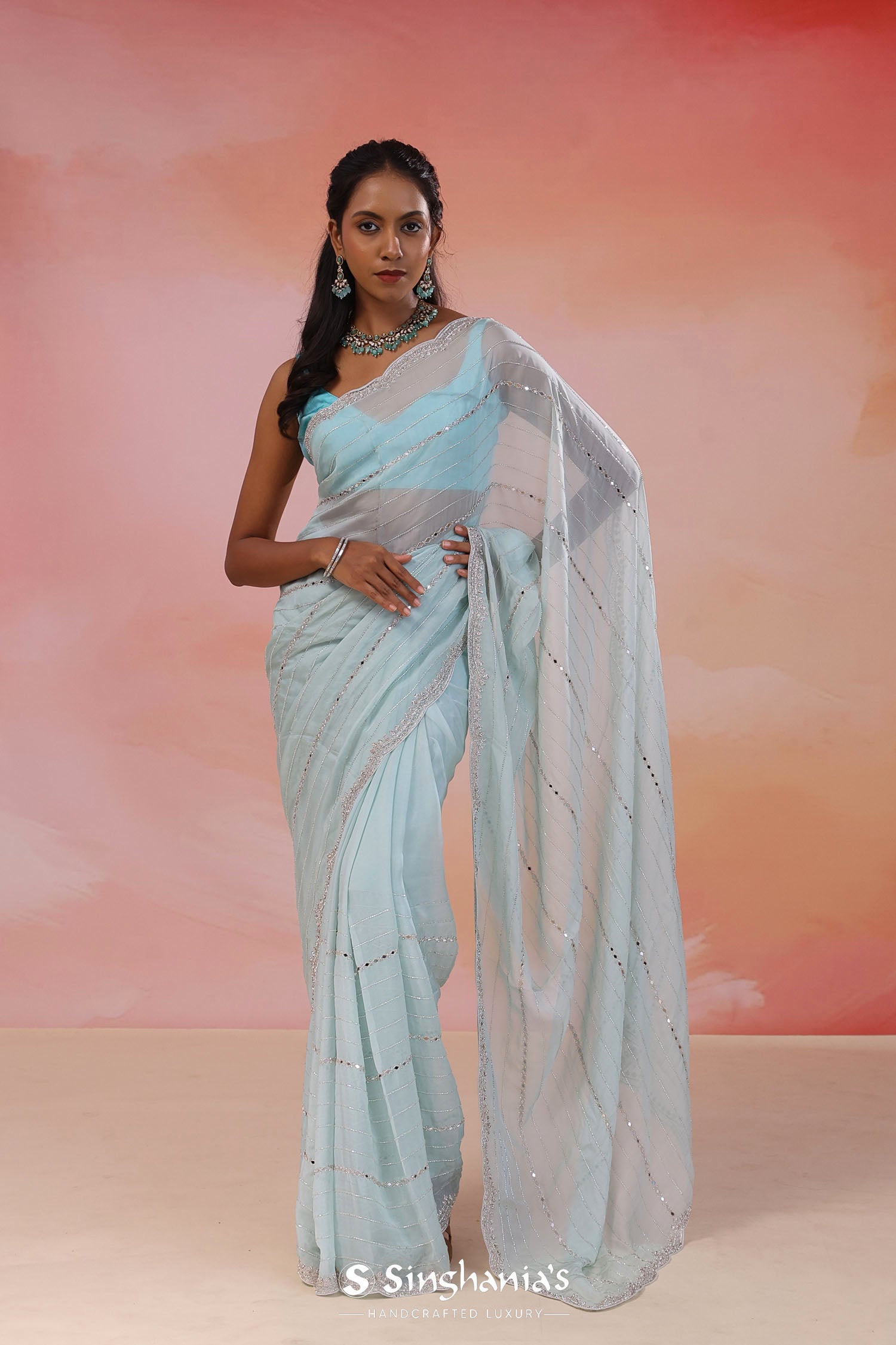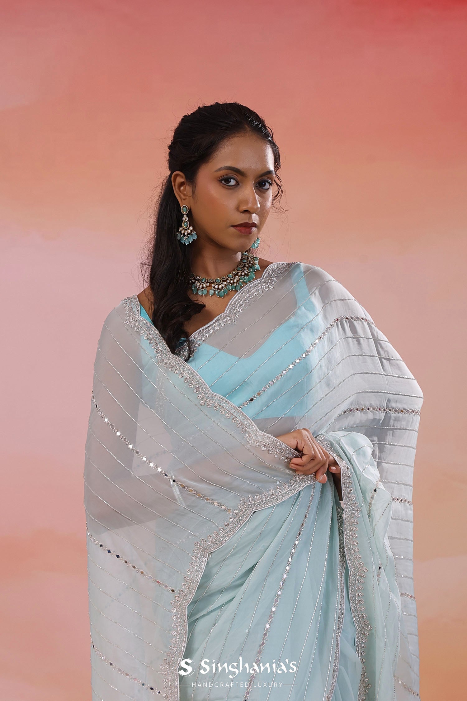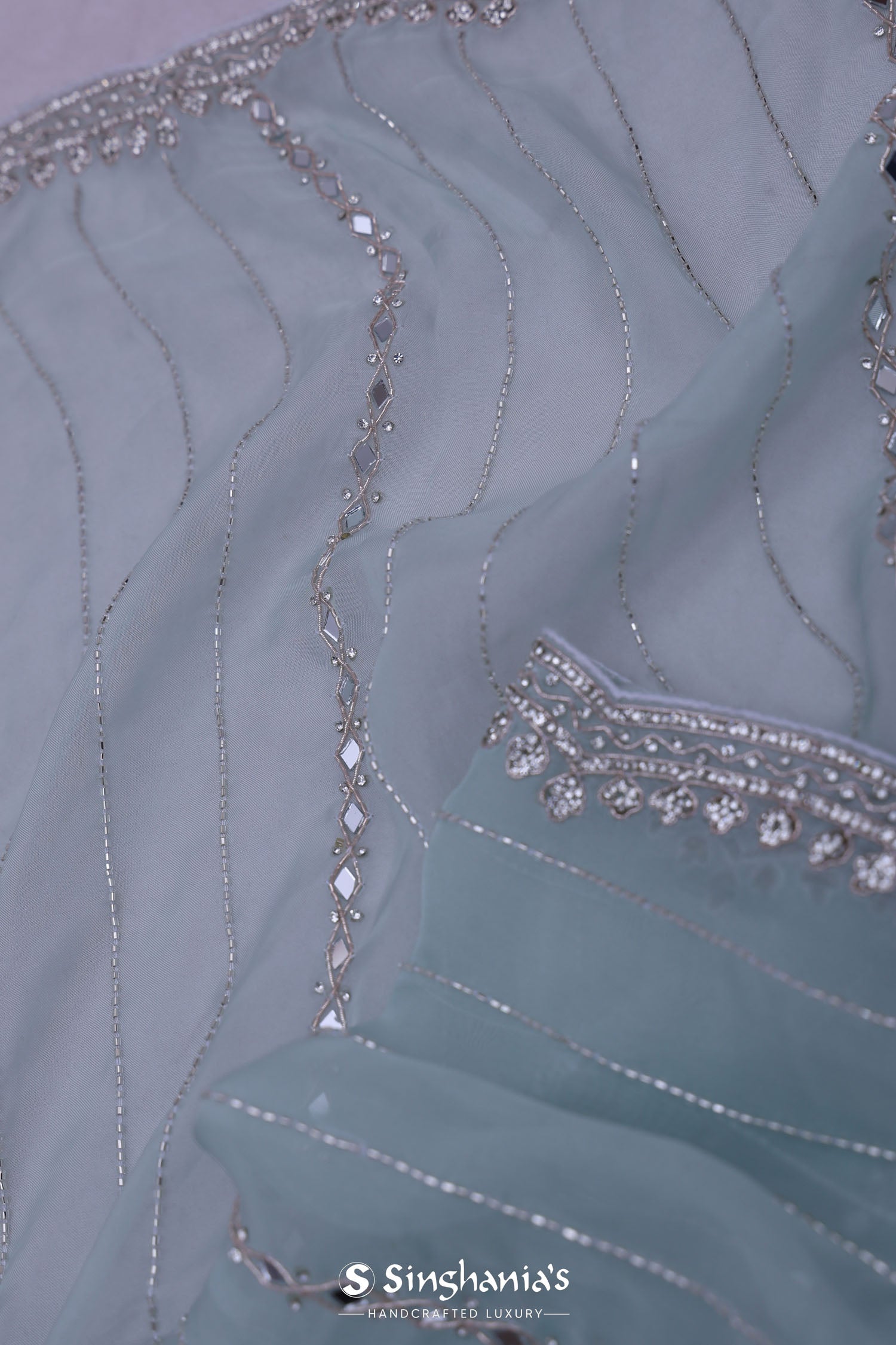 This Bluish gray organza saree features mirror, zardosi and beads work forming a horizontal lines on the body along with scallop border making it ideal choice for traditional occasions