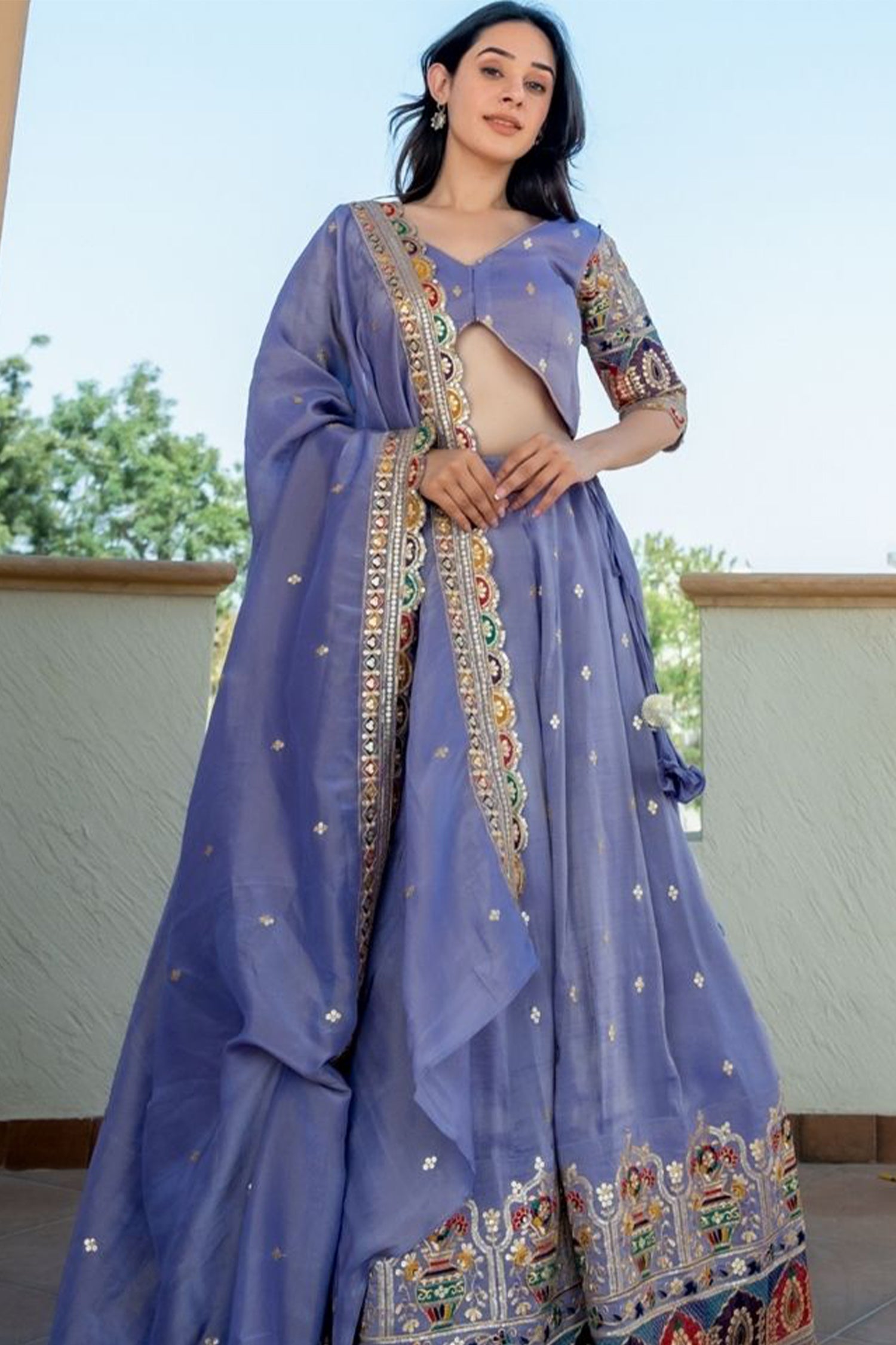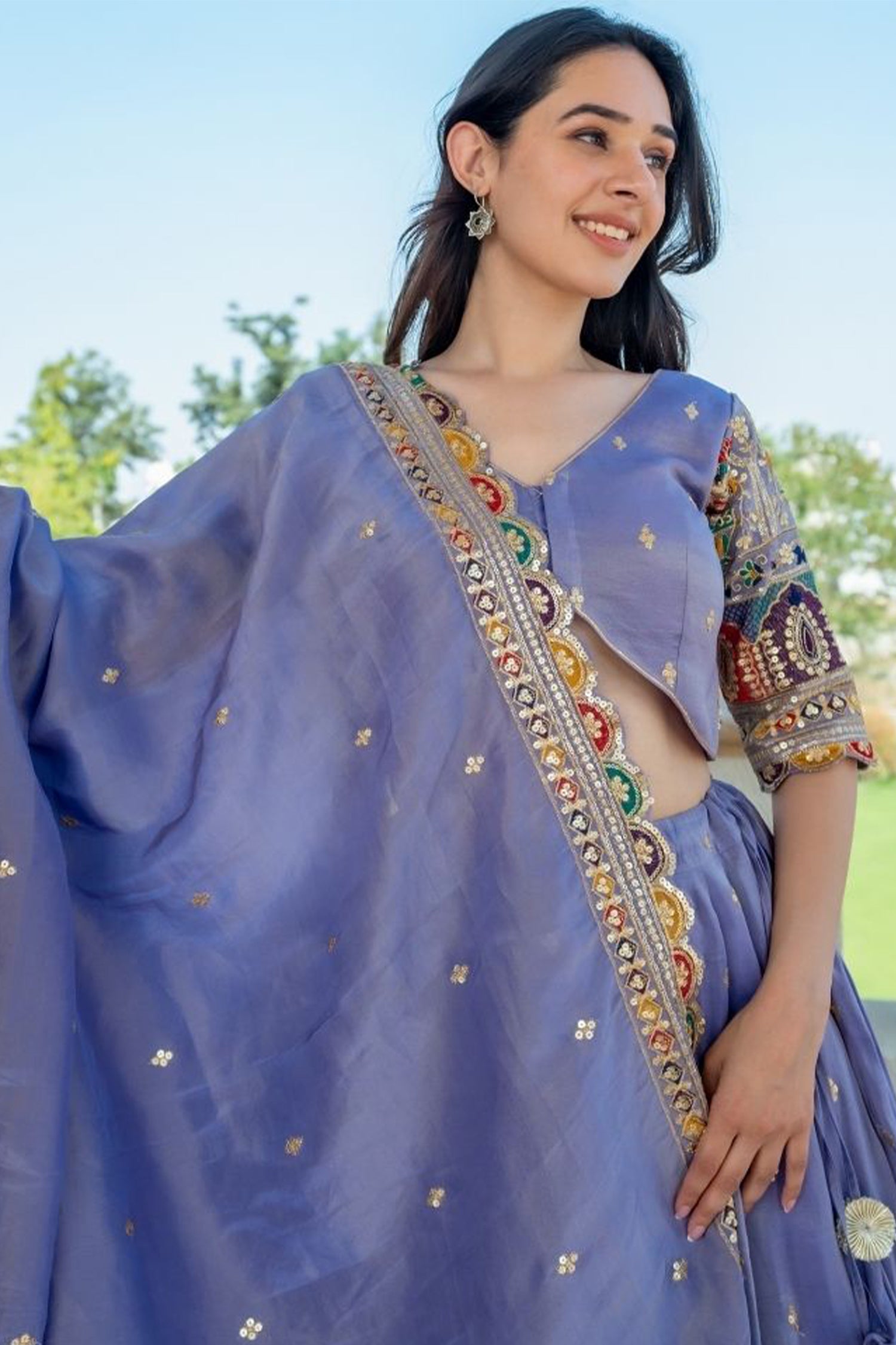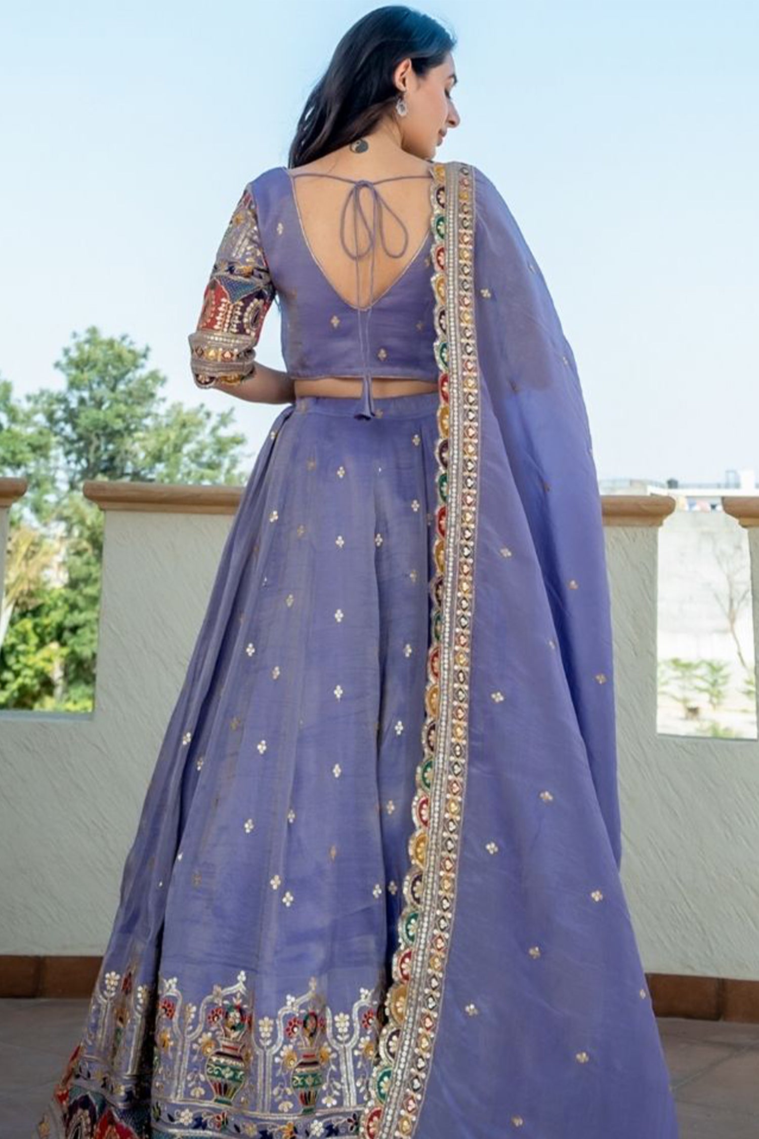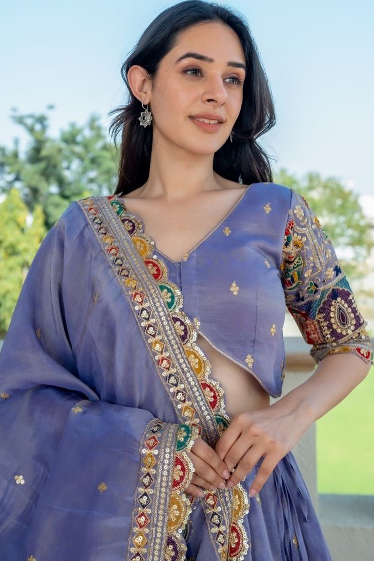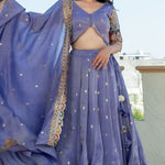The beautiful bluish lilac tissue embroidered sequin work lehenga set with a matching dupatta for a stylish way of dressing that combines tradition with trendy fashion.