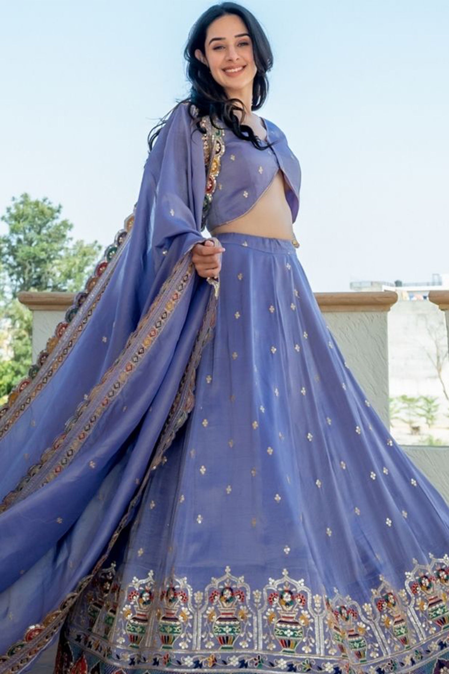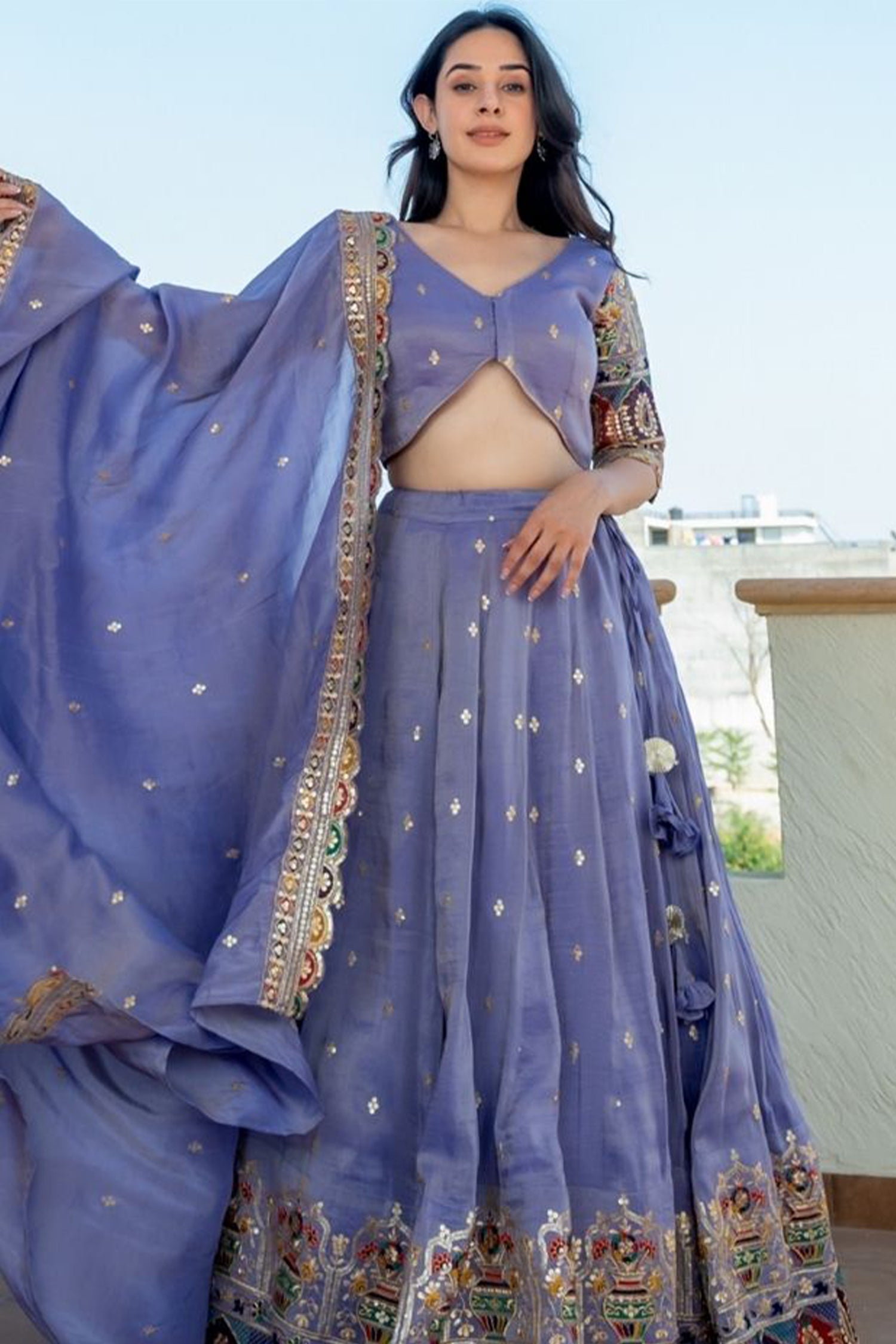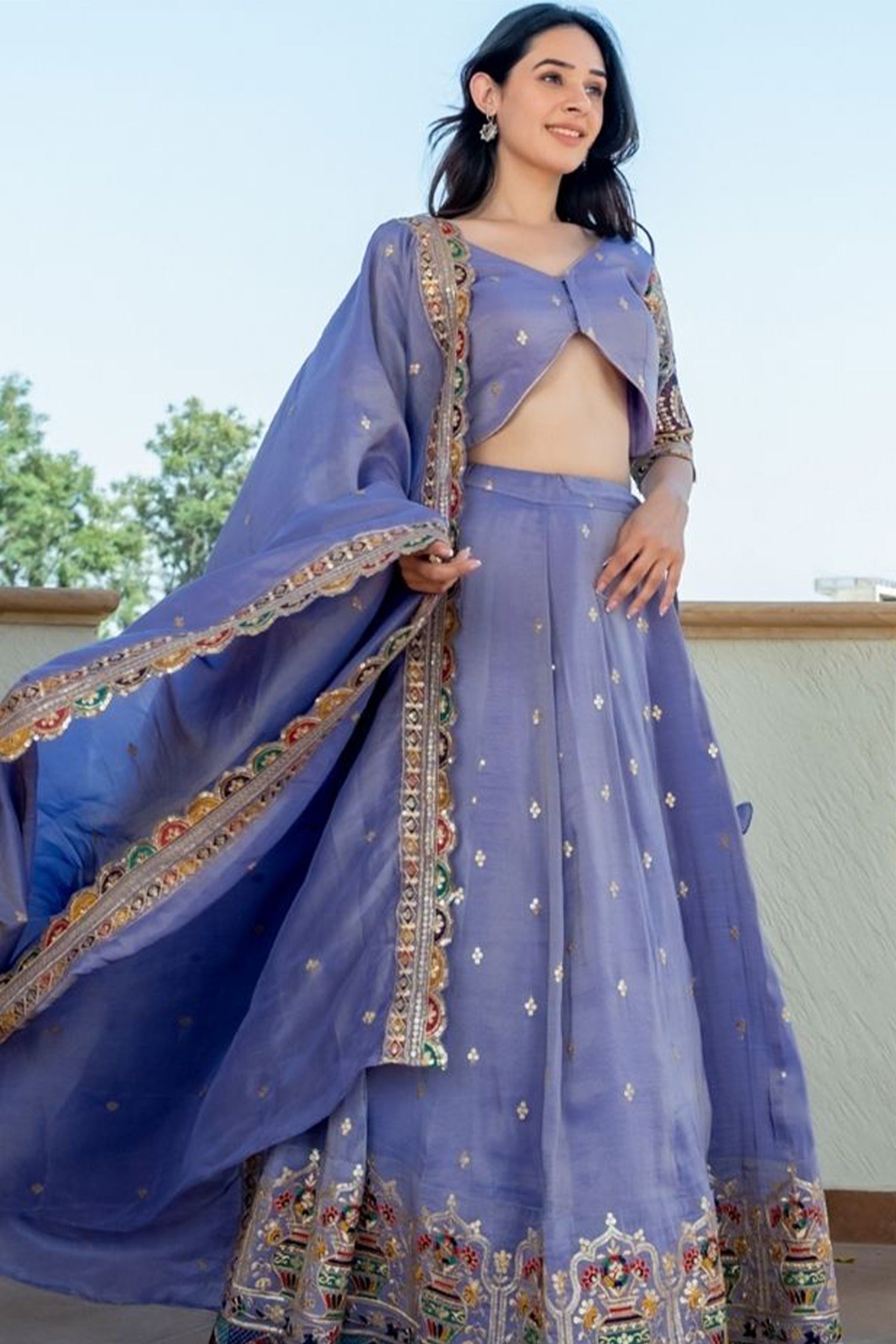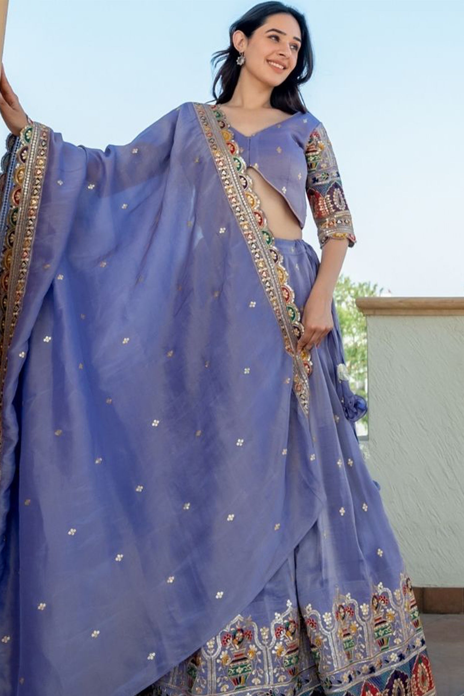 The beautiful bluish lilac tissue embroidered sequin work lehenga set with a matching dupatta for a stylish way of dressing that combines tradition with trendy fashion.