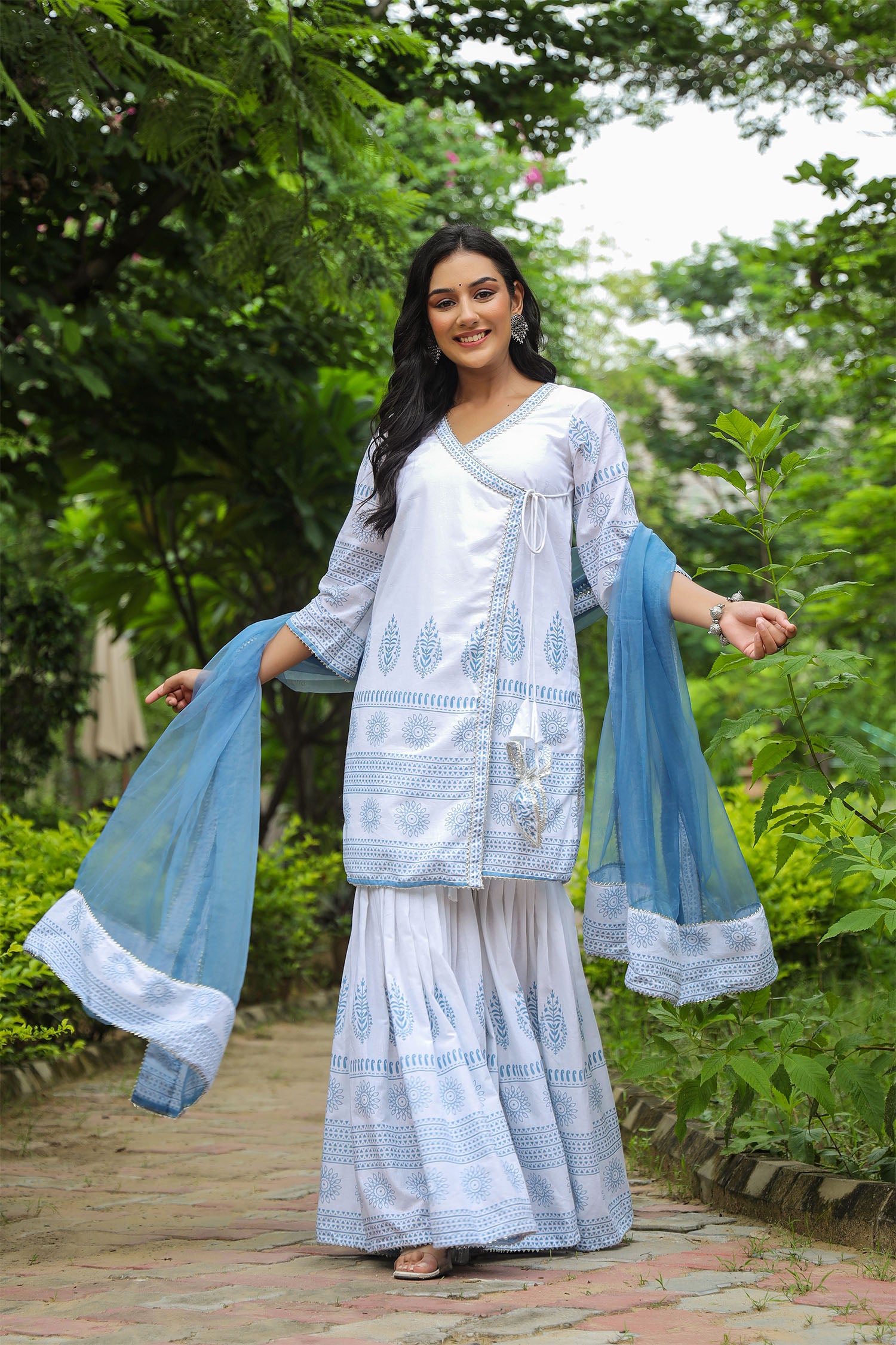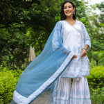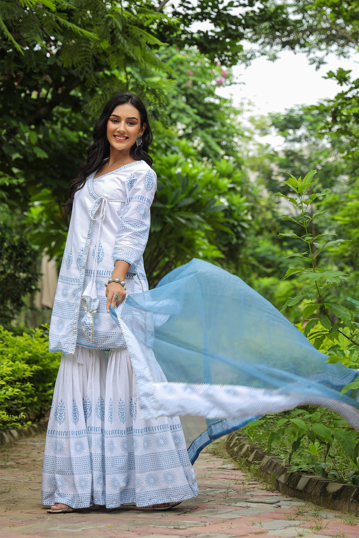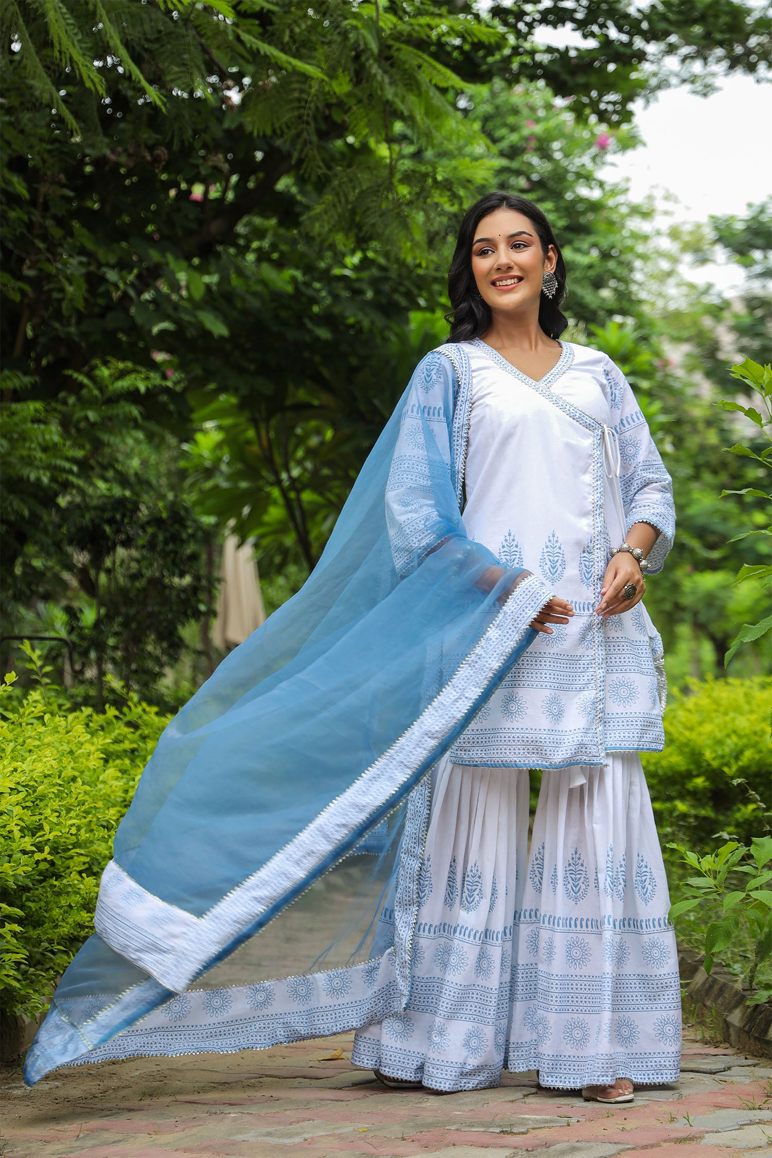The bluish white cotton printed sharara set with matching organza dupatta for a trendy look in style.