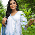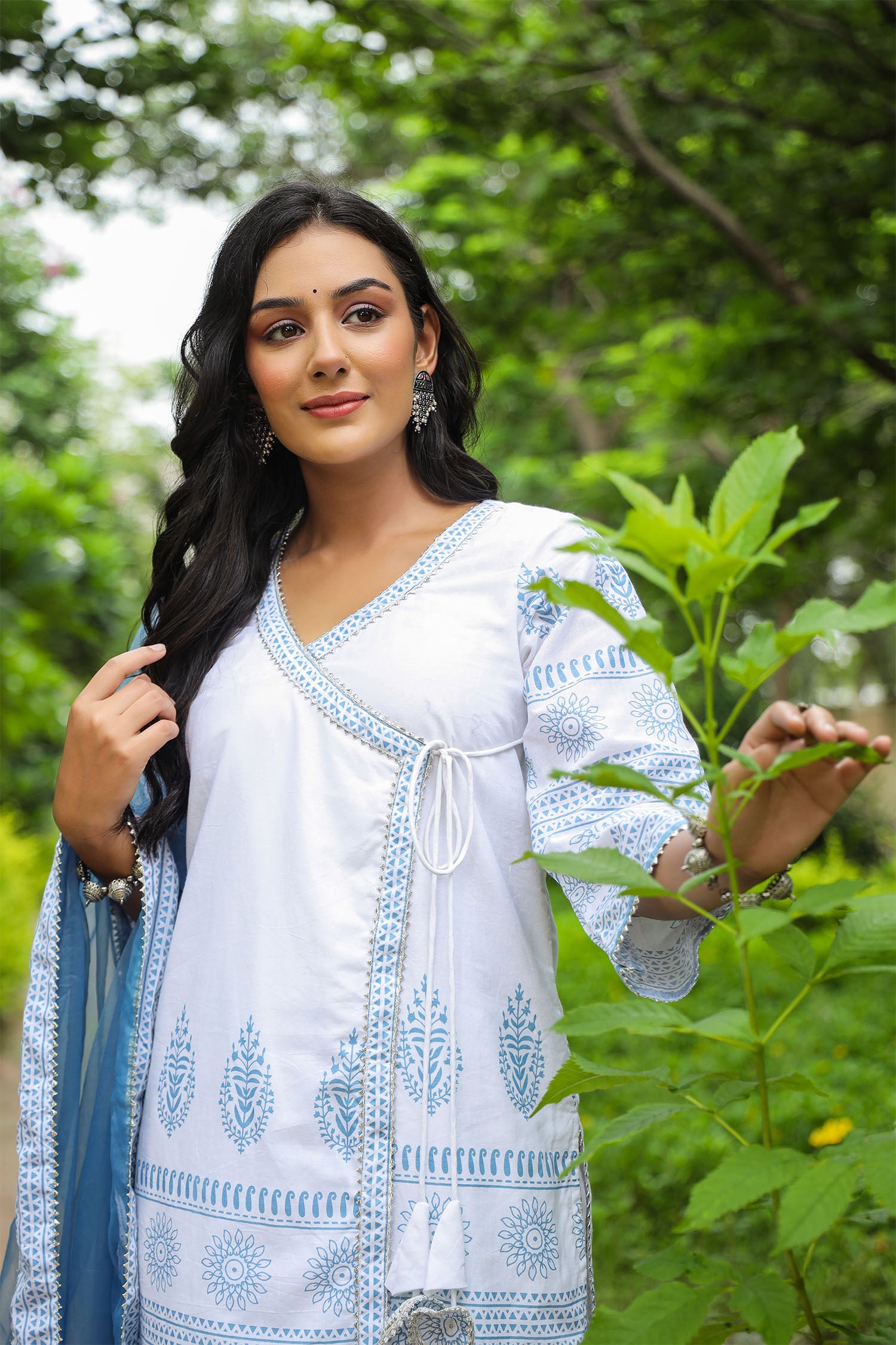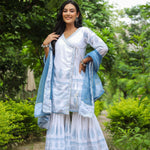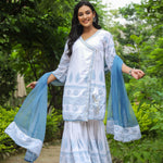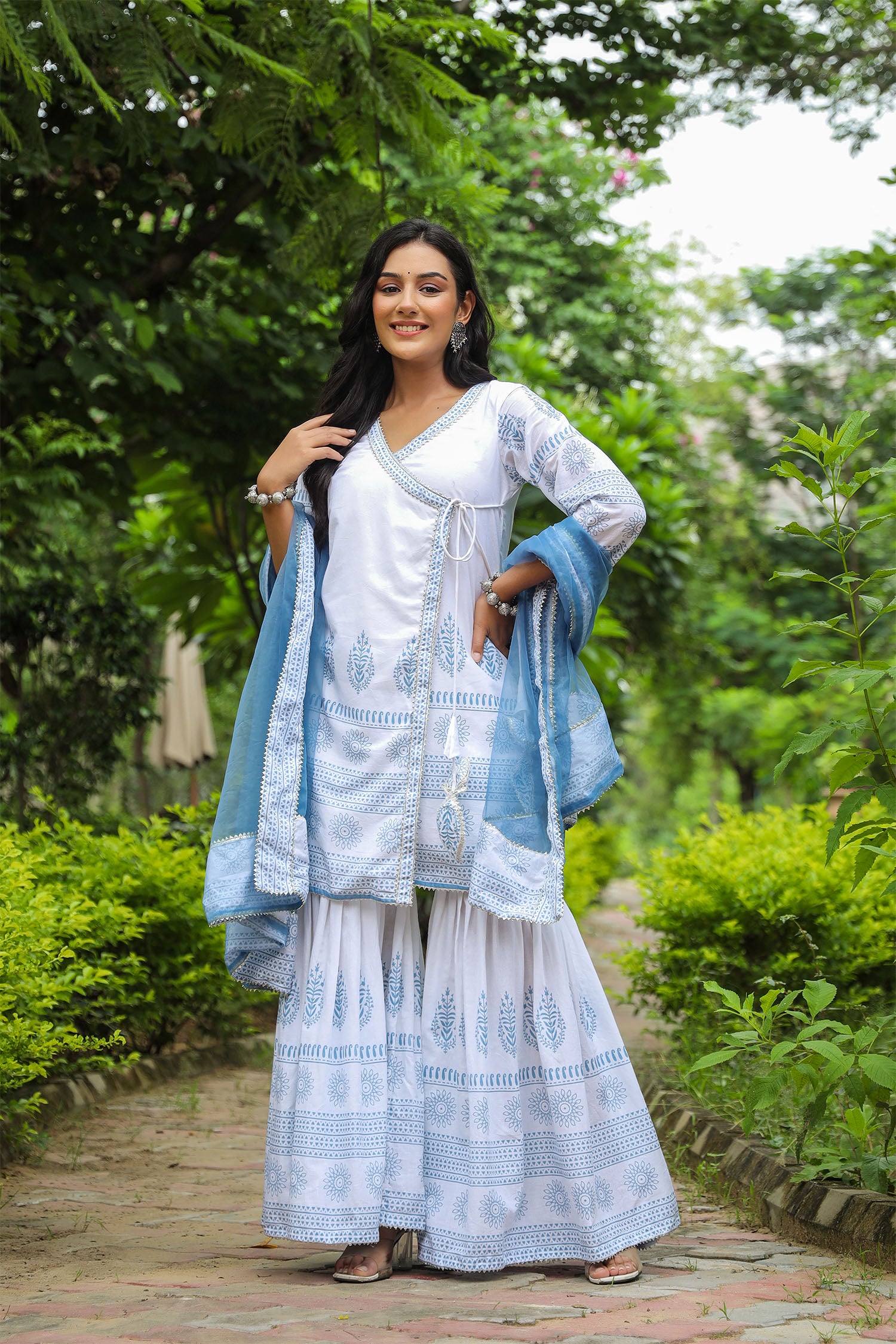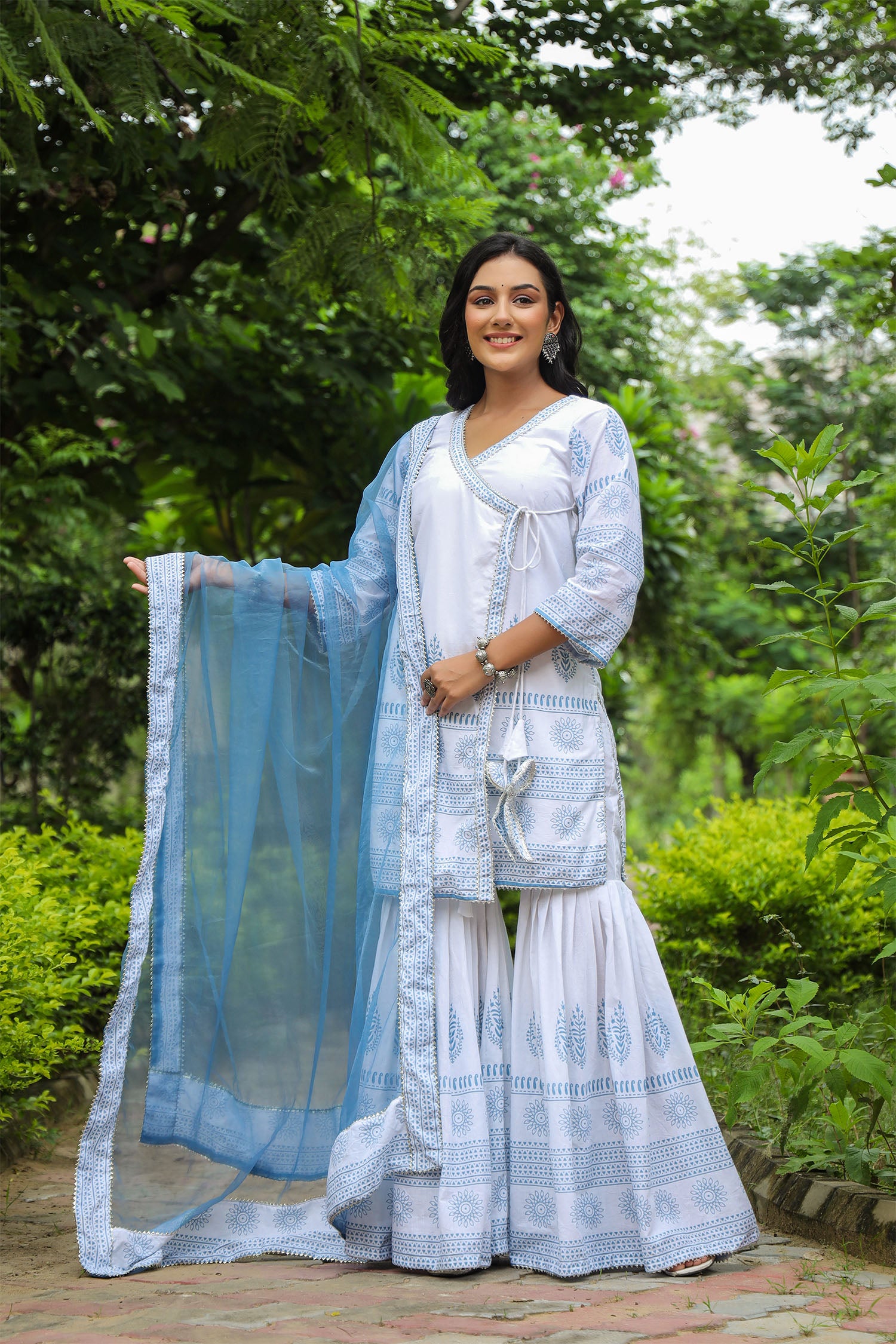 The bluish white cotton printed sharara set with matching organza dupatta for a trendy look in style.