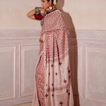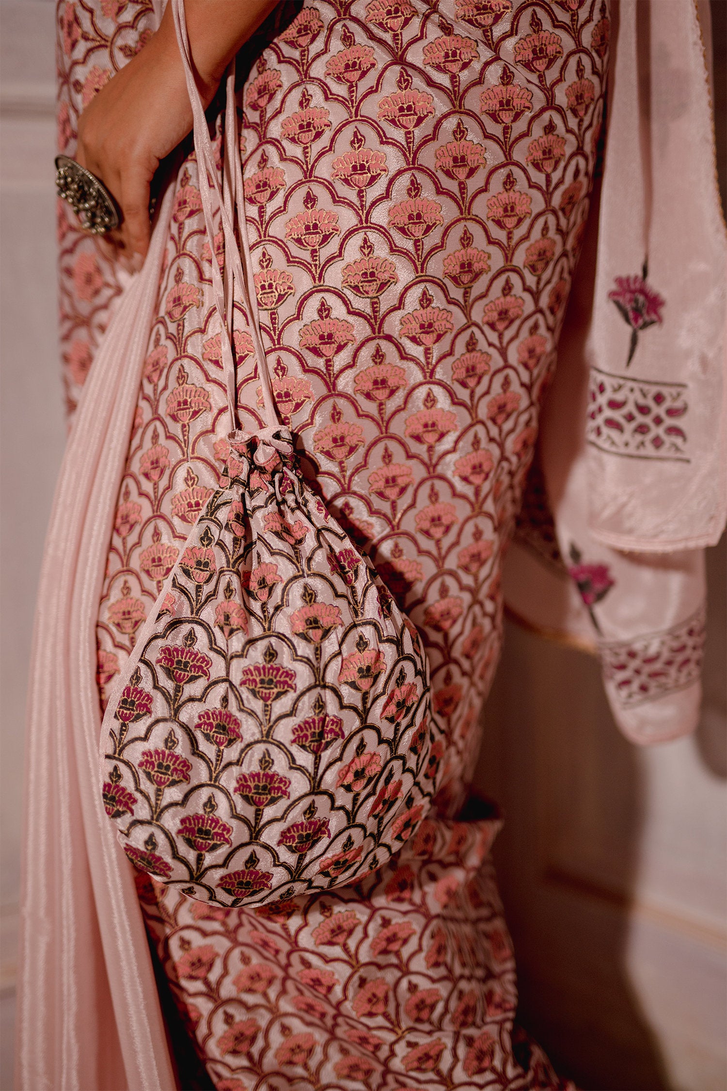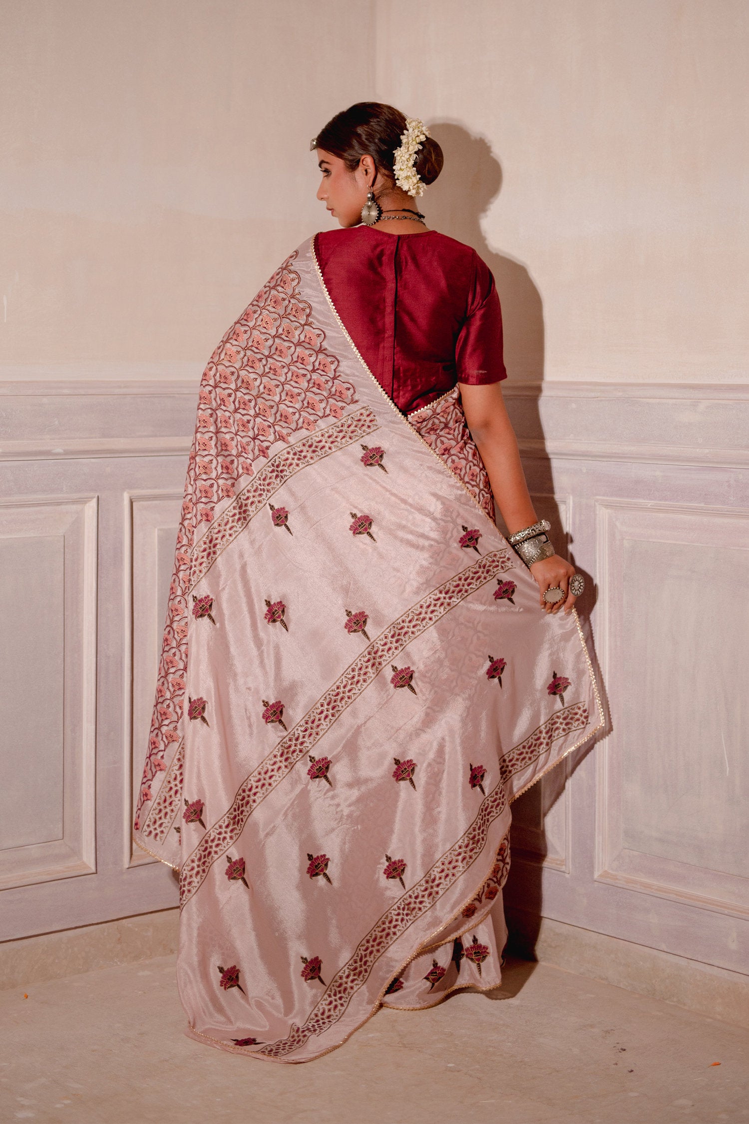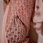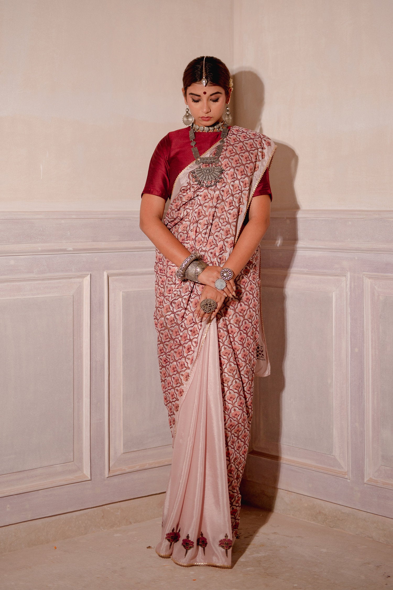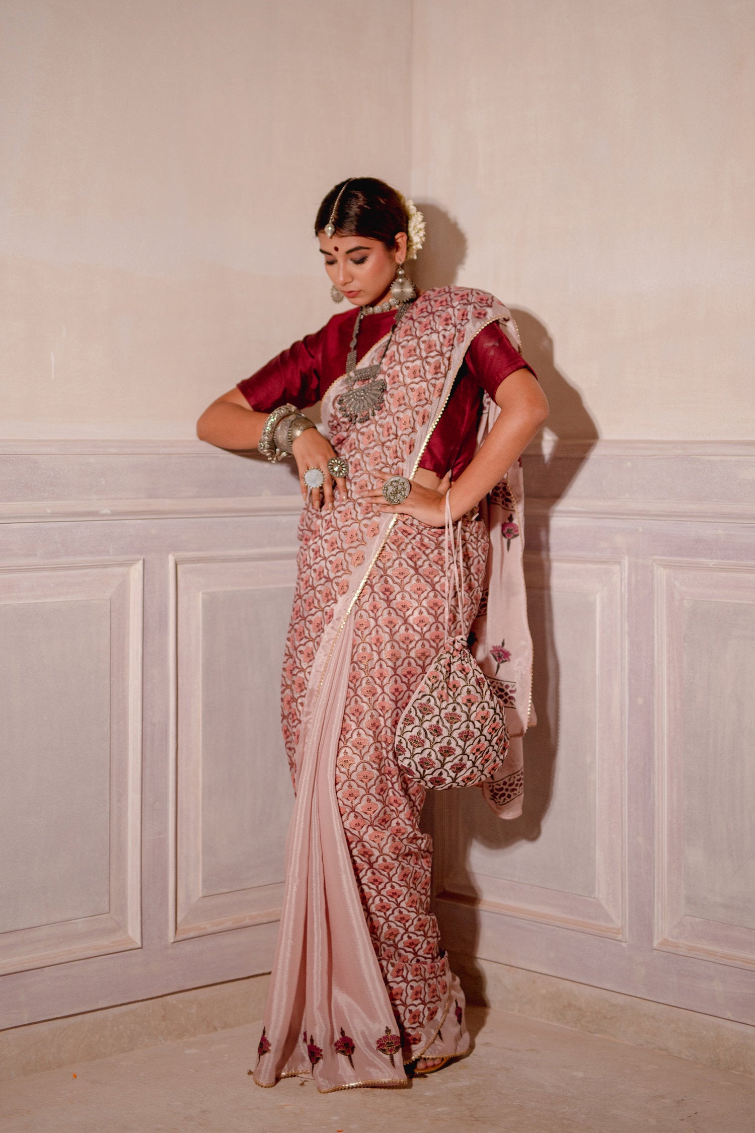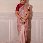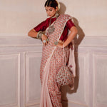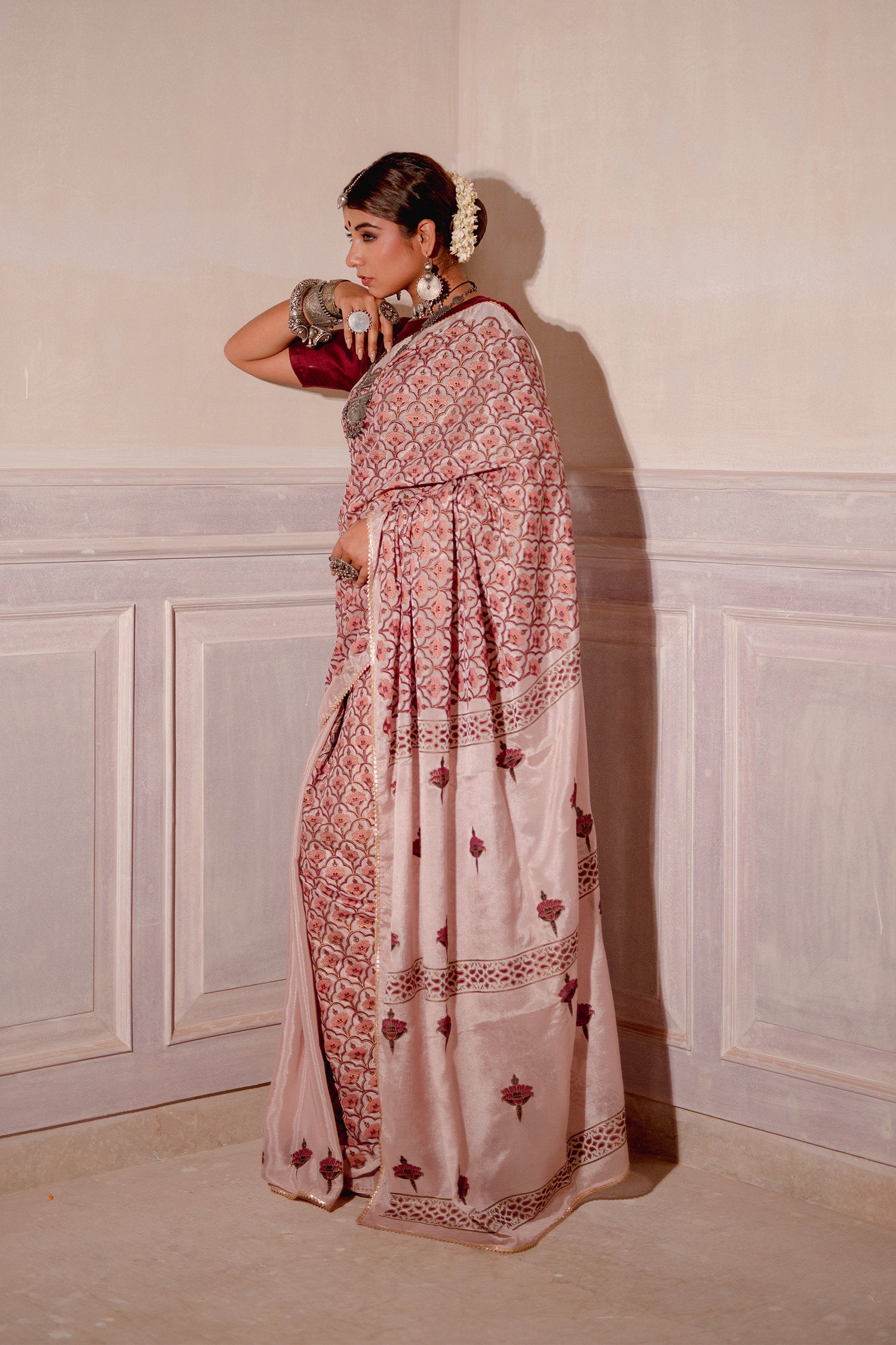 The blush pink hand blocked chinon saree set with chinon blouse for a beautiful look combined with style and tradition.