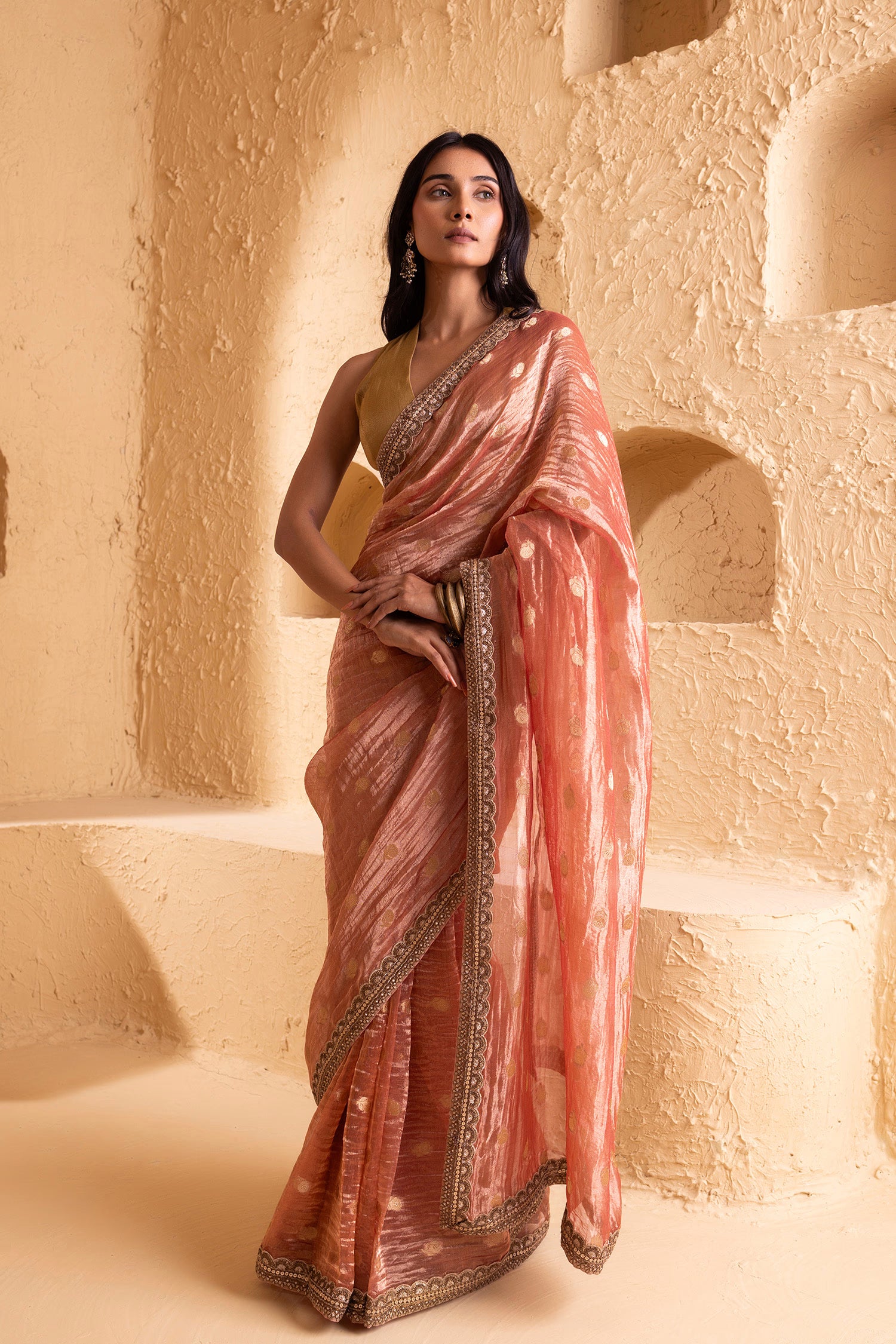 This sheen and delicate texture of the Blush pink has a border which is embellished with sequins forming a inward scallop design at border complemented with unstitched dupion silk blouse piece making it special for your special occasions .