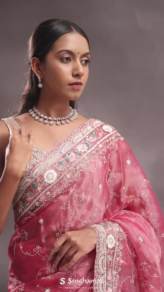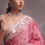 Blush Red Organza Embroidery Saree With Sequins And Pearls Work