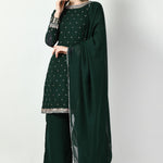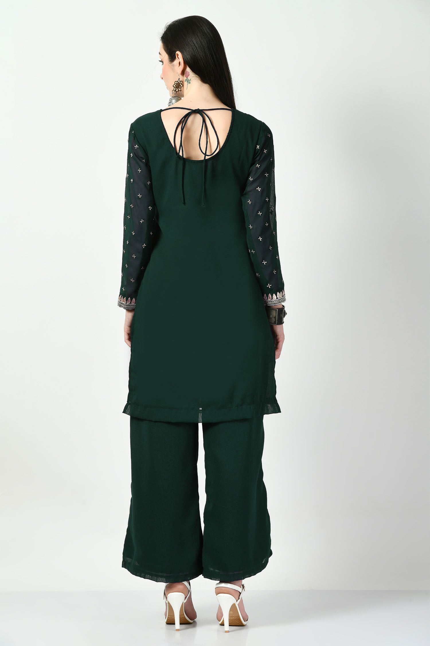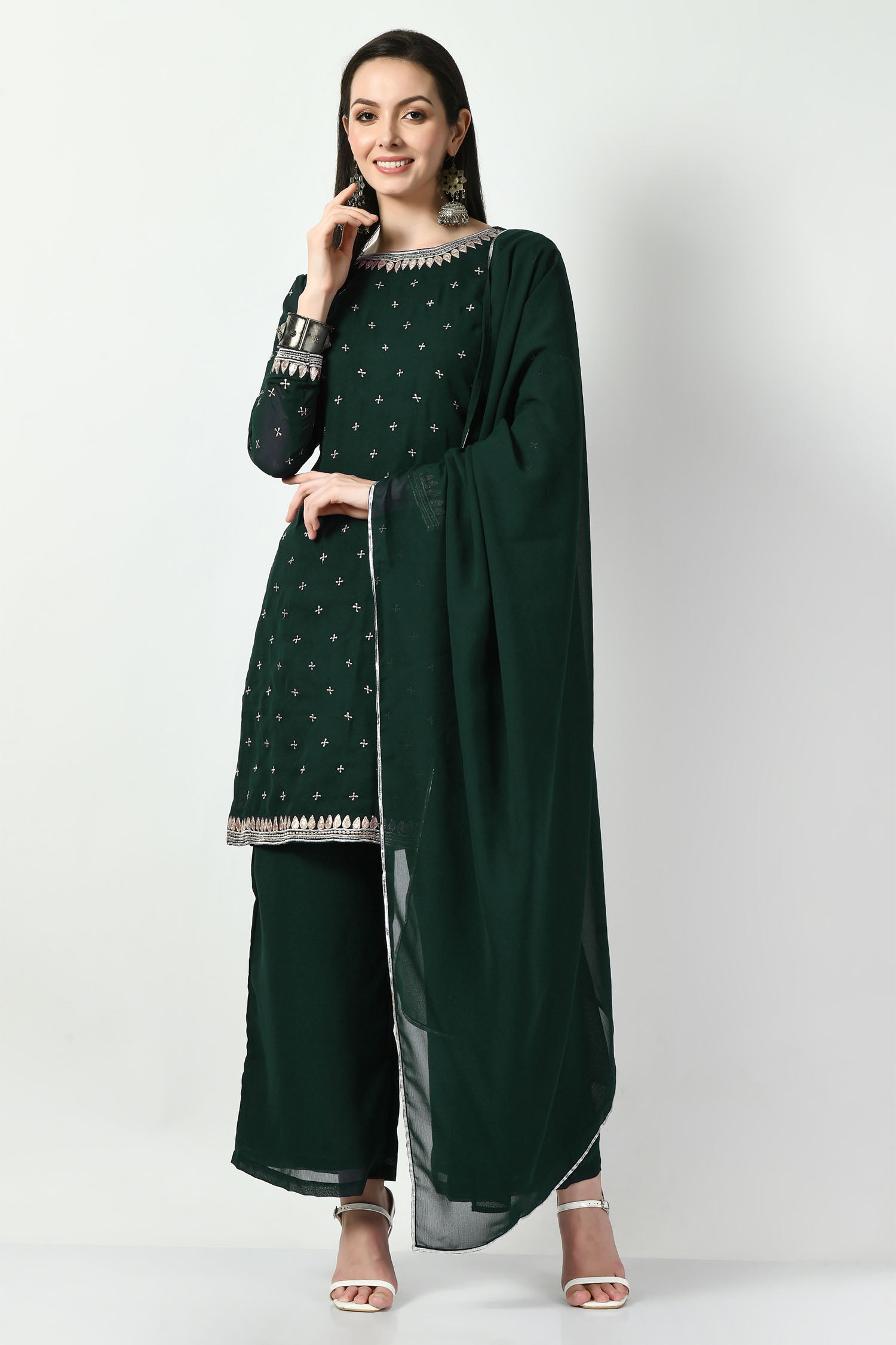 The bottle green georgette gota work kurti set with matching palazzo and dupatta for an elegant look combined with style and tradition.