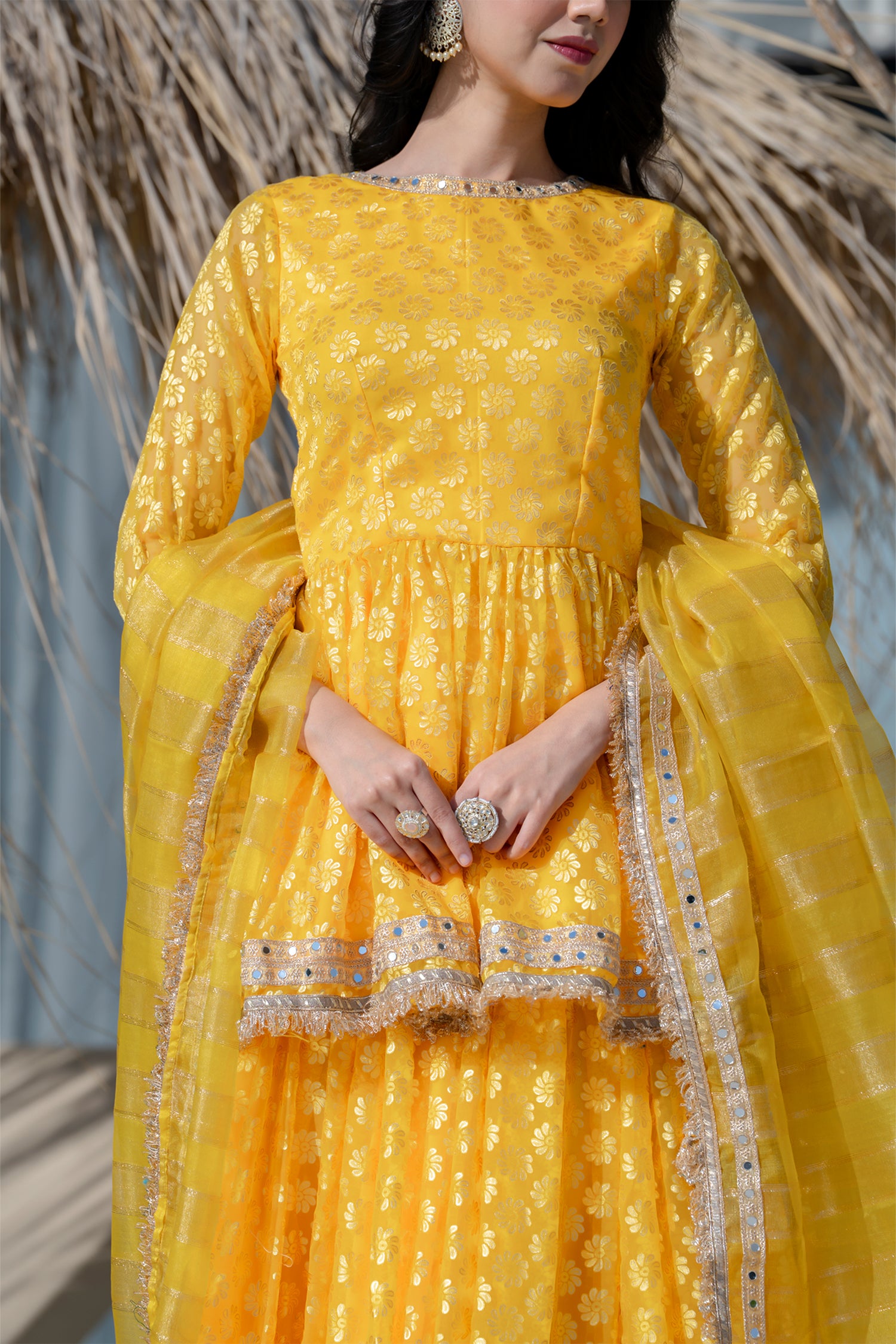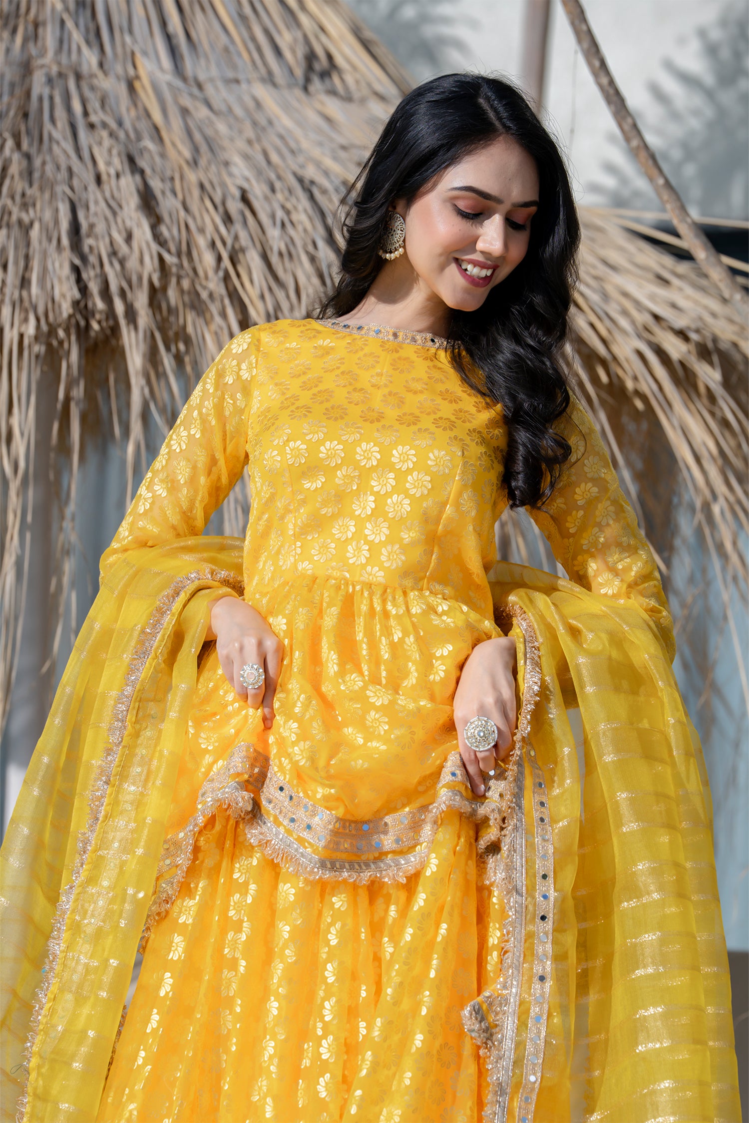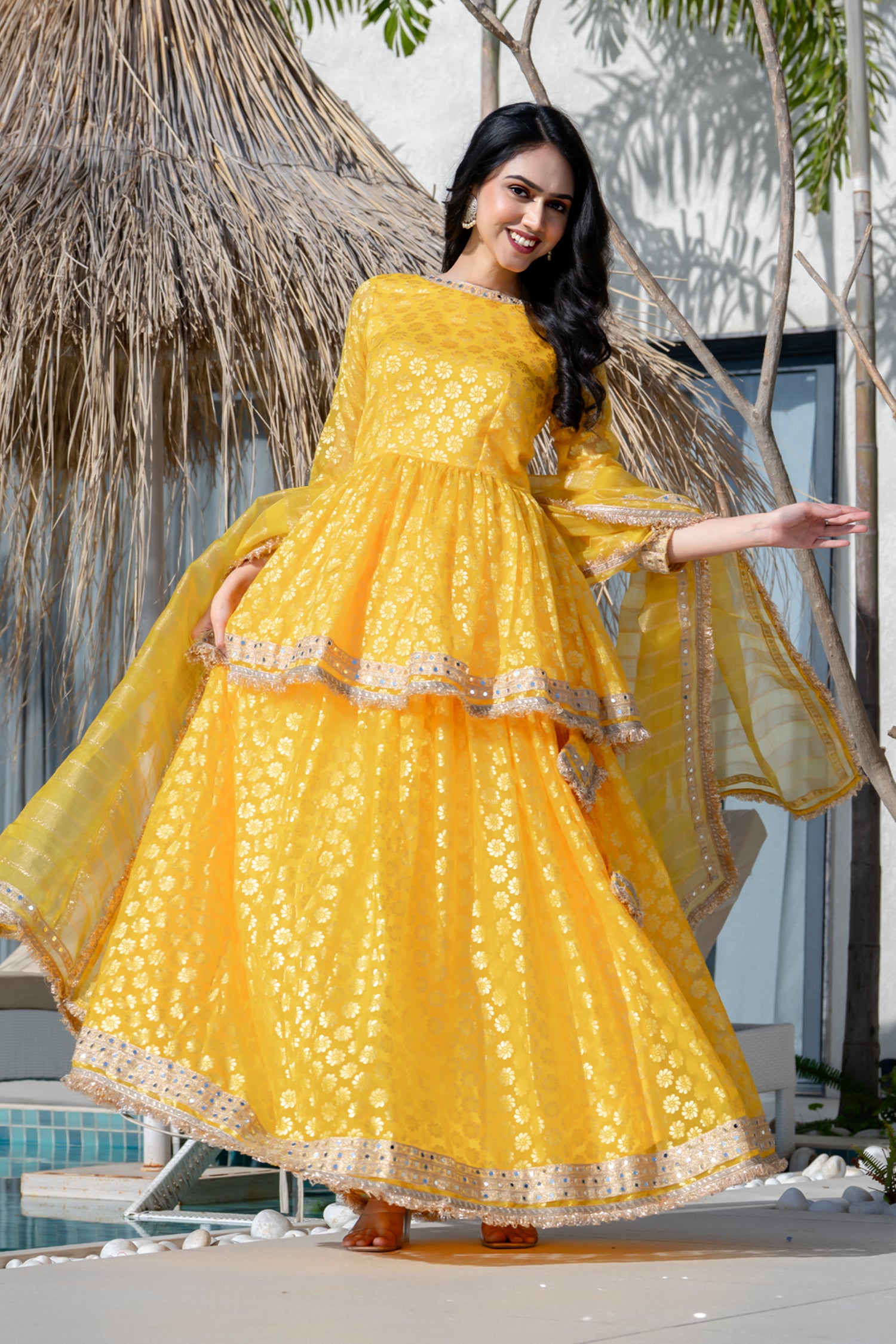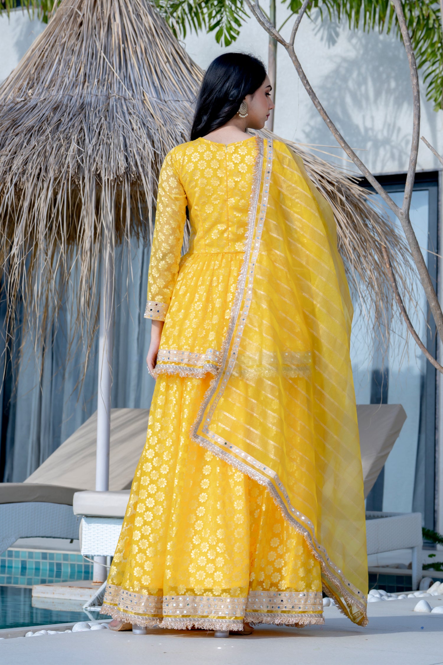 The bright yellow brasso printed skirt set with matching nylon organza dupatta combining tradition with style for a trendy and amazing look.