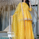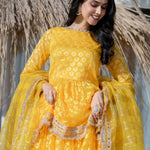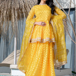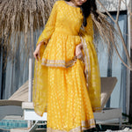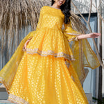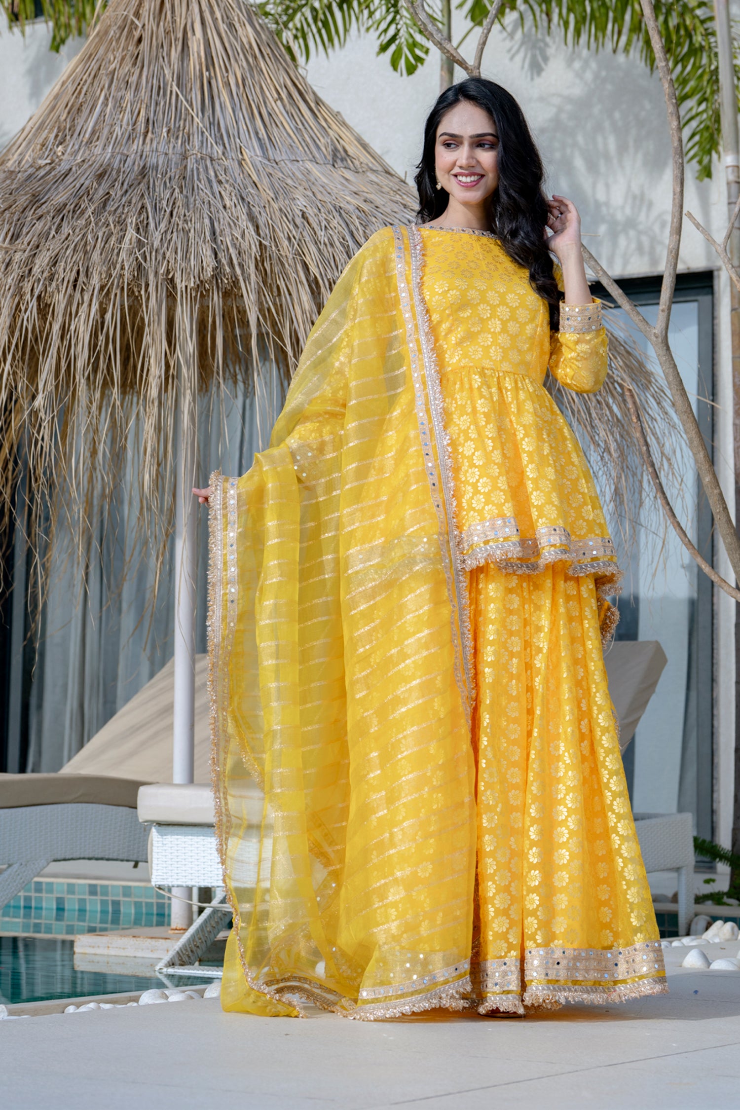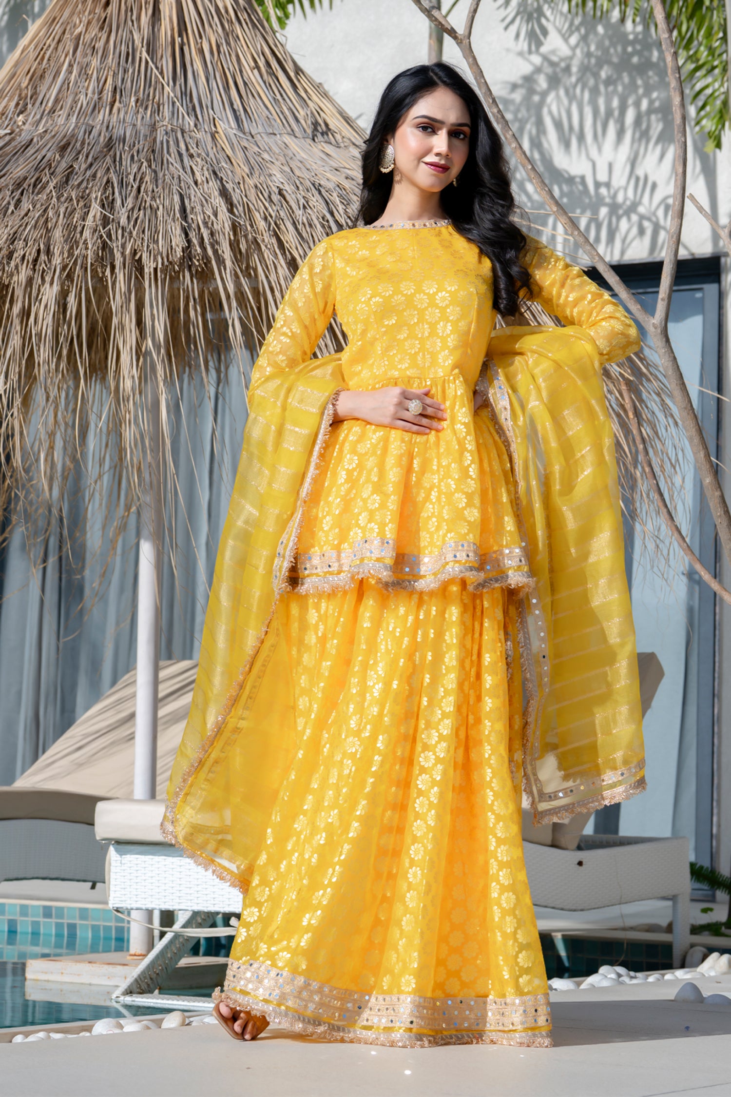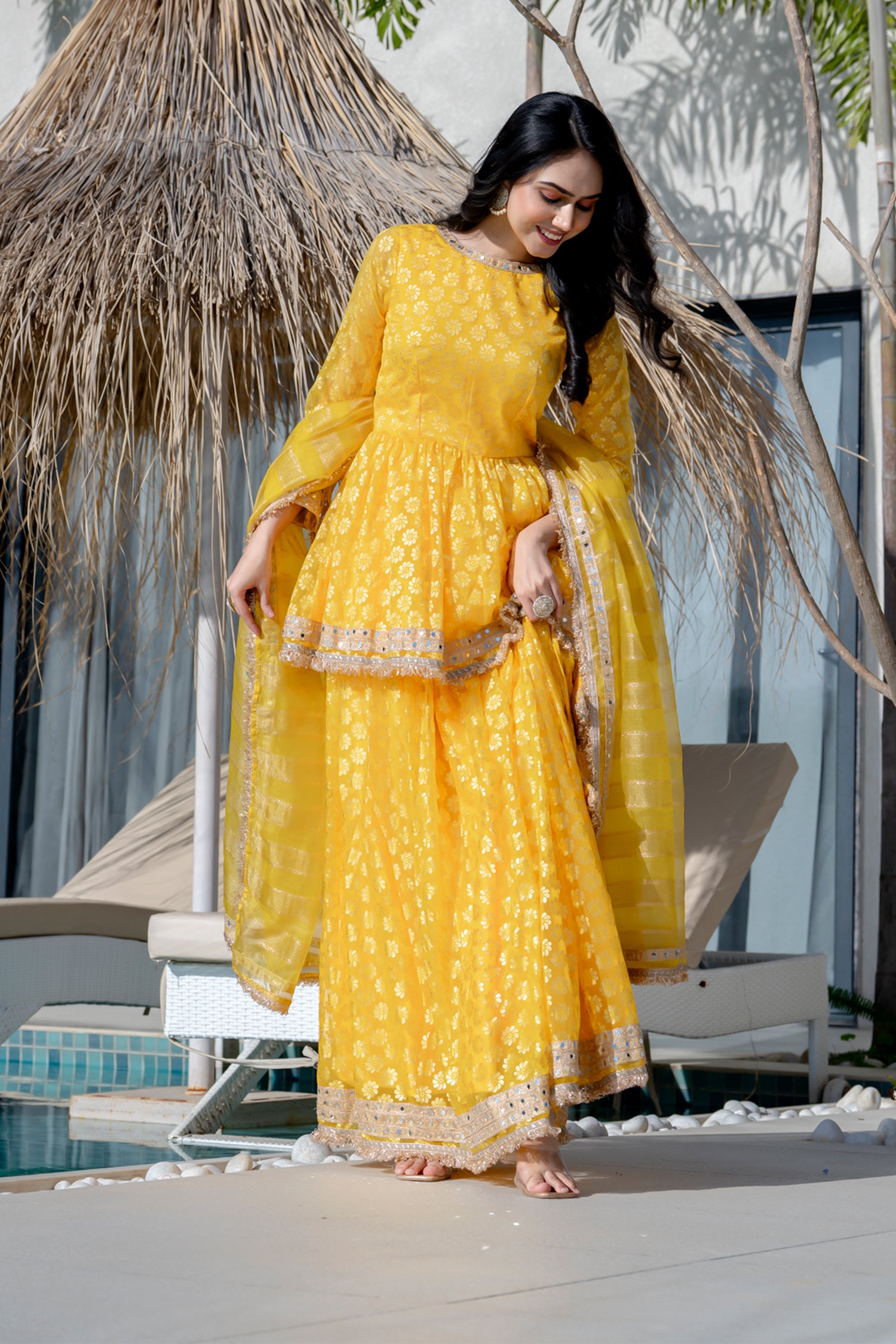 The bright yellow brasso printed skirt set with matching nylon organza dupatta combining tradition with style for a trendy and amazing look.