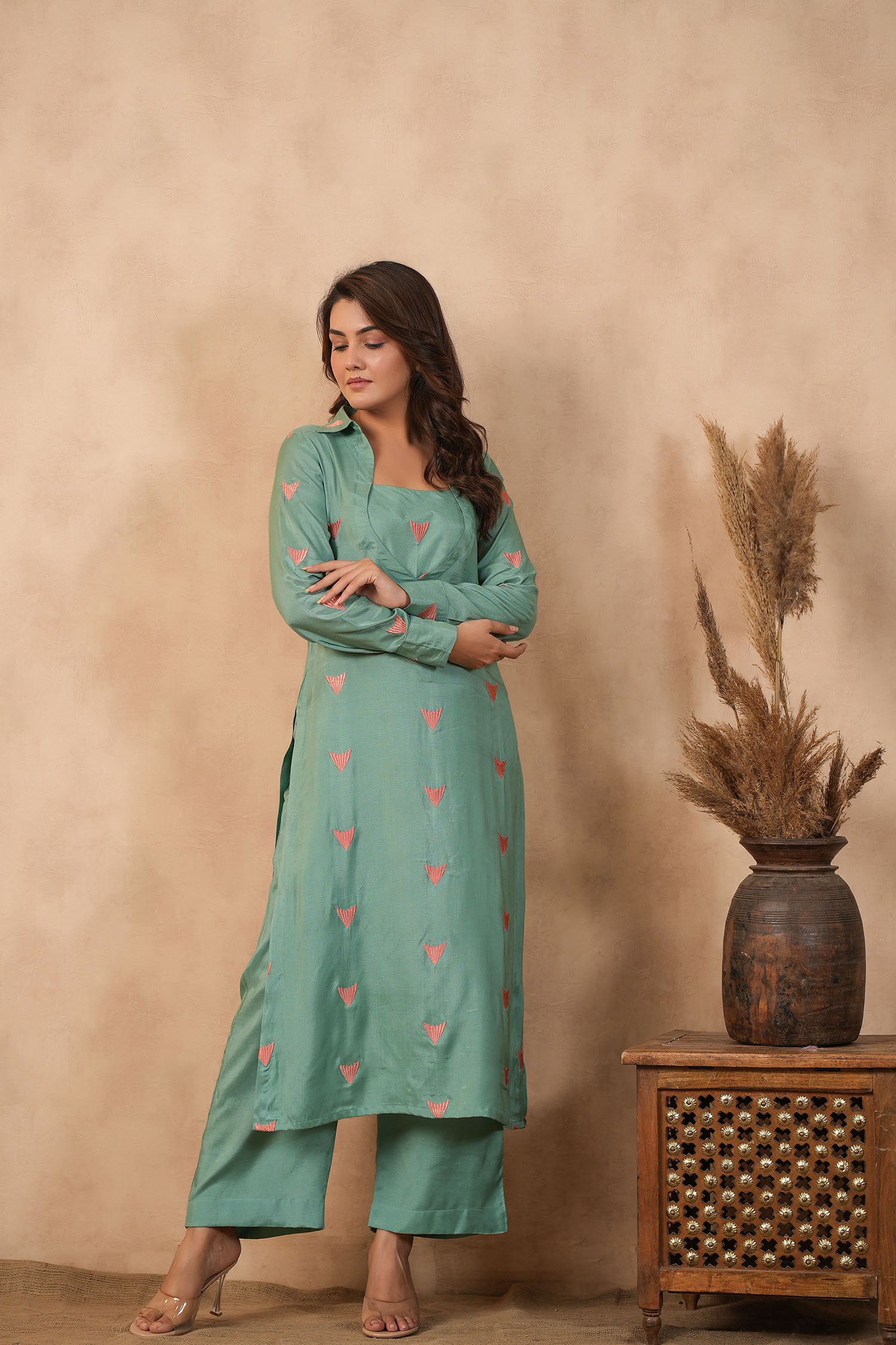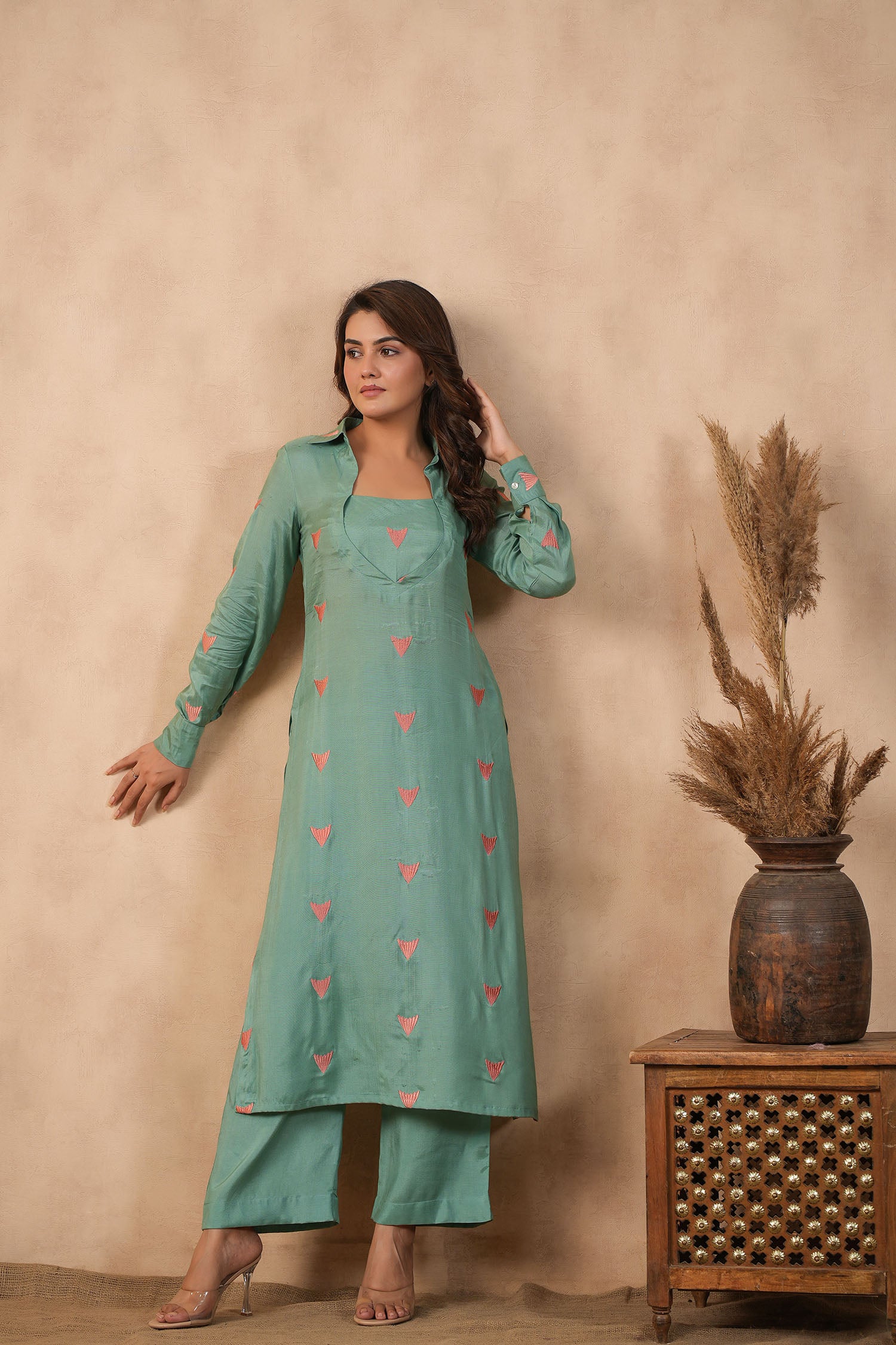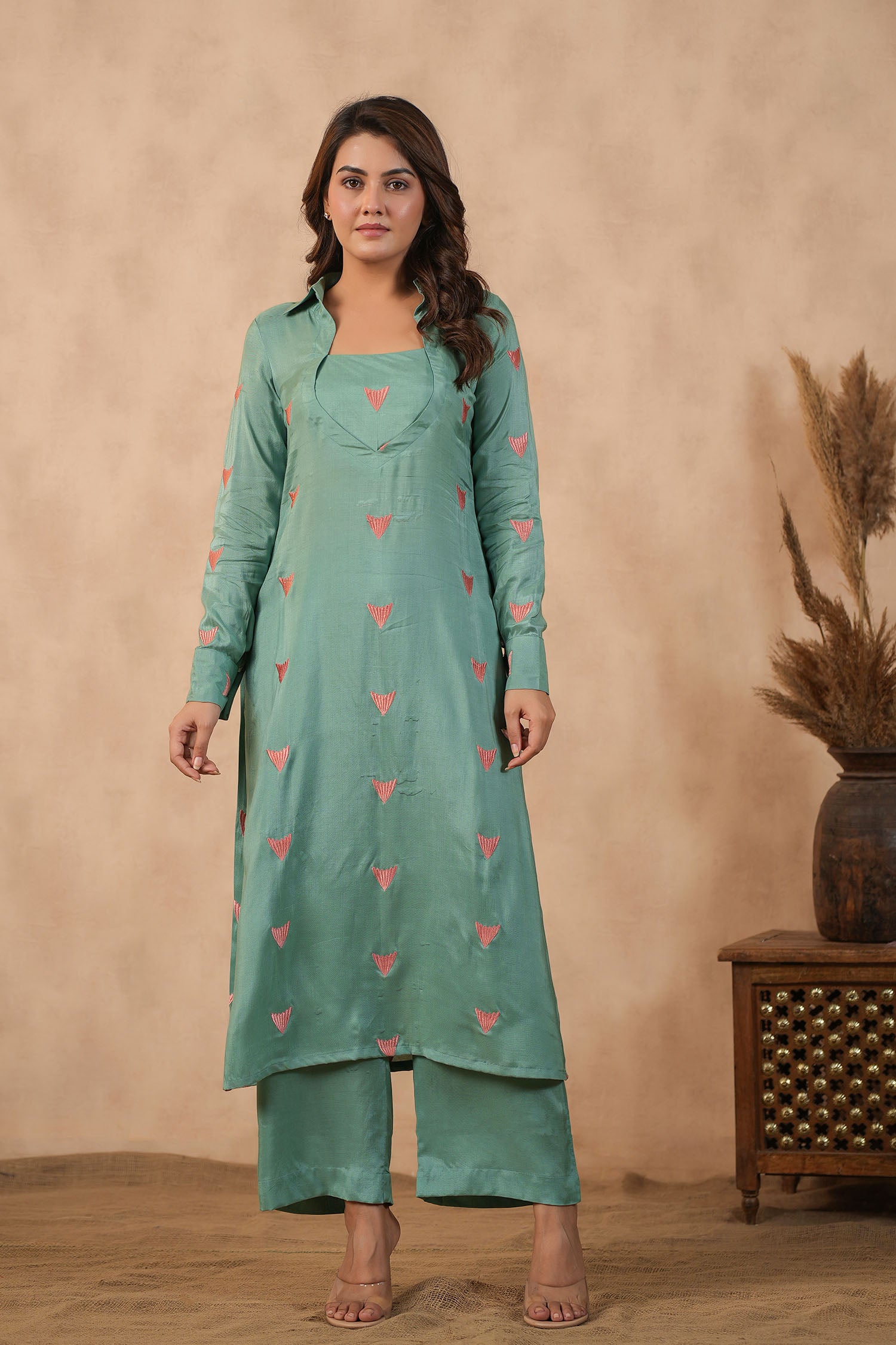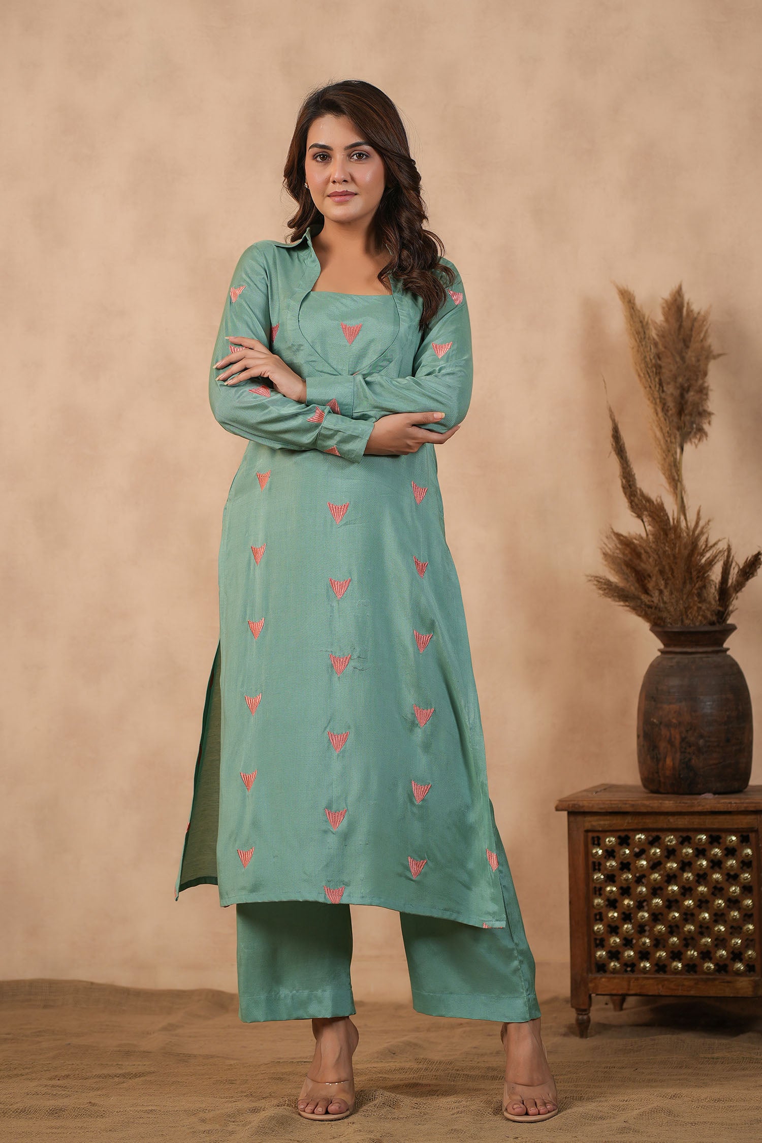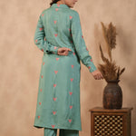 The beautiful bright persian green santoon embroidered kurti set with matching pants for an elegant and charming look with neat finish.