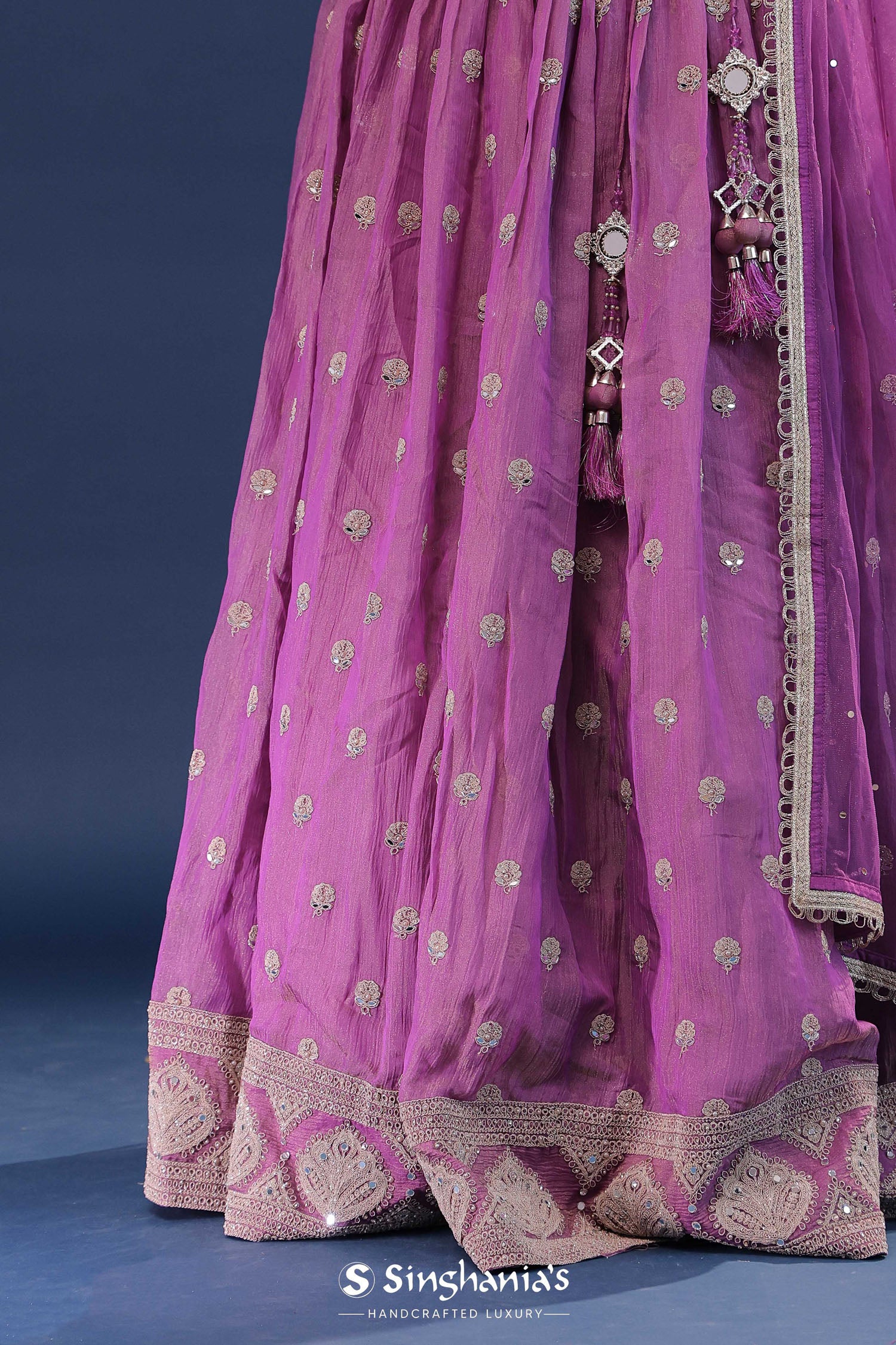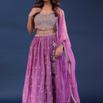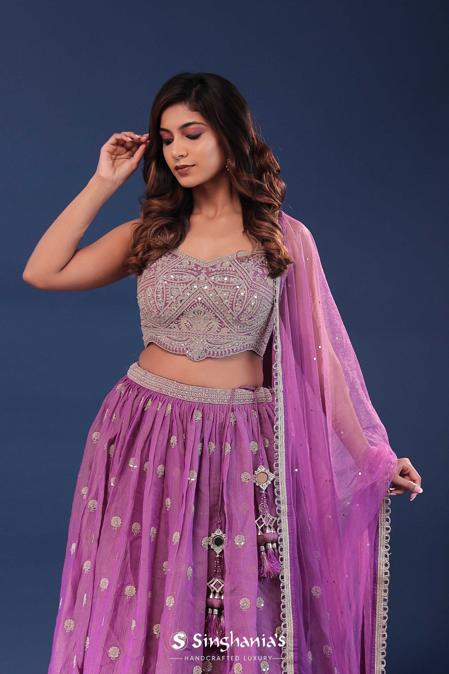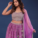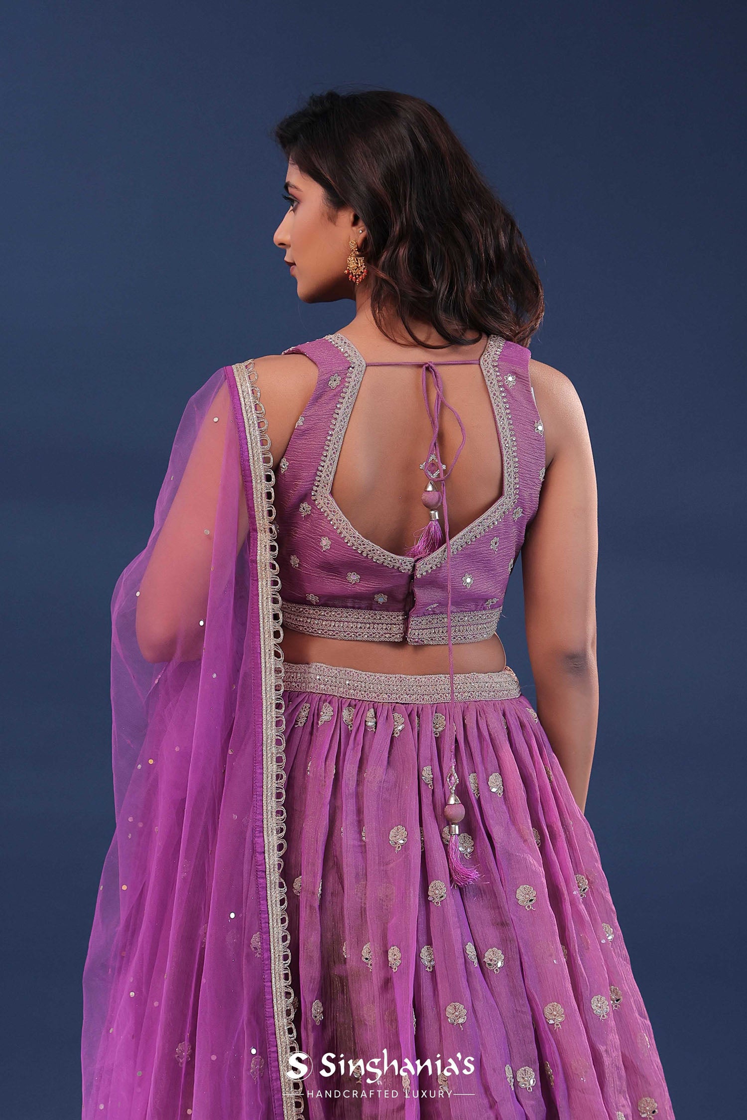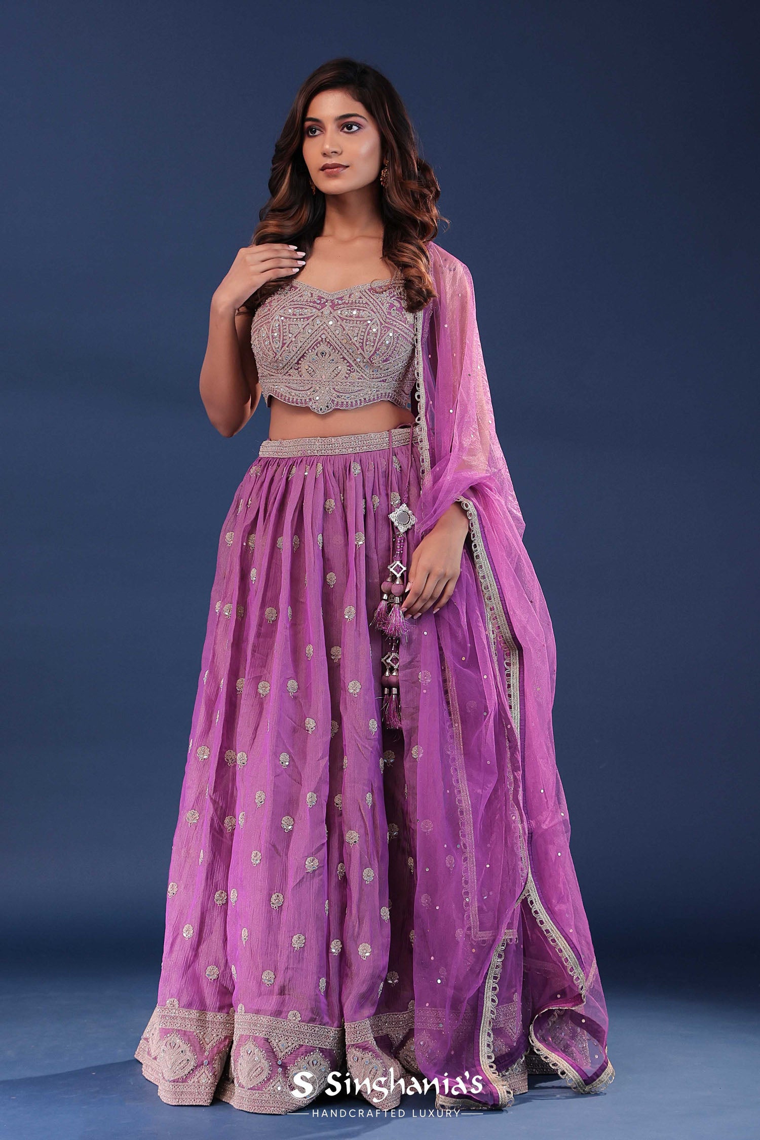 Bright purple organza lehenga set features soft silk blouse embellished with unique embroidery and very subtle mirror work along with floral embroidery butti's on organza lehenga. The netted dupatta with mirror work at the border adds the finishing touch to the entire garment.