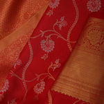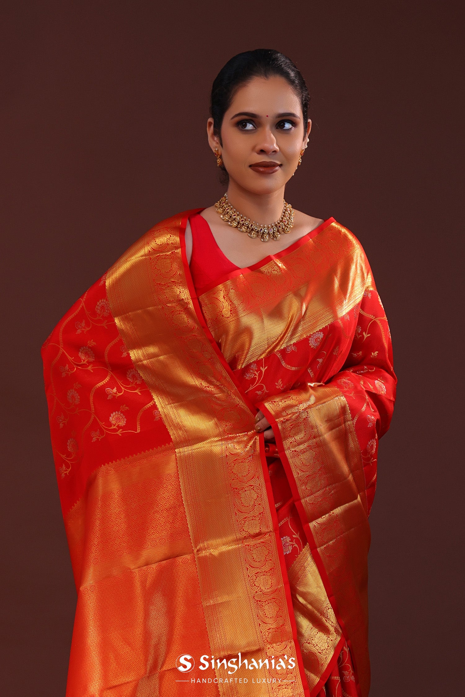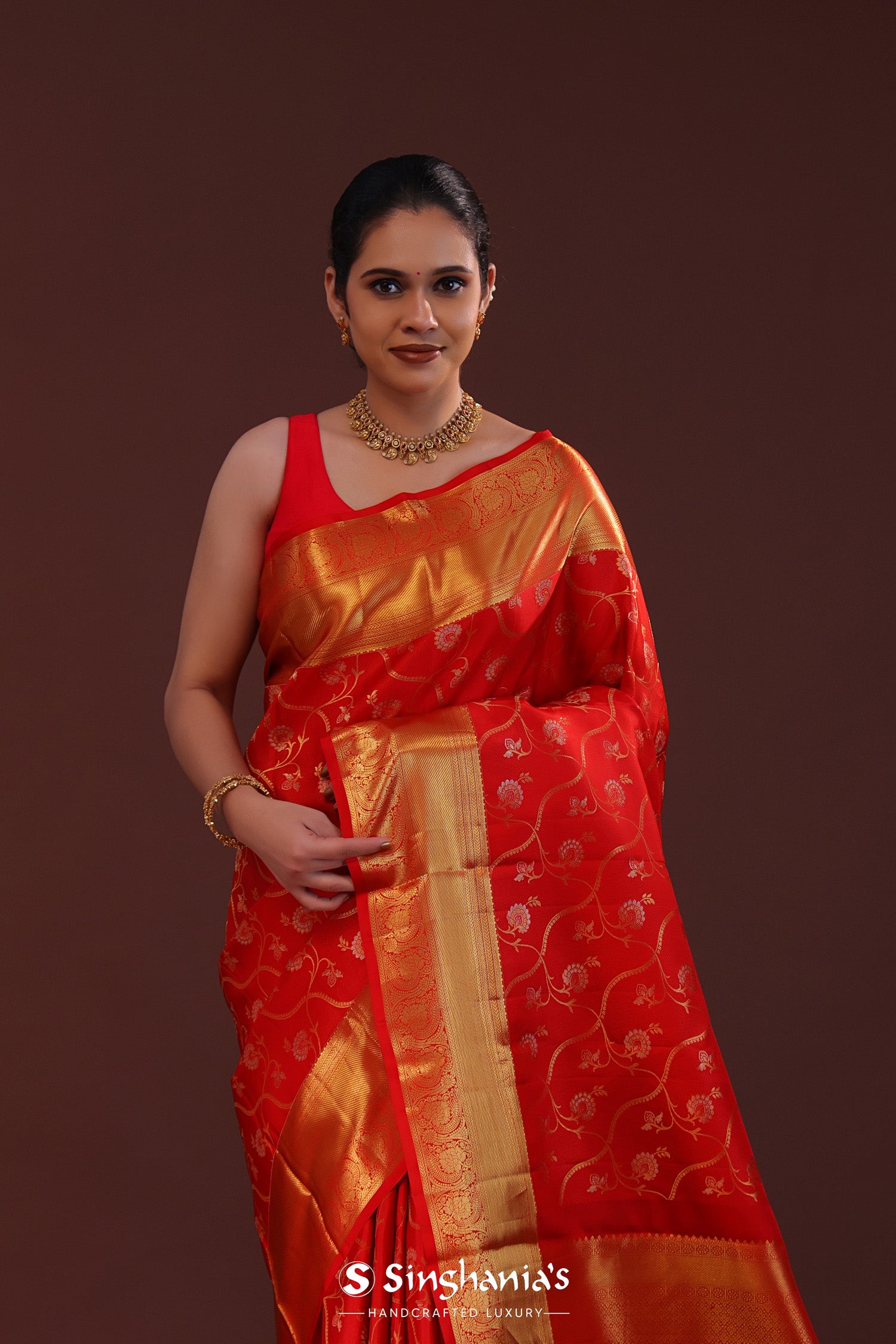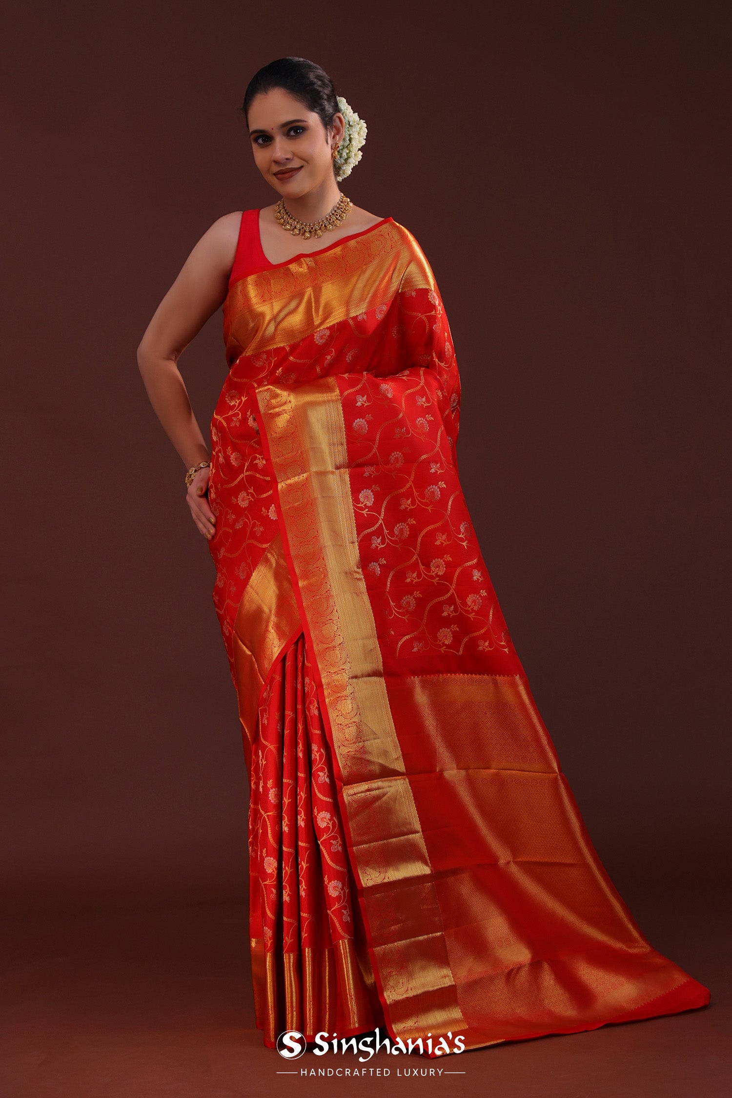 Bright Red Kanjivaram Silk Saree With Floral Jaal