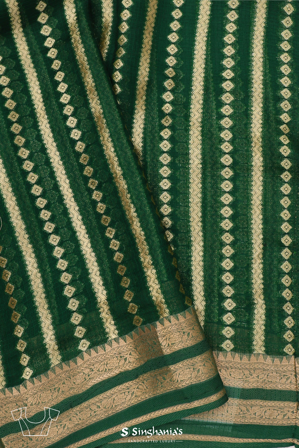 This is a bright red kota banarasi silk saree for festive, wedding occasions and party wear. Adorned with meenakari & gold zari floral jaal weaving, all over the body and a contrasting green small border, completing the whole look.