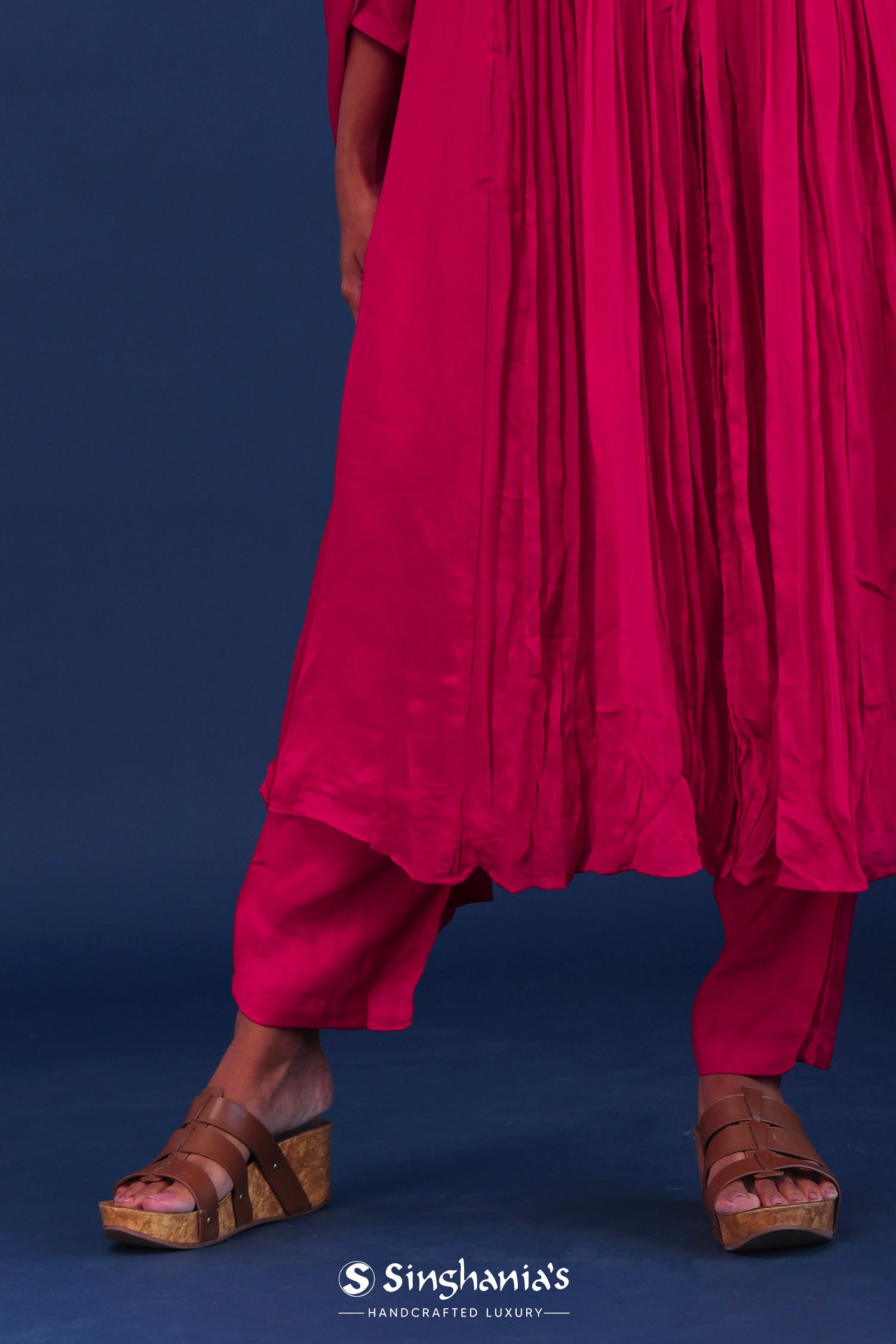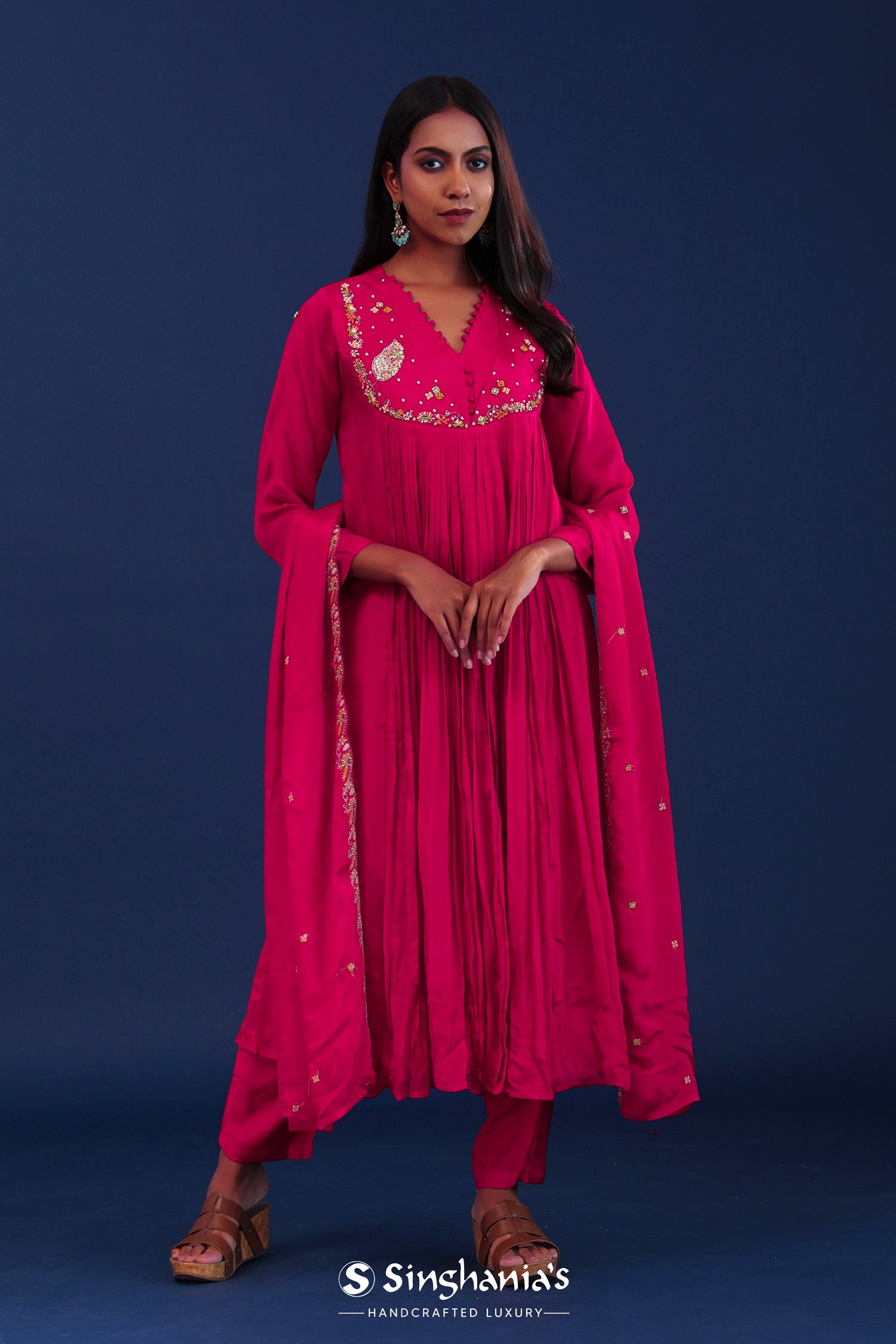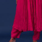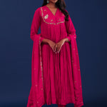 The bright royal pink chiffon thread work kurti set with raw silk bottom and matching dupatta for a gracious look with elegance.