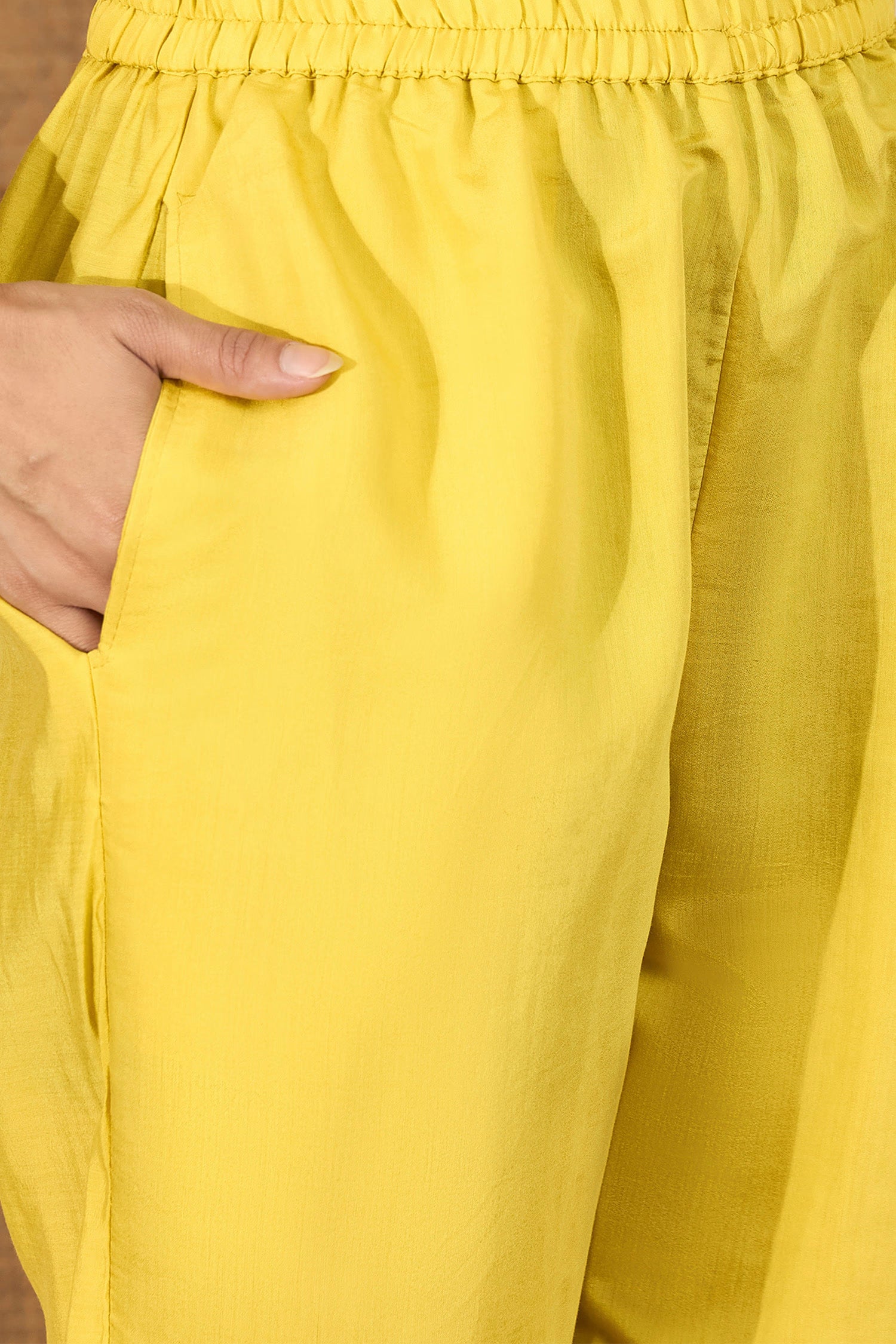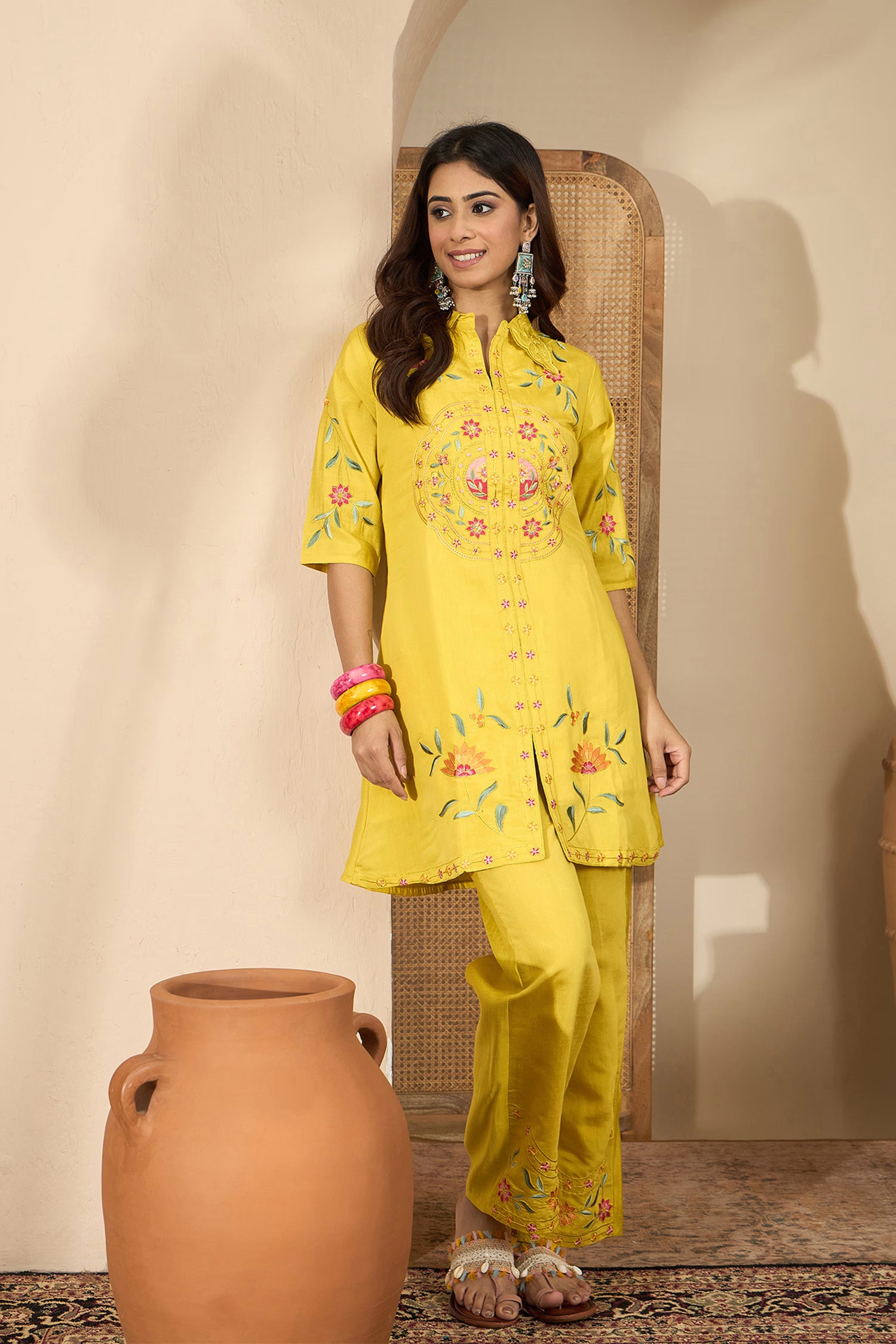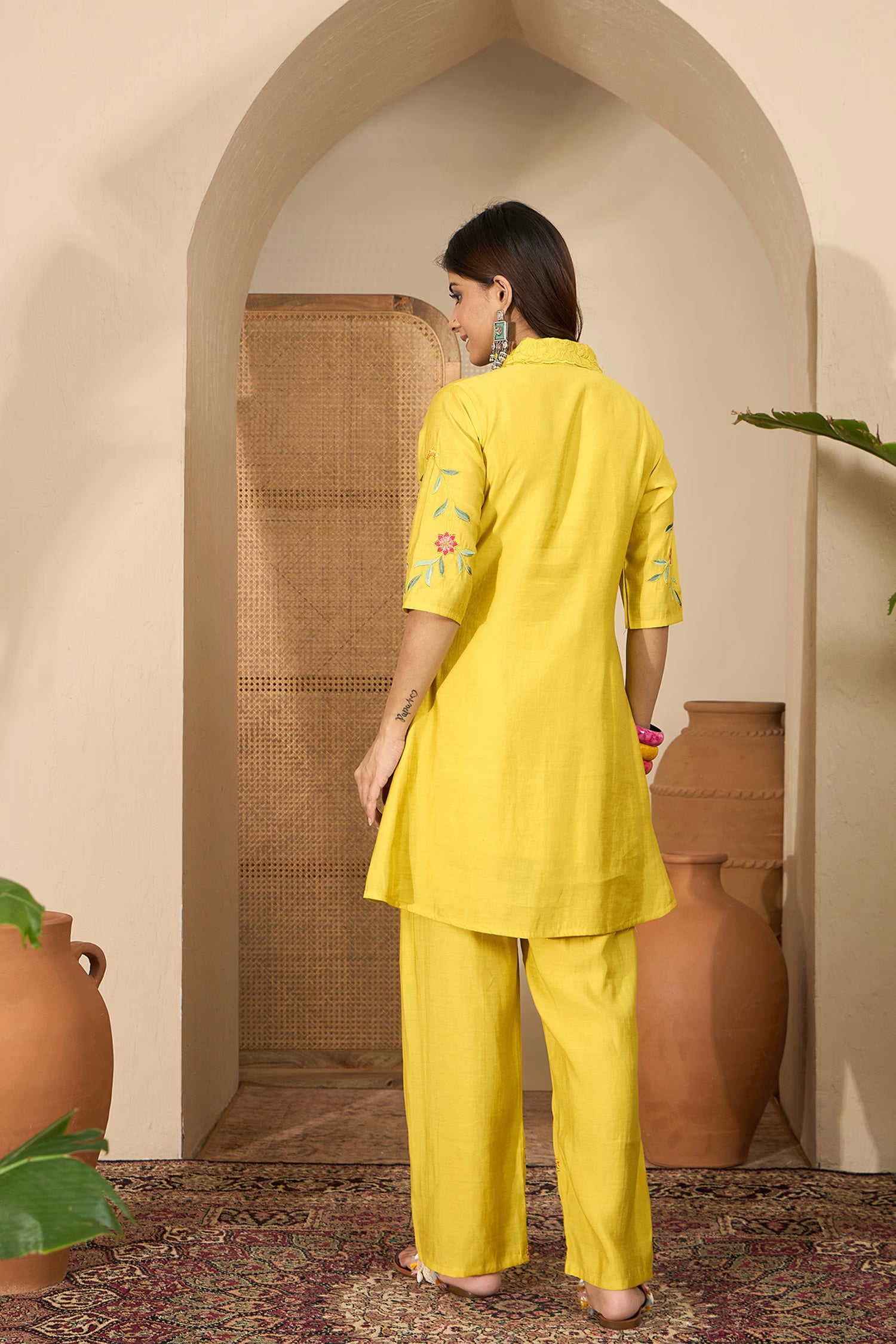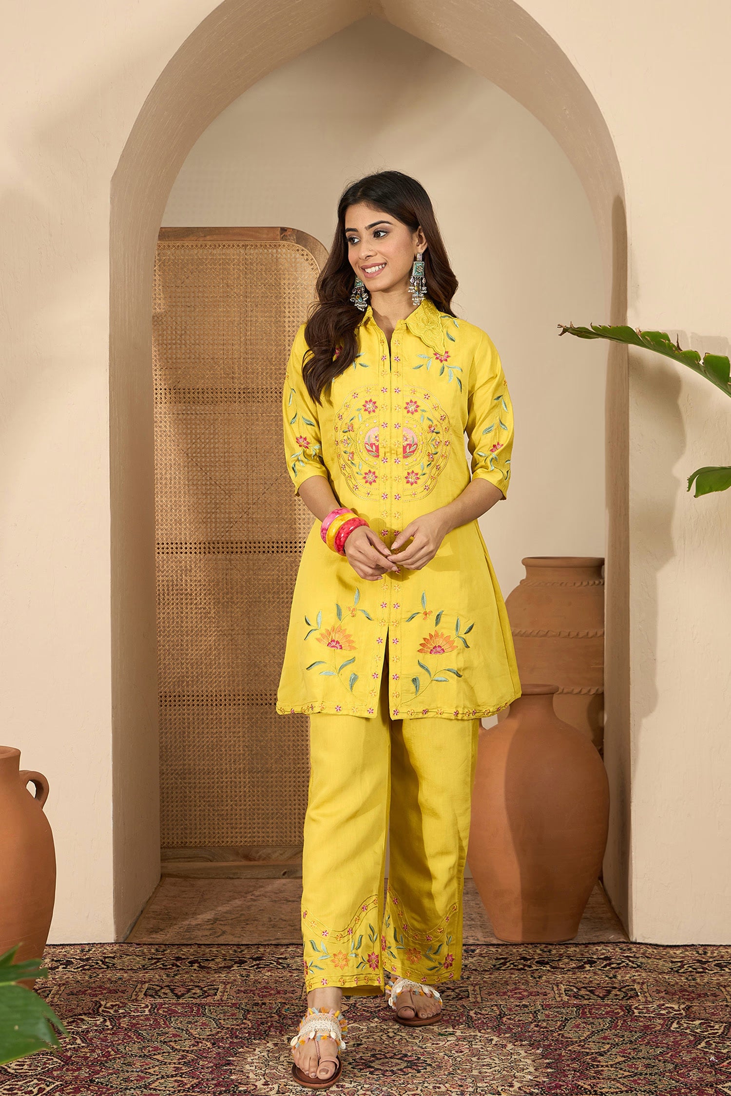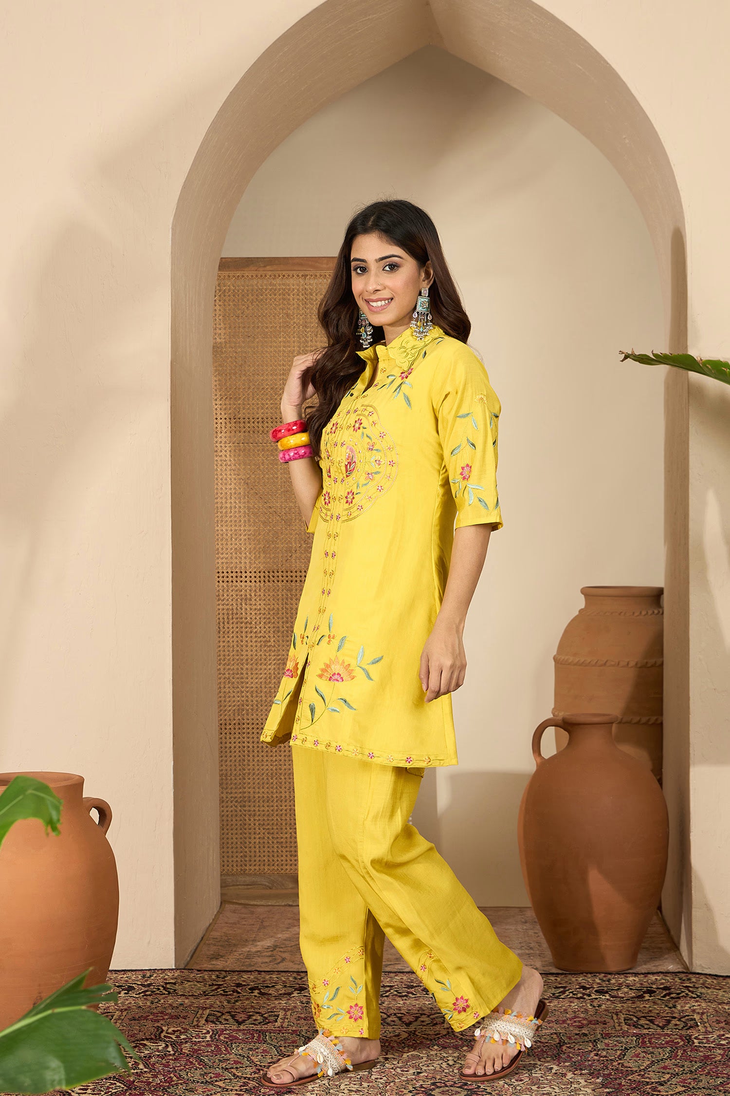 The modern bright yellow floral thread embroidered polyester co-ord set with matching top and bottom for a stylish way of dressing.