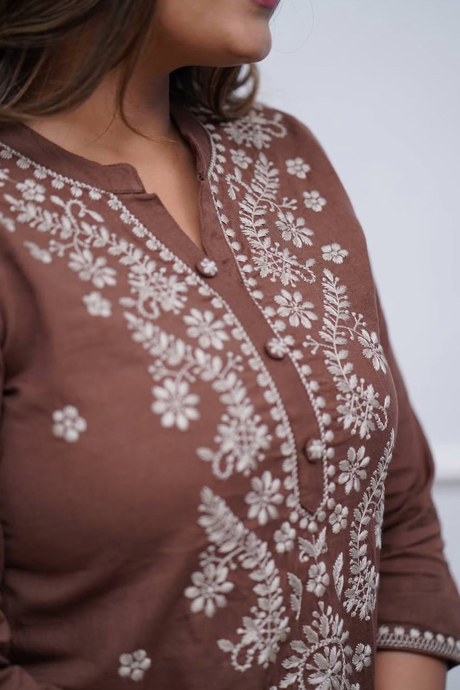 The brown rayon thread embroidered kurta set with floral embroidered short kurta and a matching pant for modern way of dressing with ethnic touch.