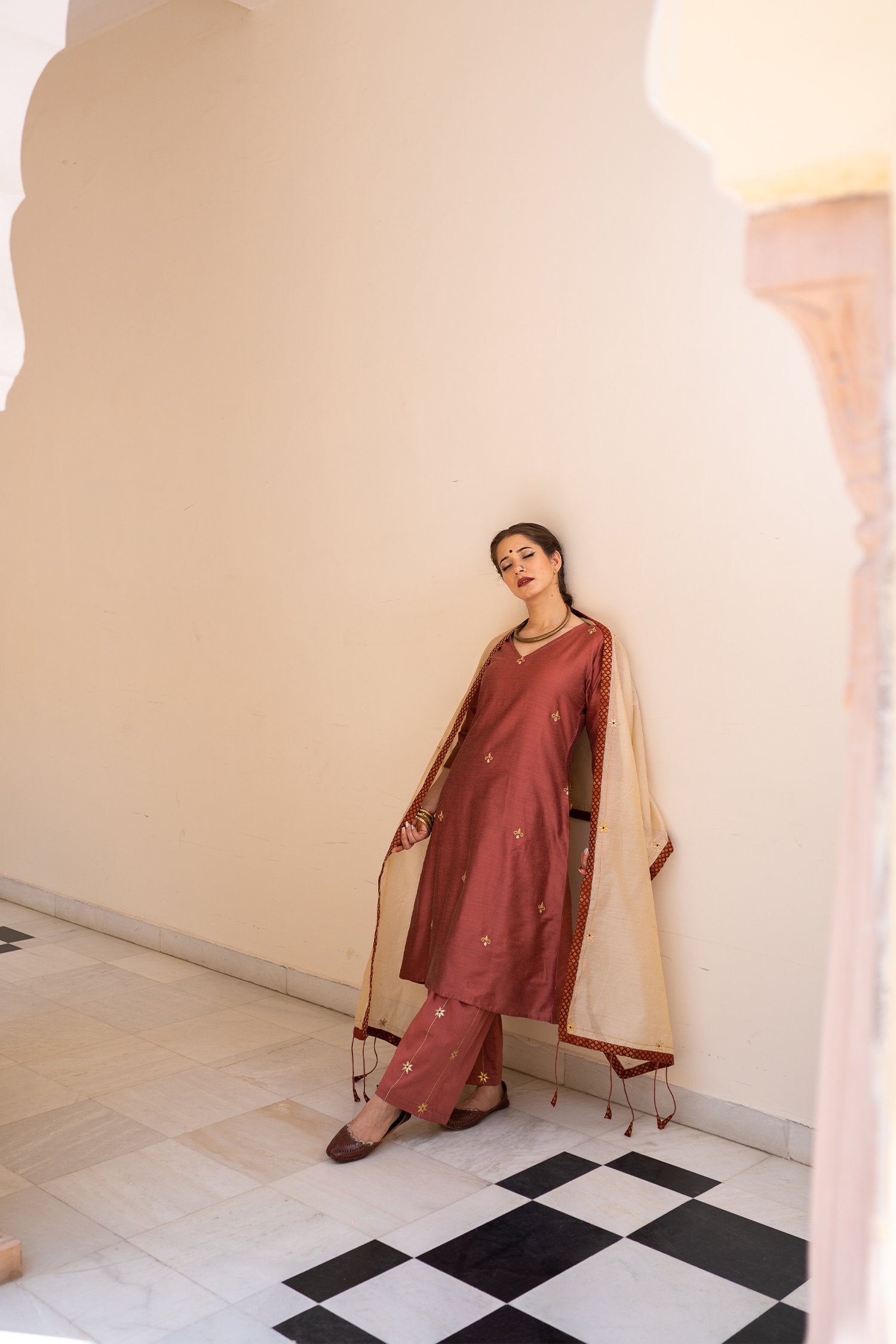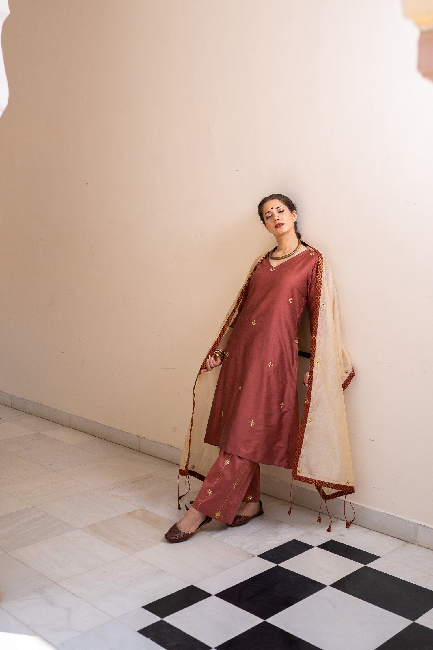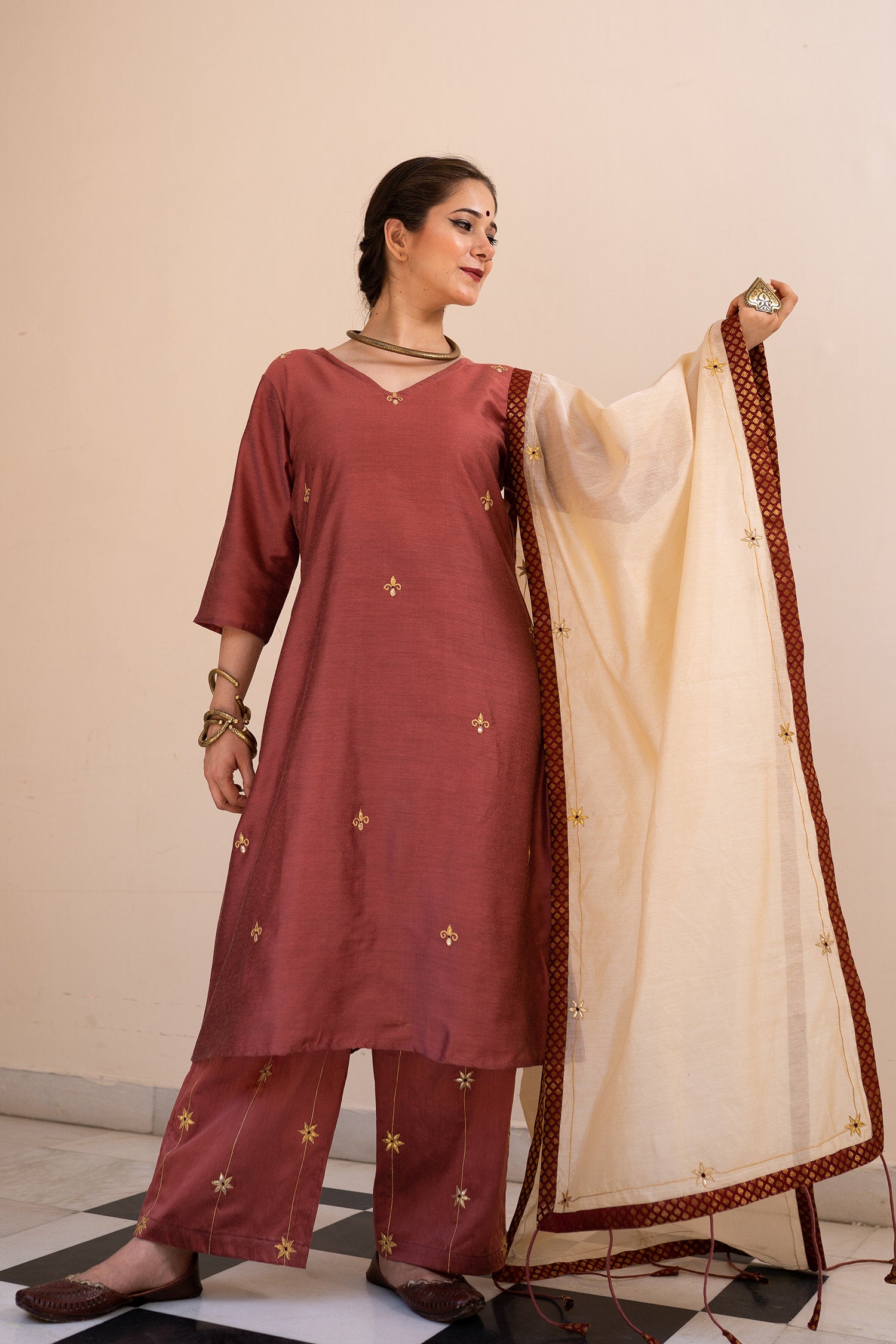 The burgundy cotton silk gota patti suit set for a beautiful and majestic look combining style and tradition with class giving it an elegant look.