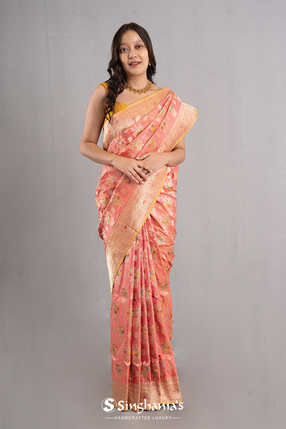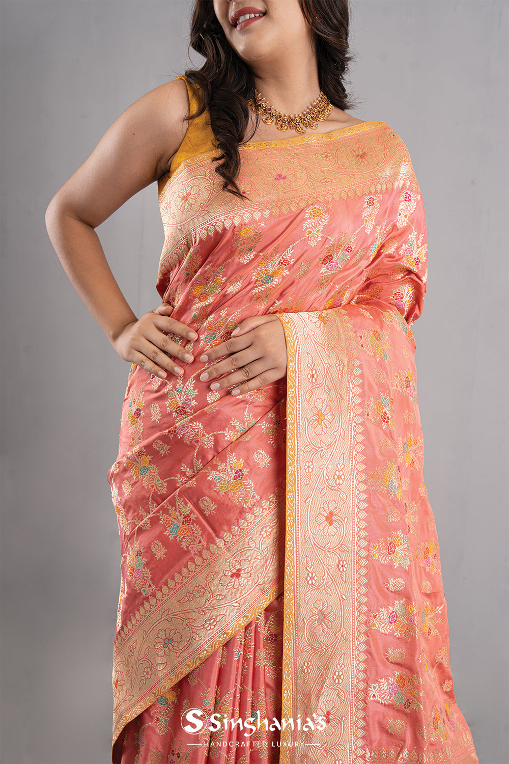 This candlelight peach banarasi silk saree with floral jaal pattern in meenakari-gold zari work, is a splendid choice for every woman. The small border and pallu is designed with contrasted floral vine pattern which enhances its charm, making it ideal for festive or wedding events.