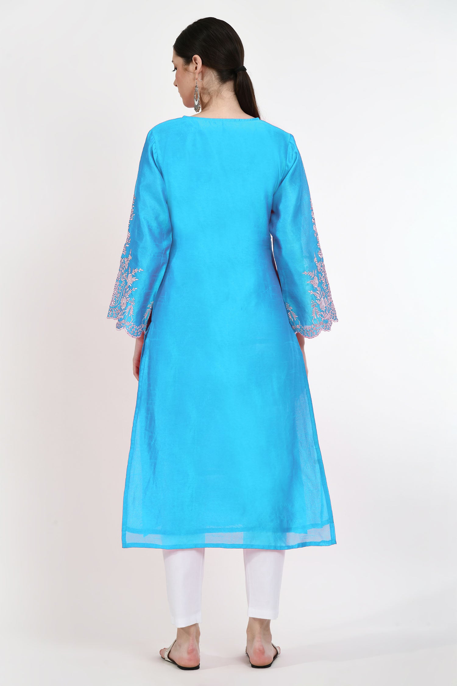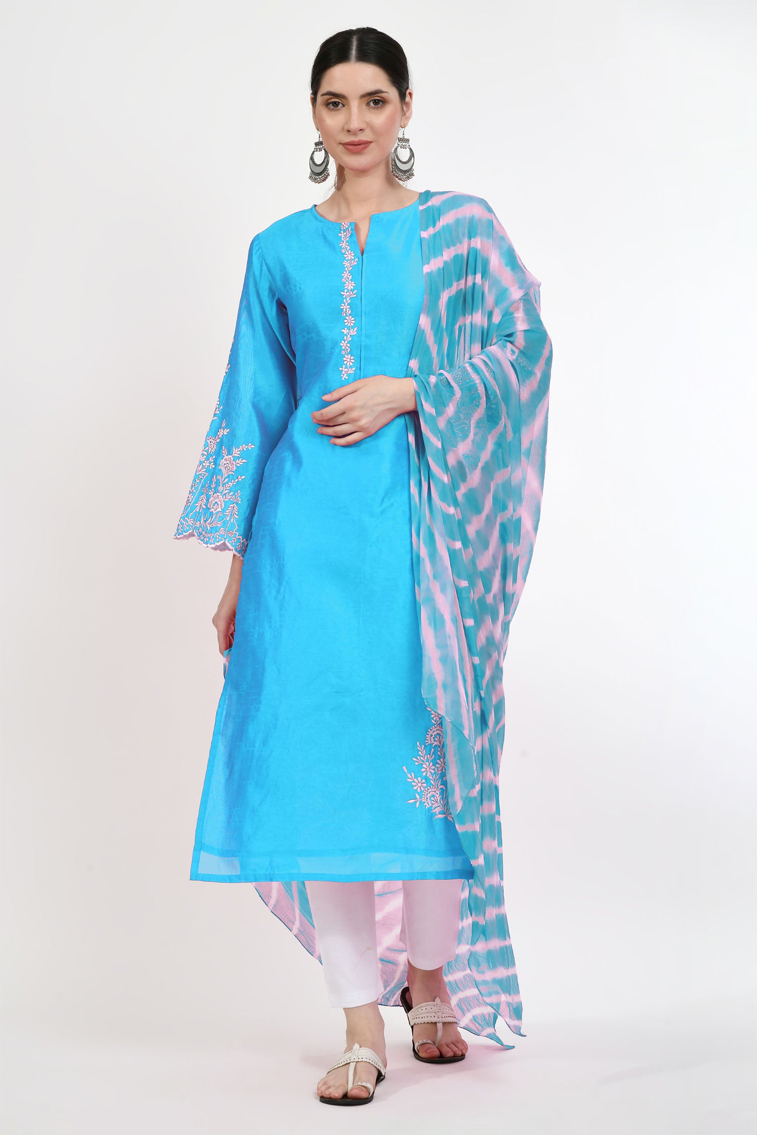The capri blue raw silk floral embroidered kurti with pants and dupatta for a neat and elegant look that combines trendy comfort with tradition in a classy appearance.
