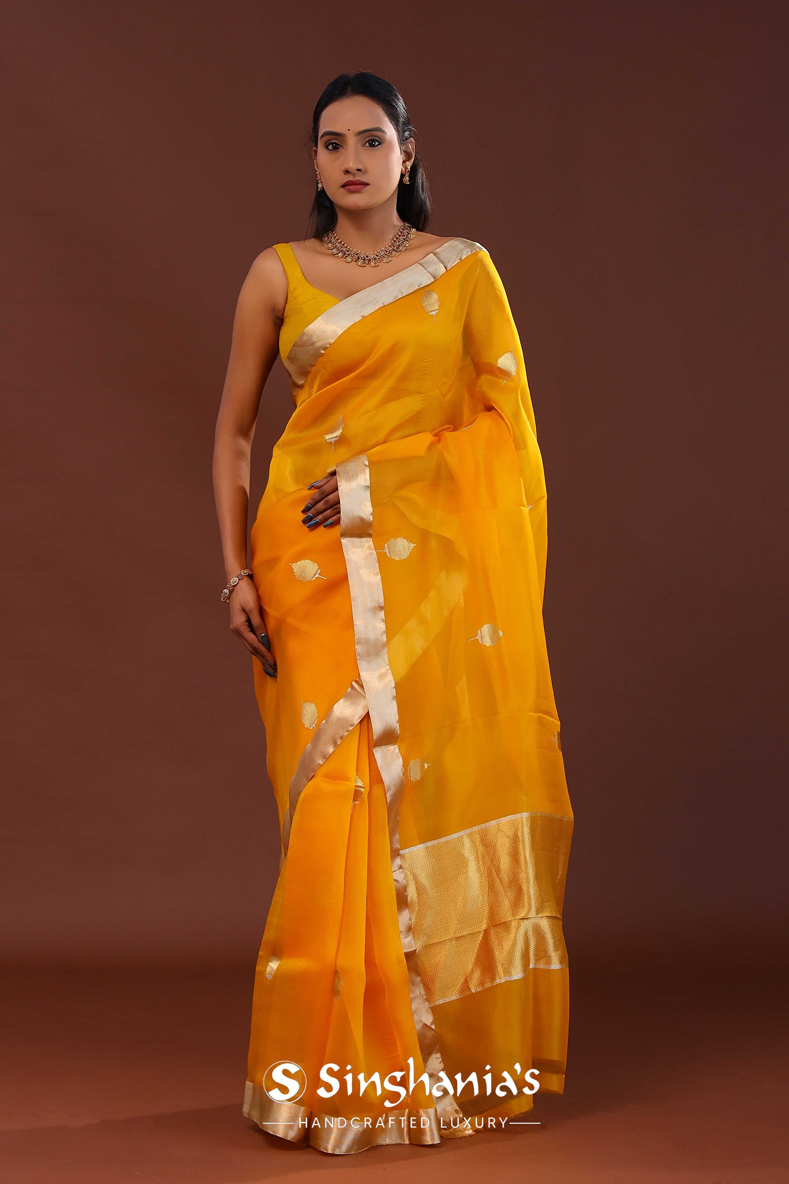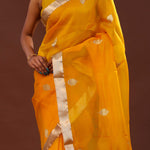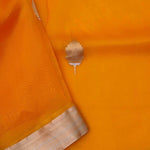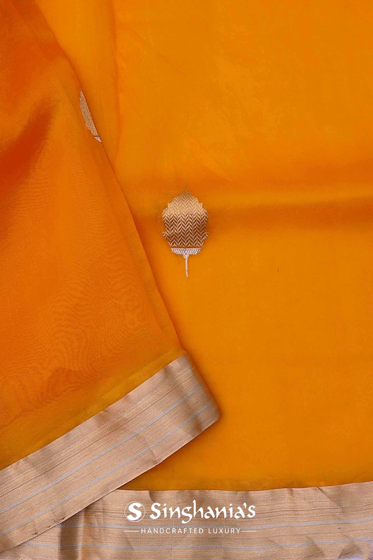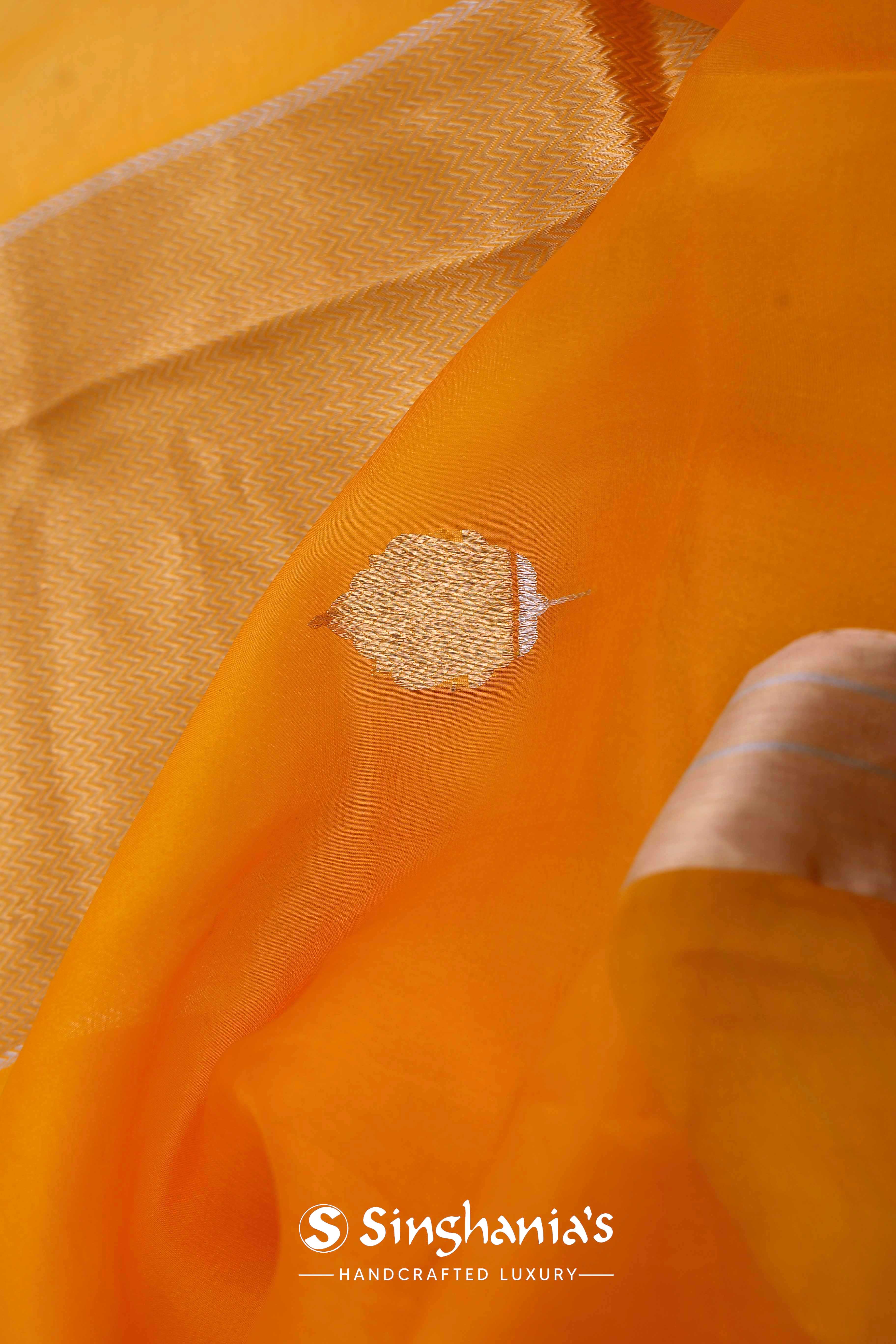 This Carrot orange organza banarasi saree reflects grace by the simple floral butti's with gold and silver and small contrast border ,which adds extra charm and elegence to the overall look of the saree