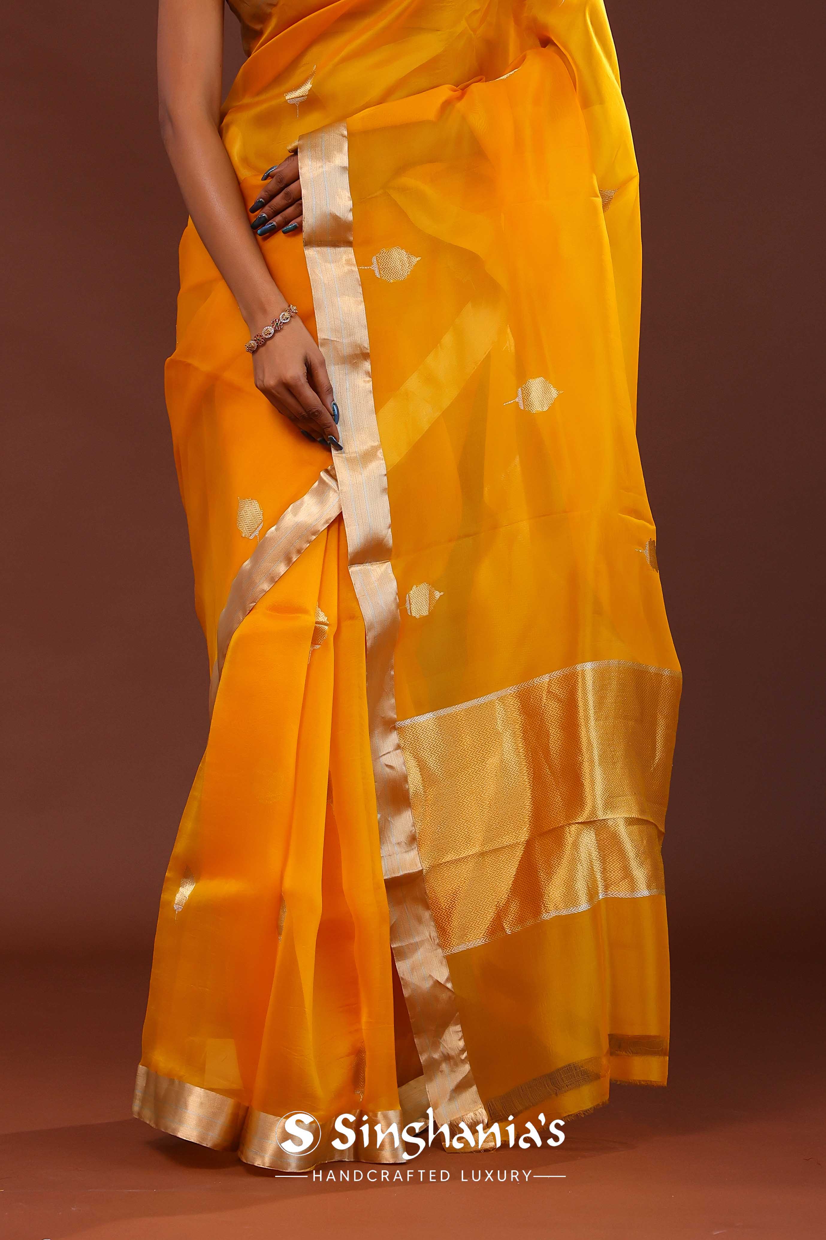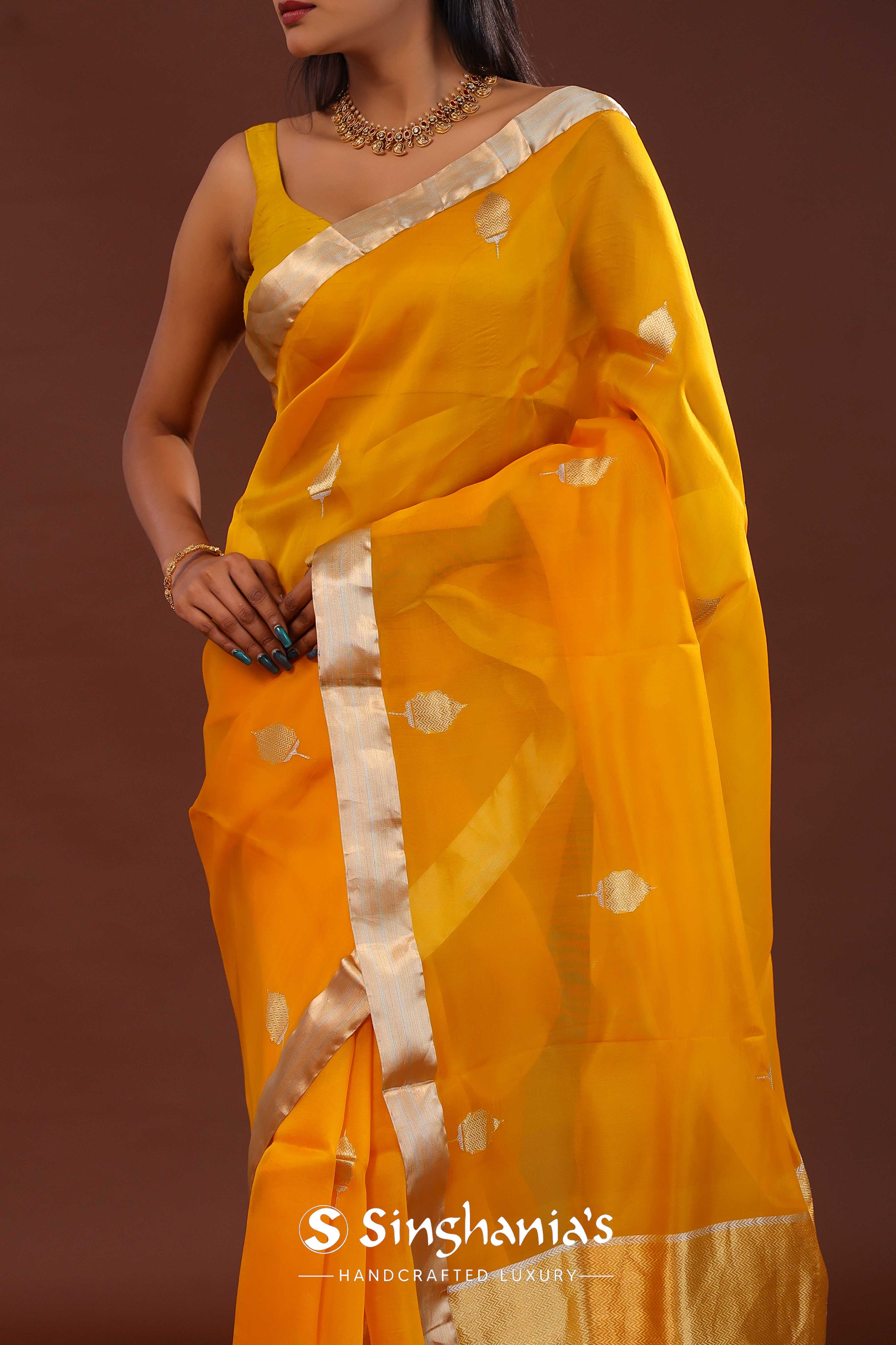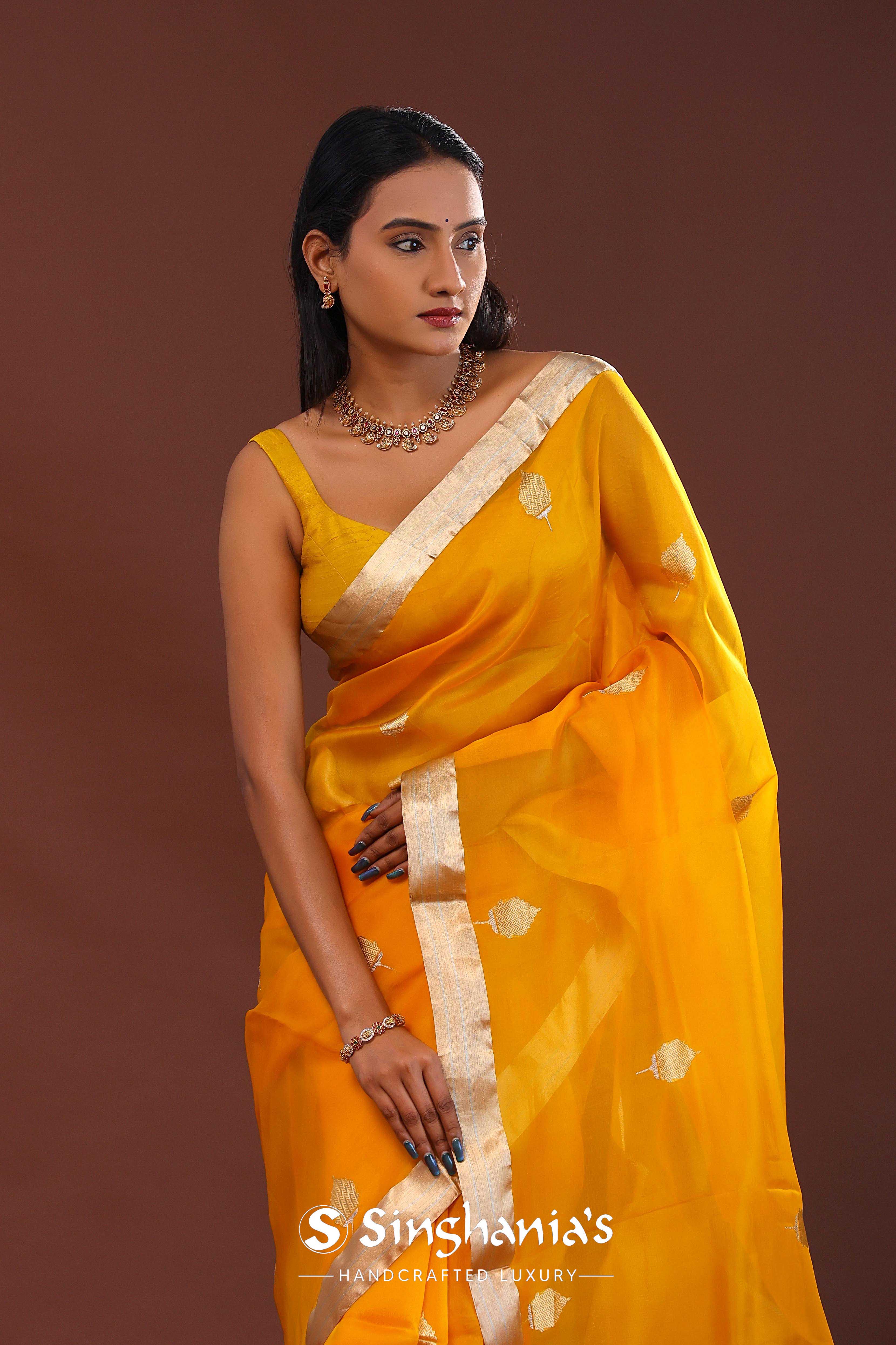 This Carrot orange organza banarasi saree reflects grace by the simple floral butti's with gold and silver and small contrast border ,which adds extra charm and elegence to the overall look of the saree