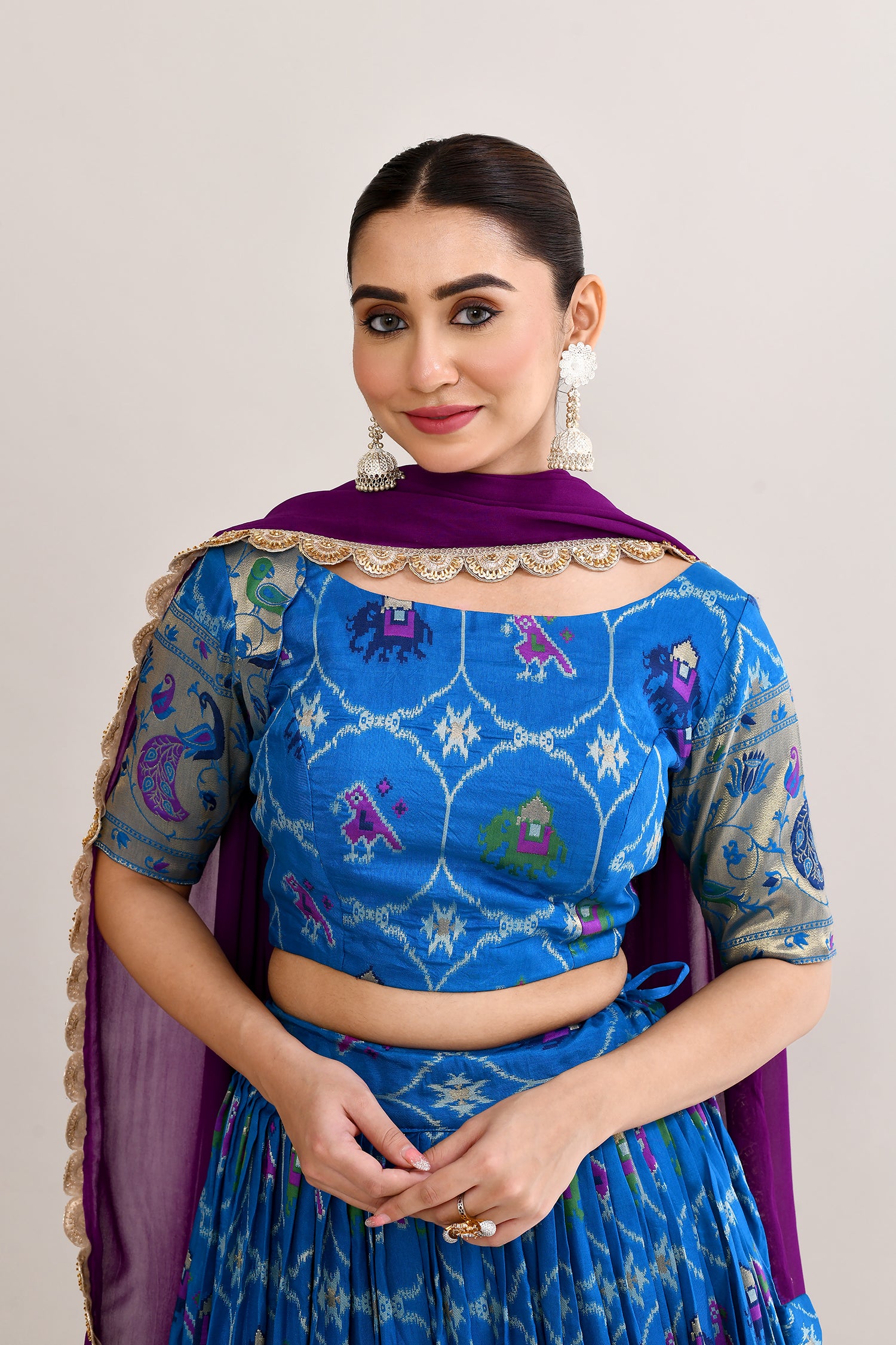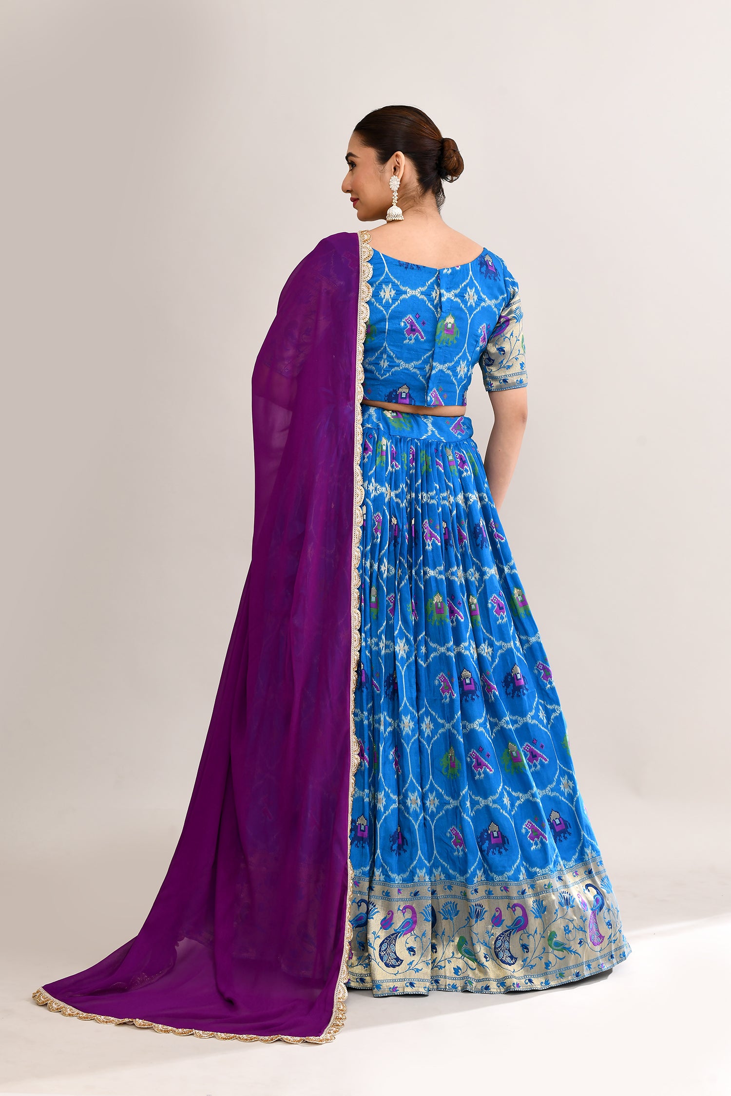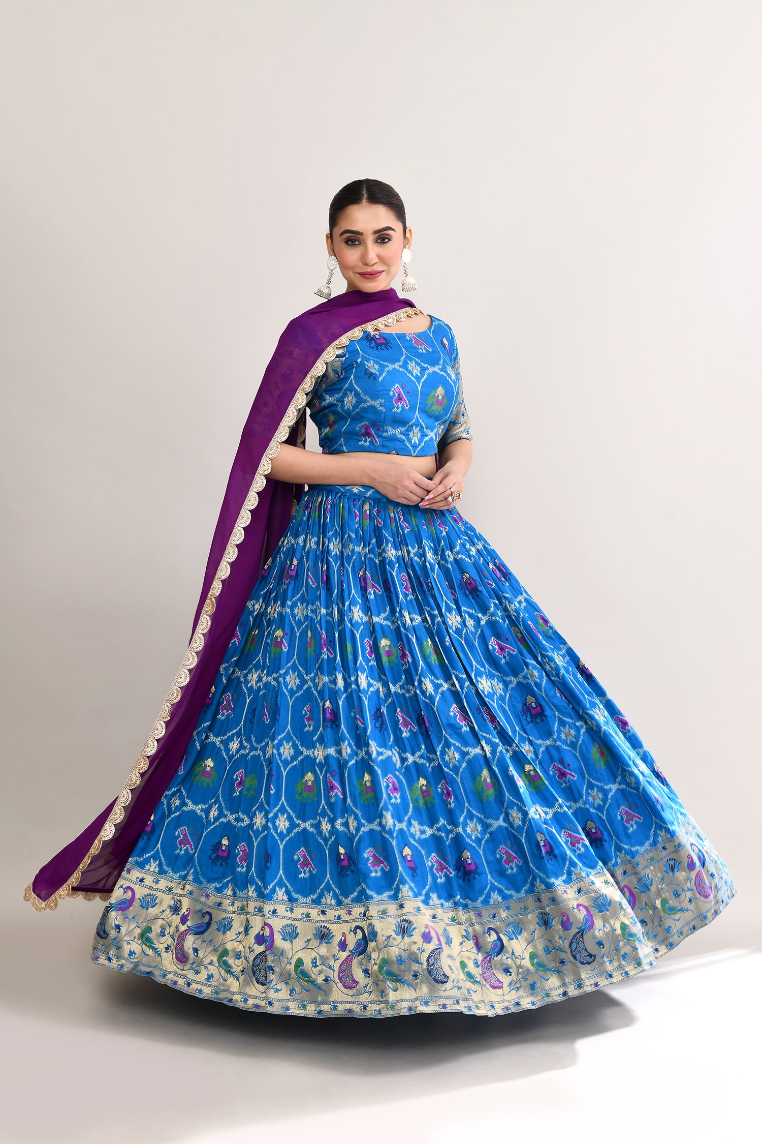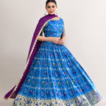 The celtic blue cotton silk ikat printed lehenga set with paithani border and a georgette dupatta for a beautiful and classy look.