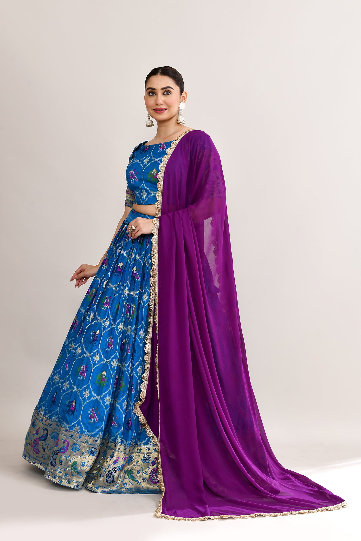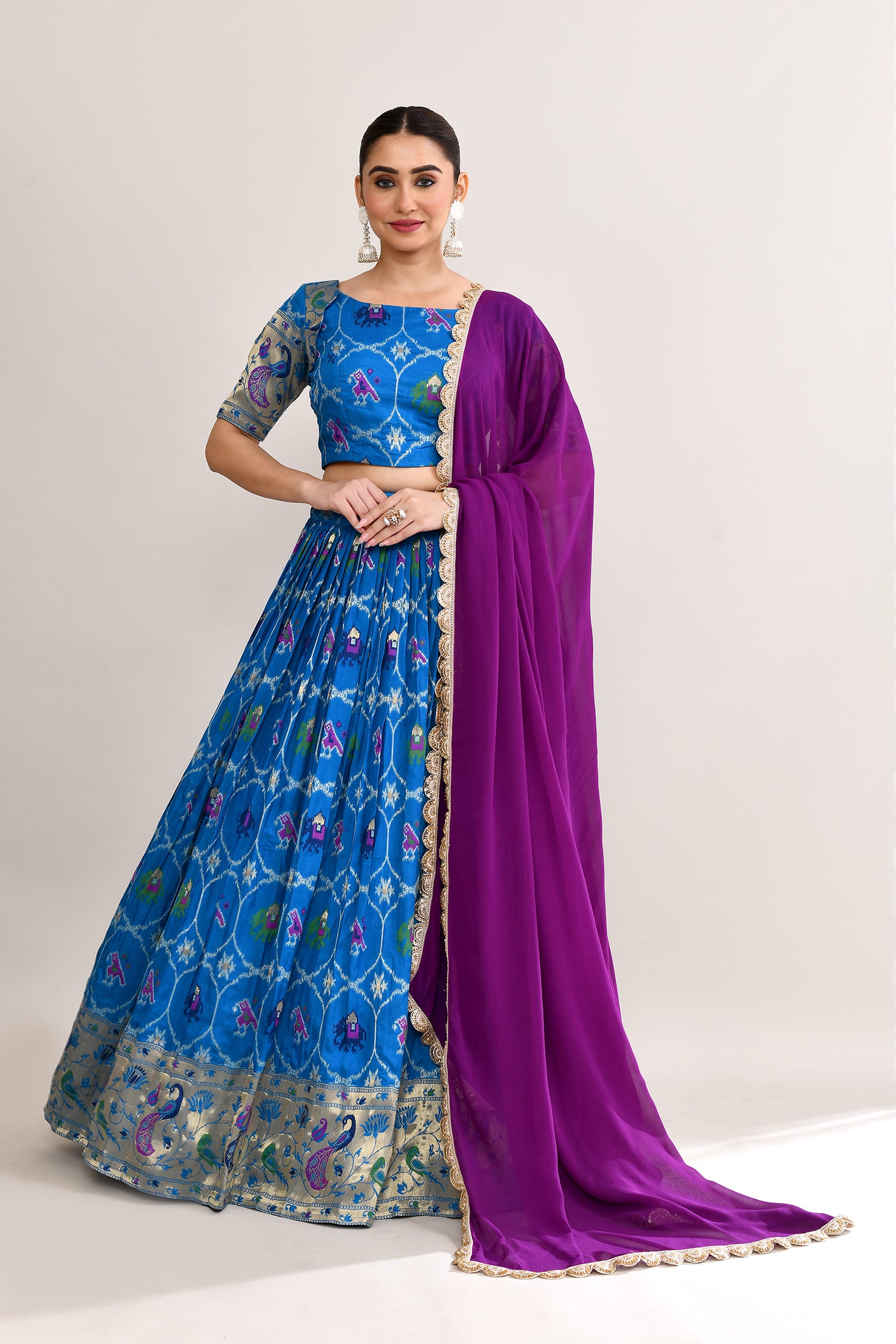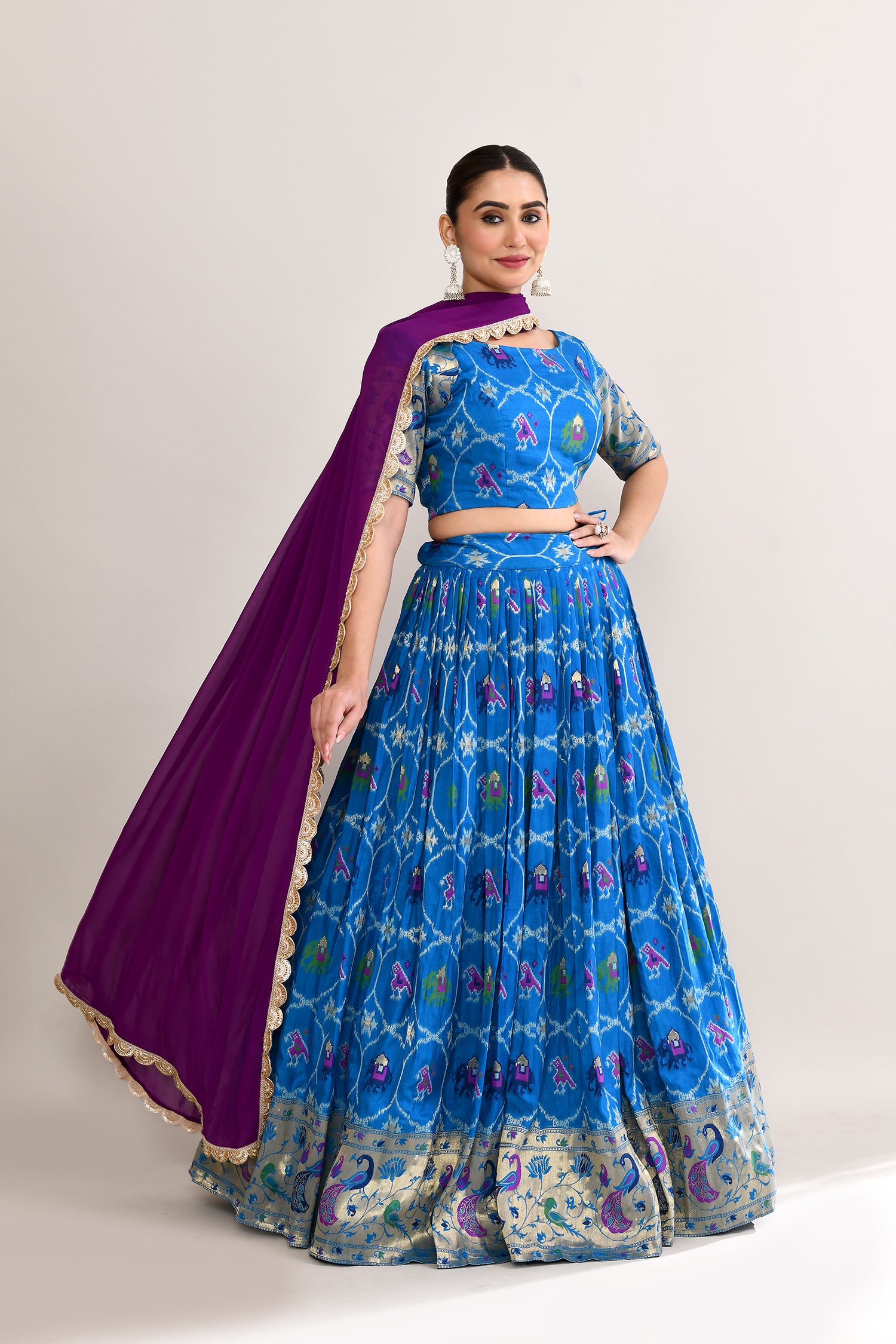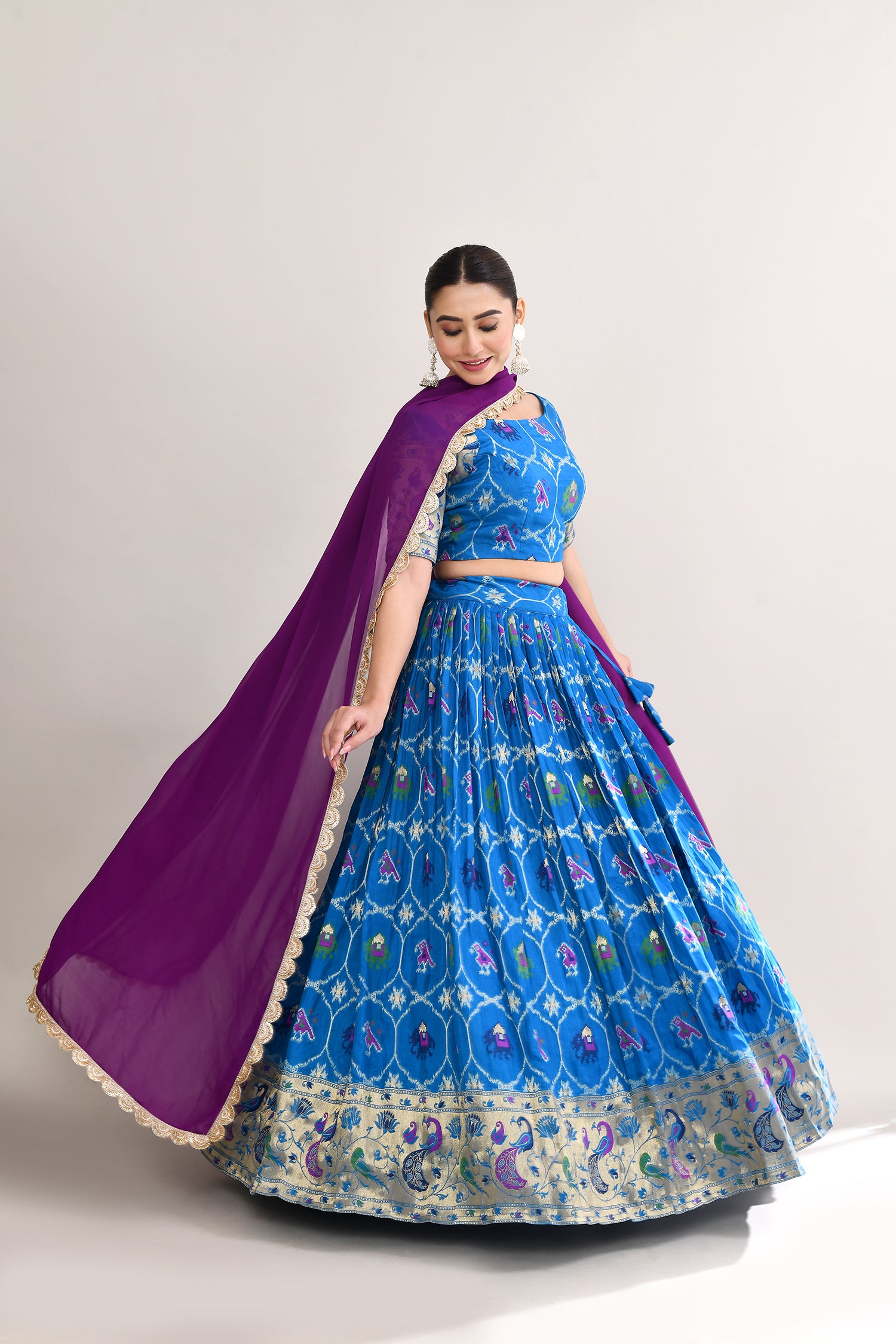 The celtic blue cotton silk ikat printed lehenga set with paithani border and a georgette dupatta for a beautiful and classy look.