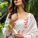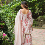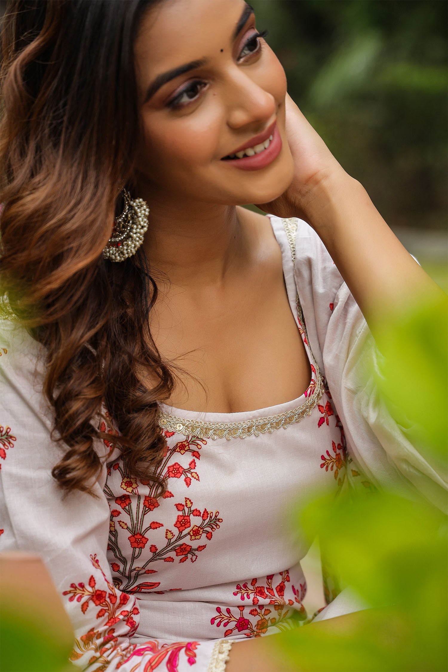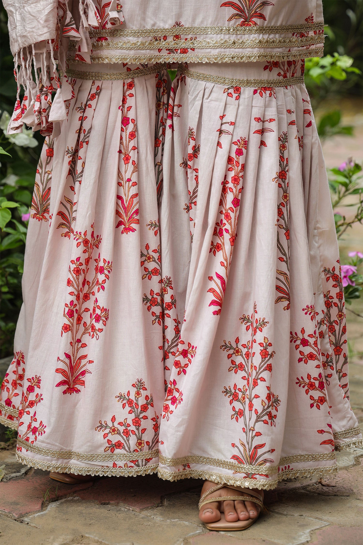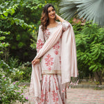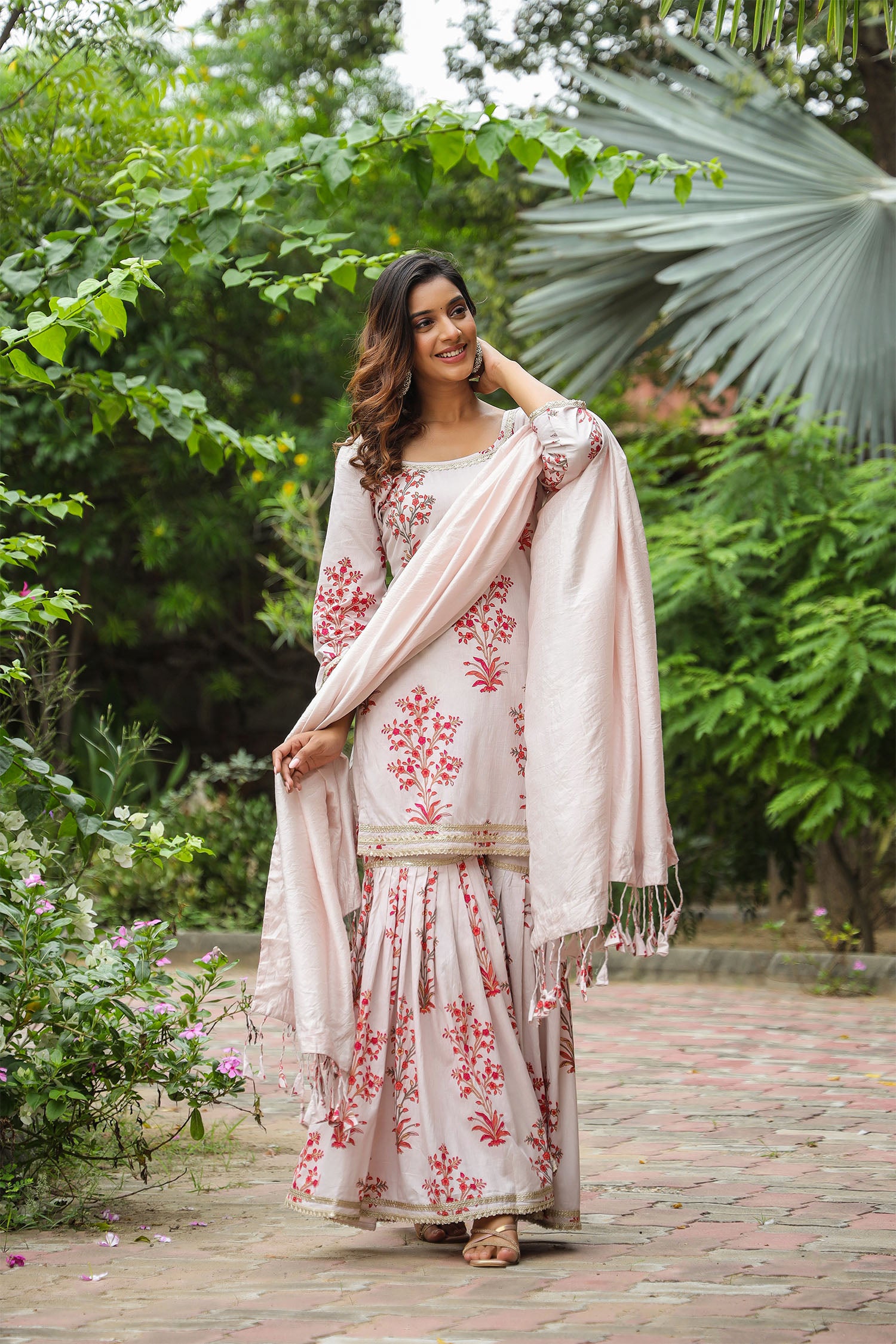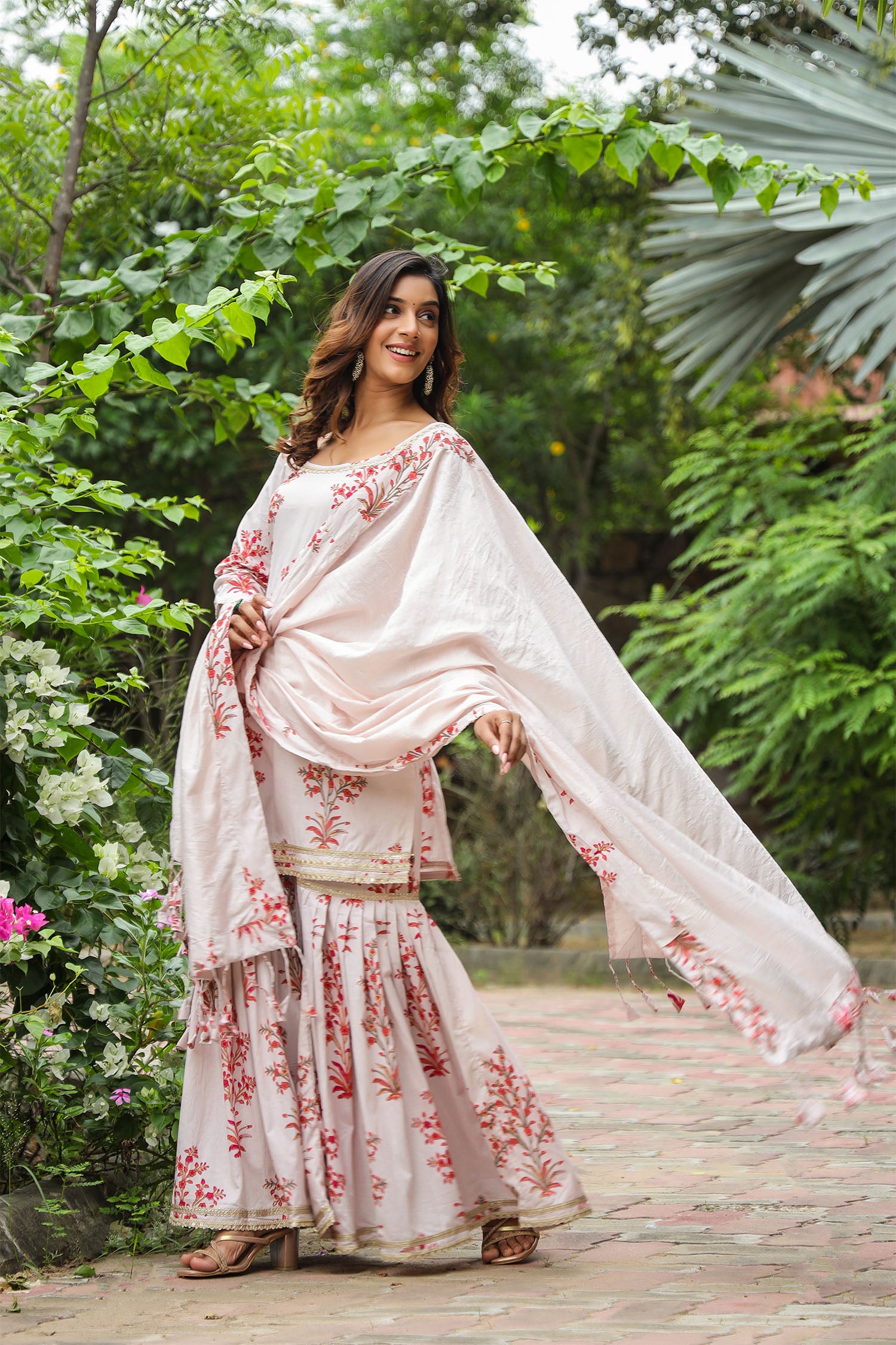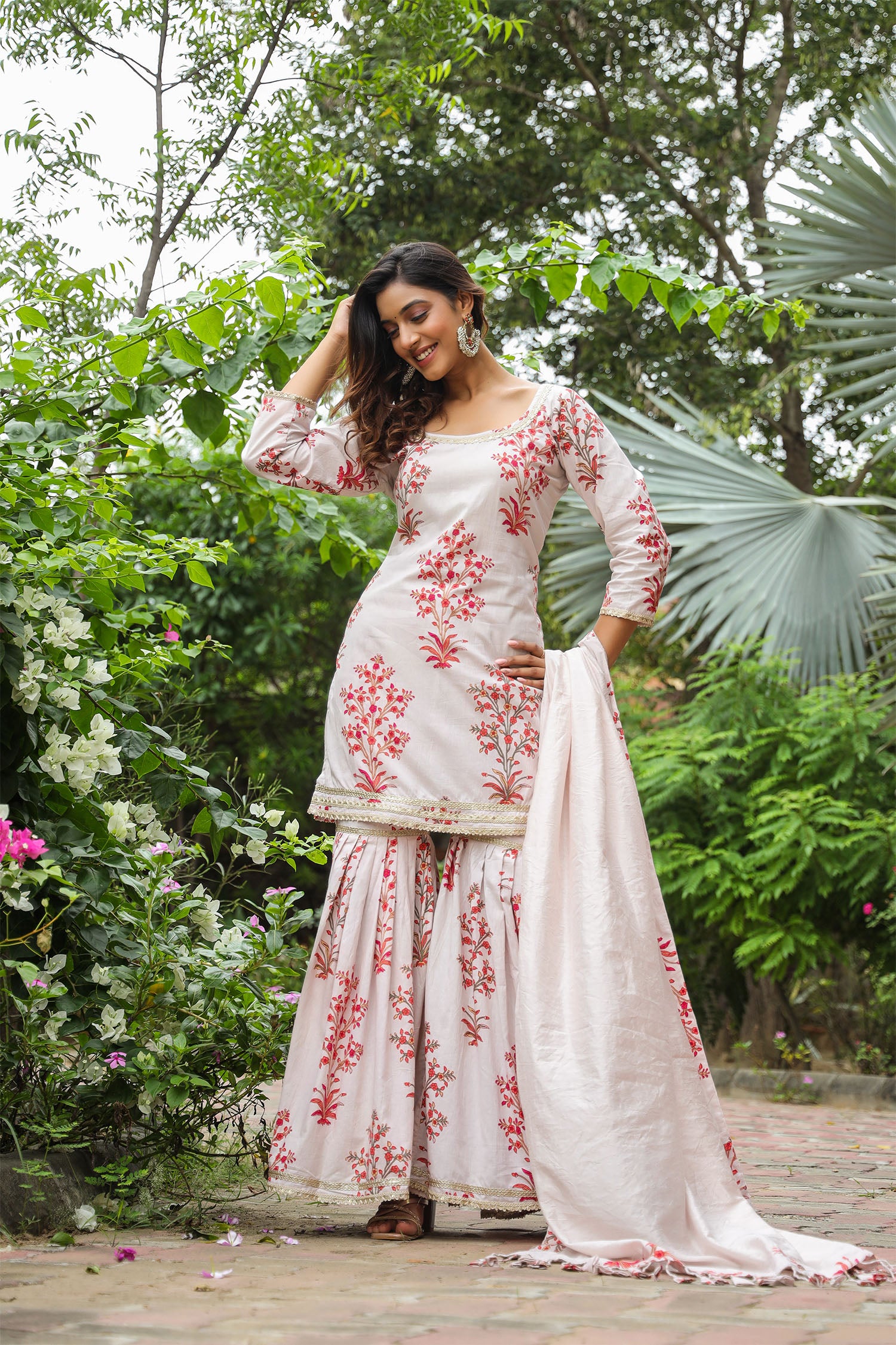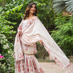 The champagne white cotton floral printed sharara set with matching mul cotton dupatta for a trendy look in style.