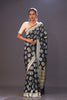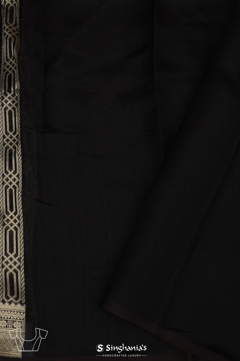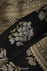 This is a charcoal black banarasi silk saree for festive, wedding occasions and party wear. Adorned with gold and silver zari floral butta weaving all over the body and a small, floral geometrical border and pallu, completing the whole look.