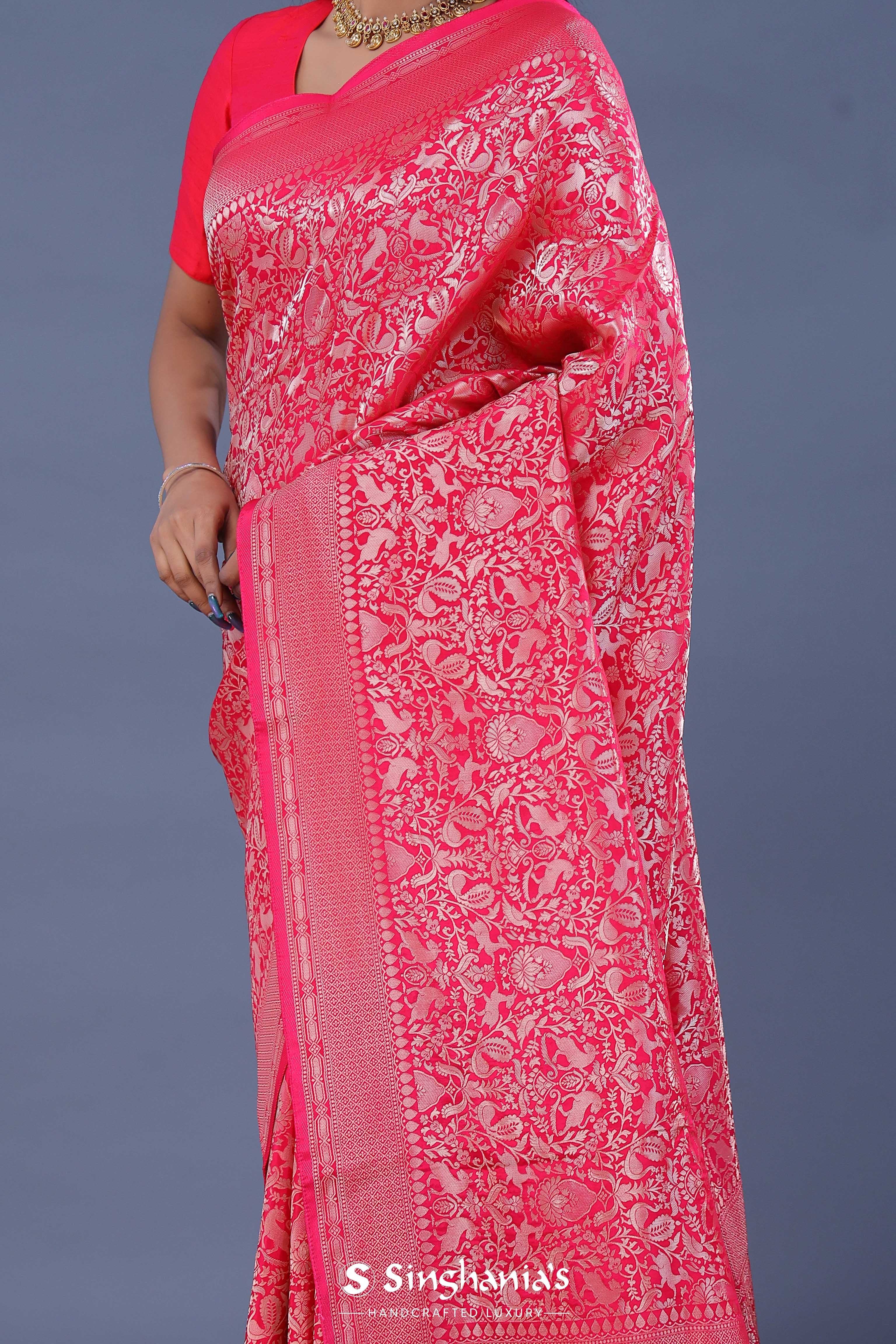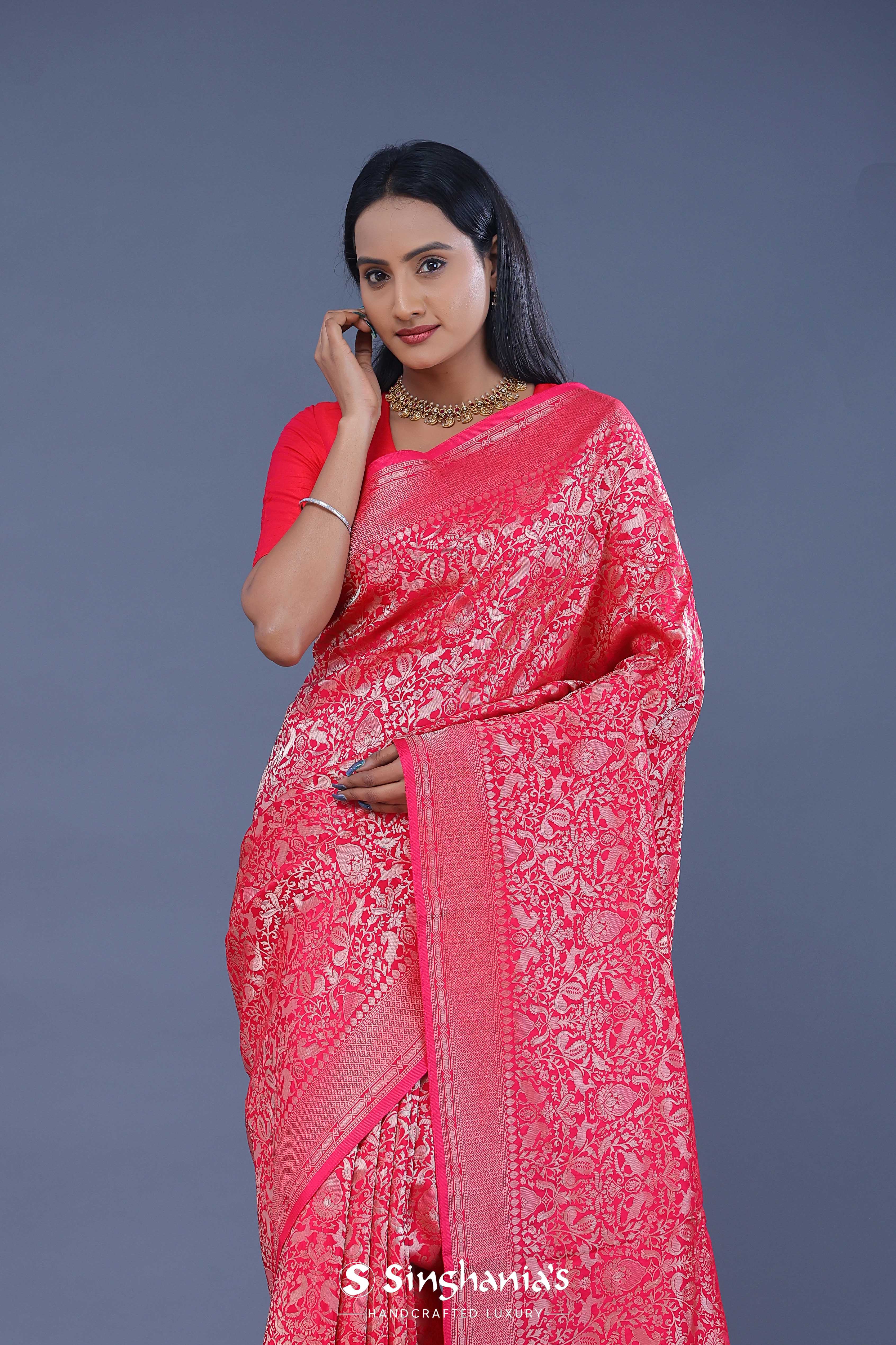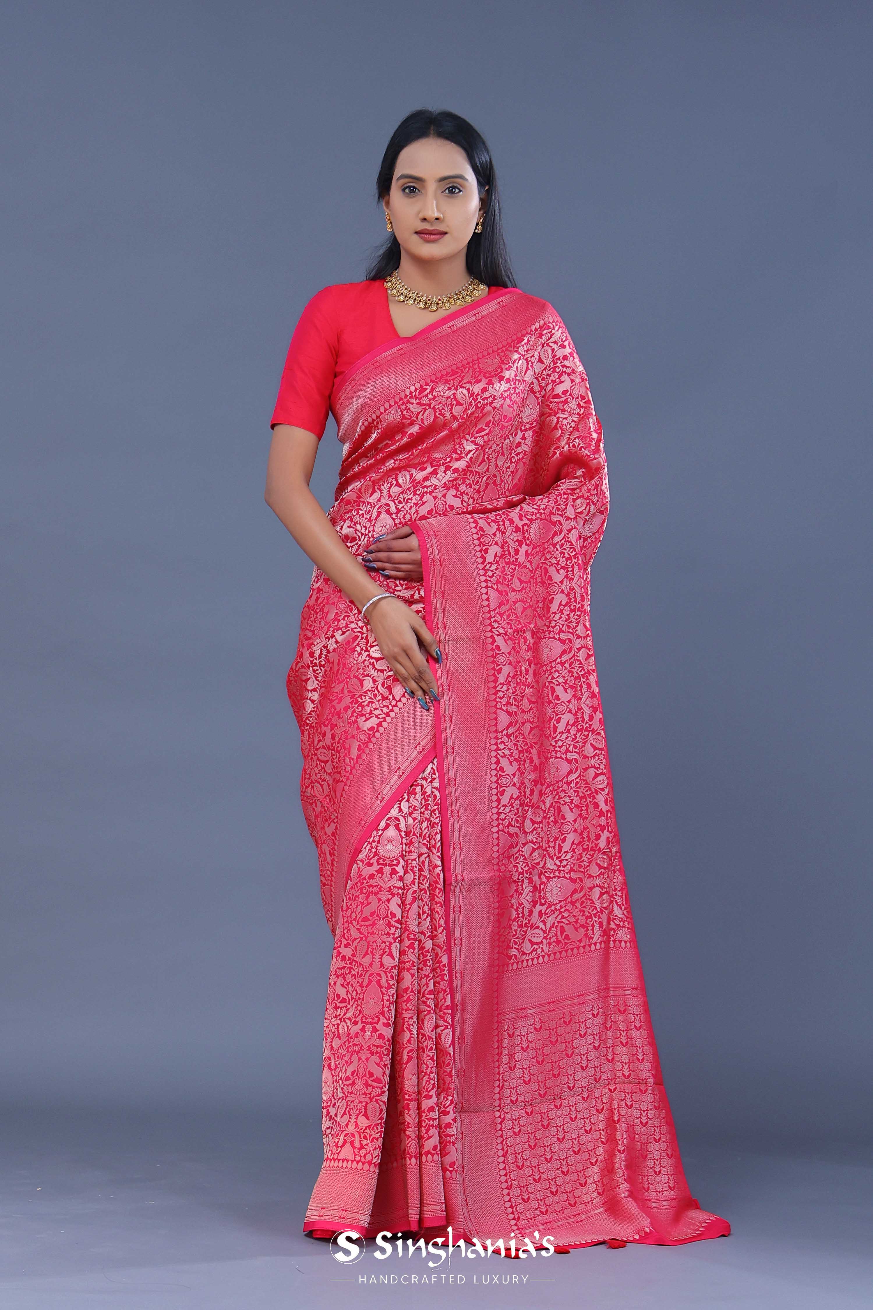 Cherry red banarasi saree presents a jungle theme on entire body with pure zari accompanied with matching zari border which is making it suitable for all events