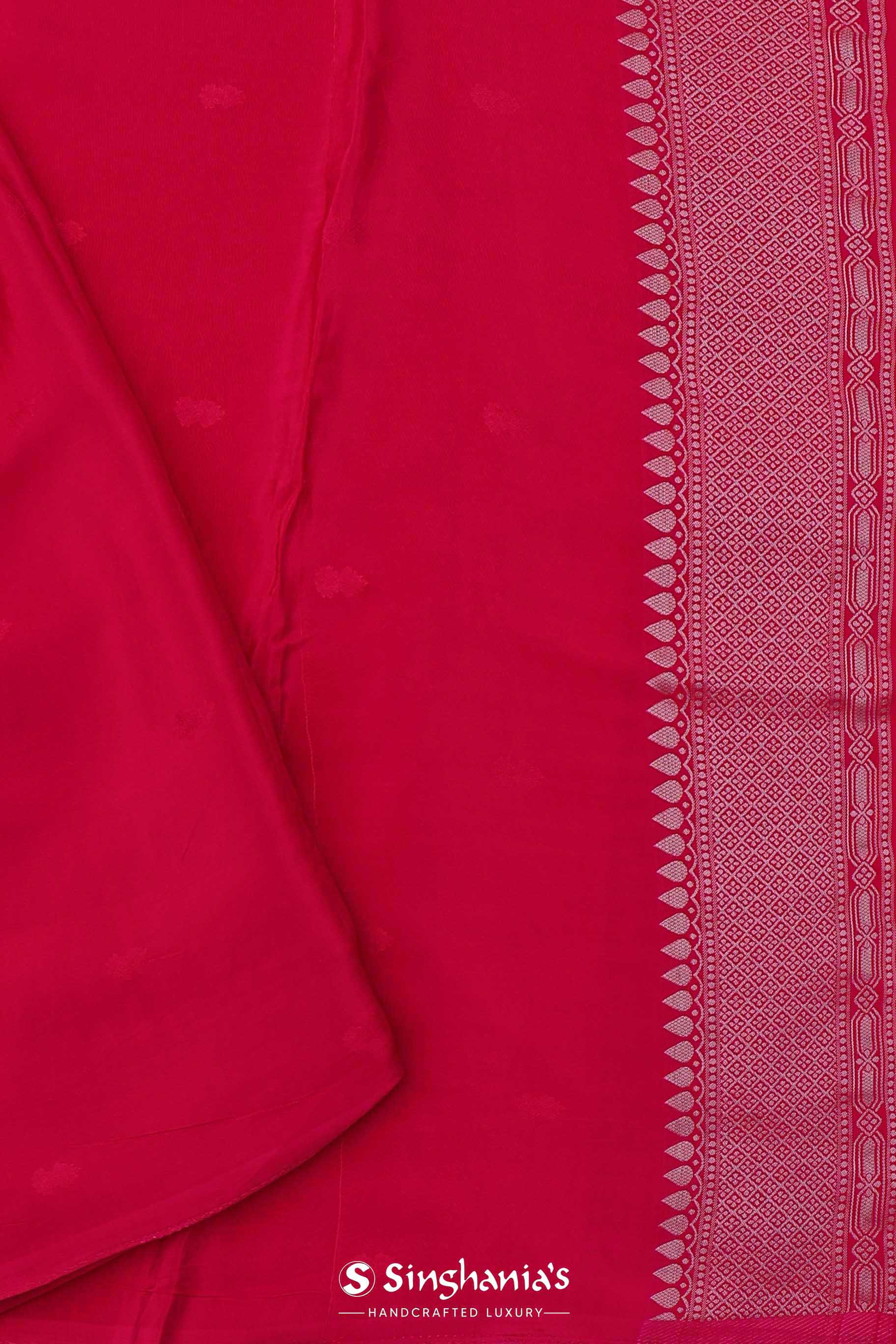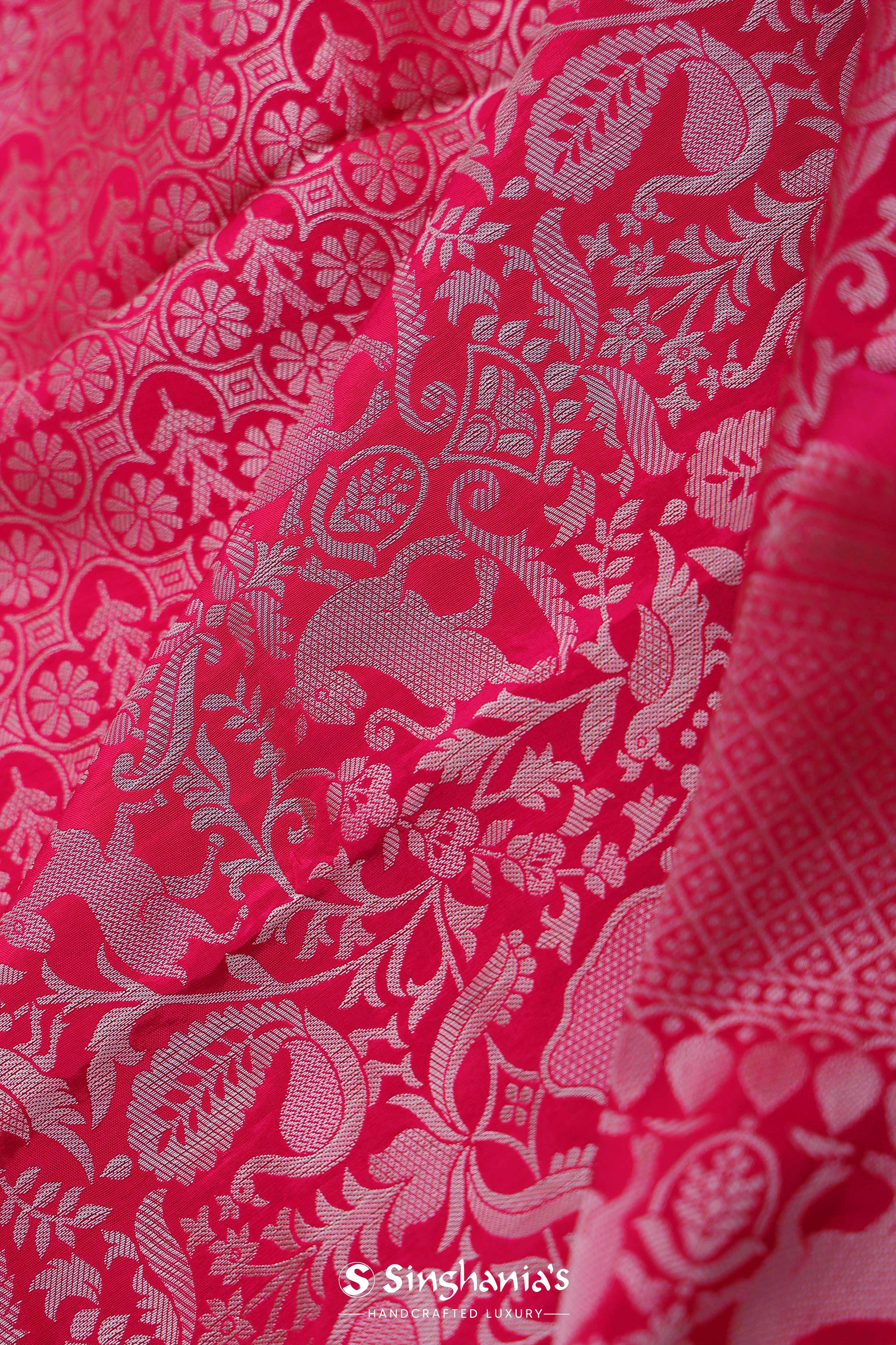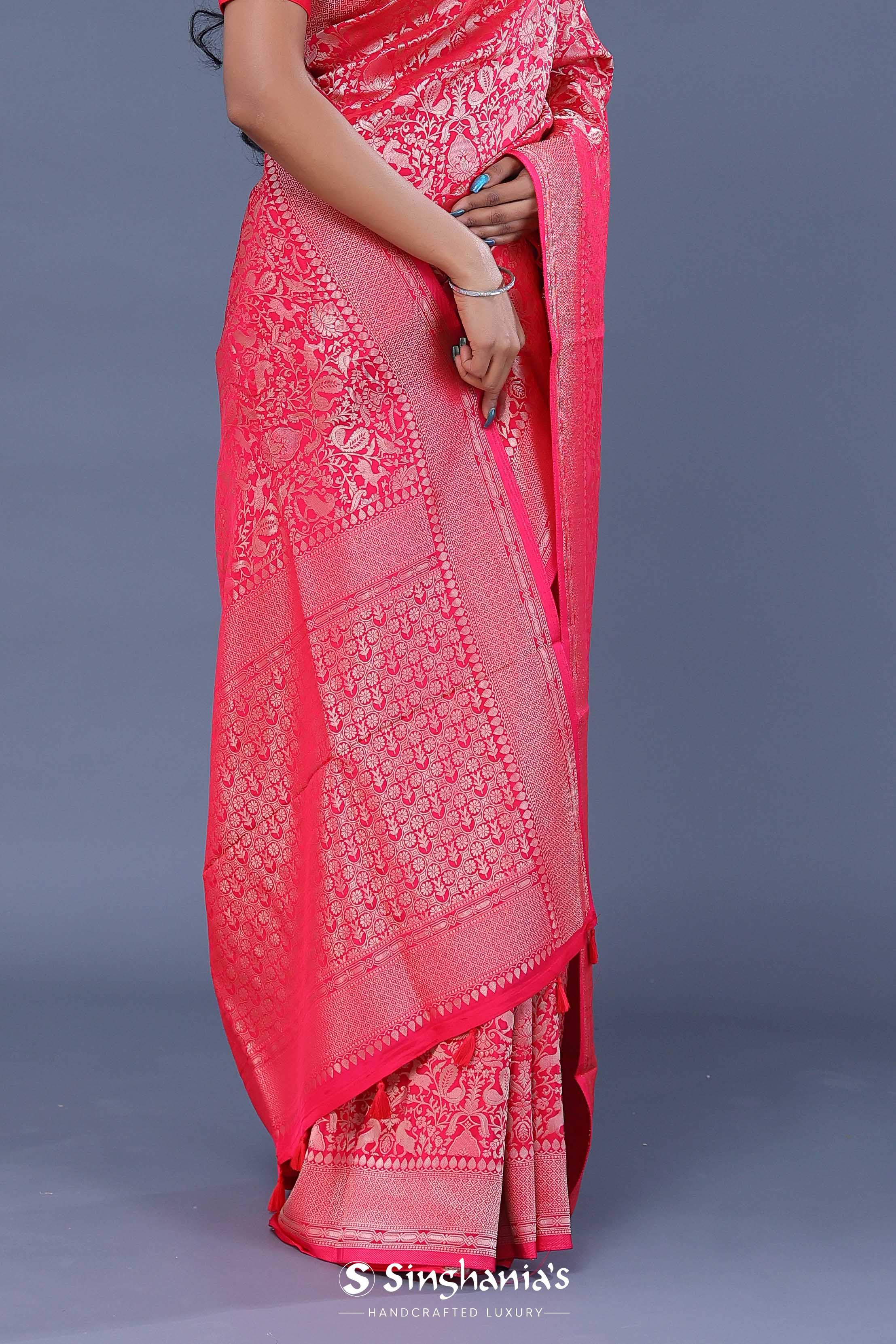 Cherry red banarasi saree presents a jungle theme on entire body with pure zari accompanied with matching zari border which is making it suitable for all events