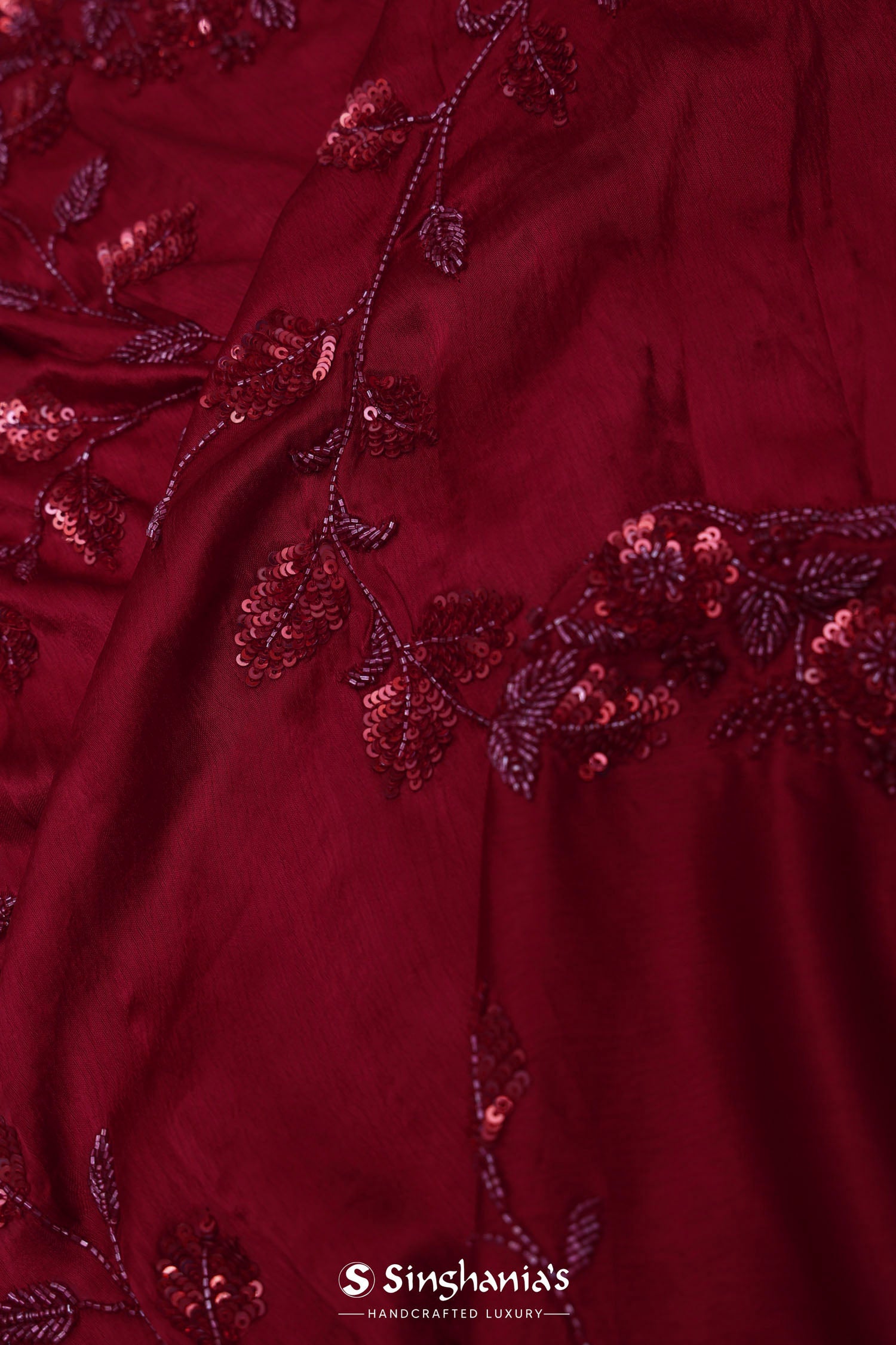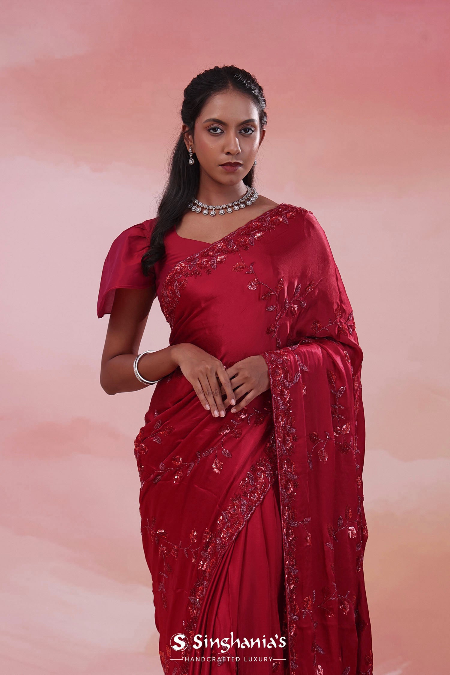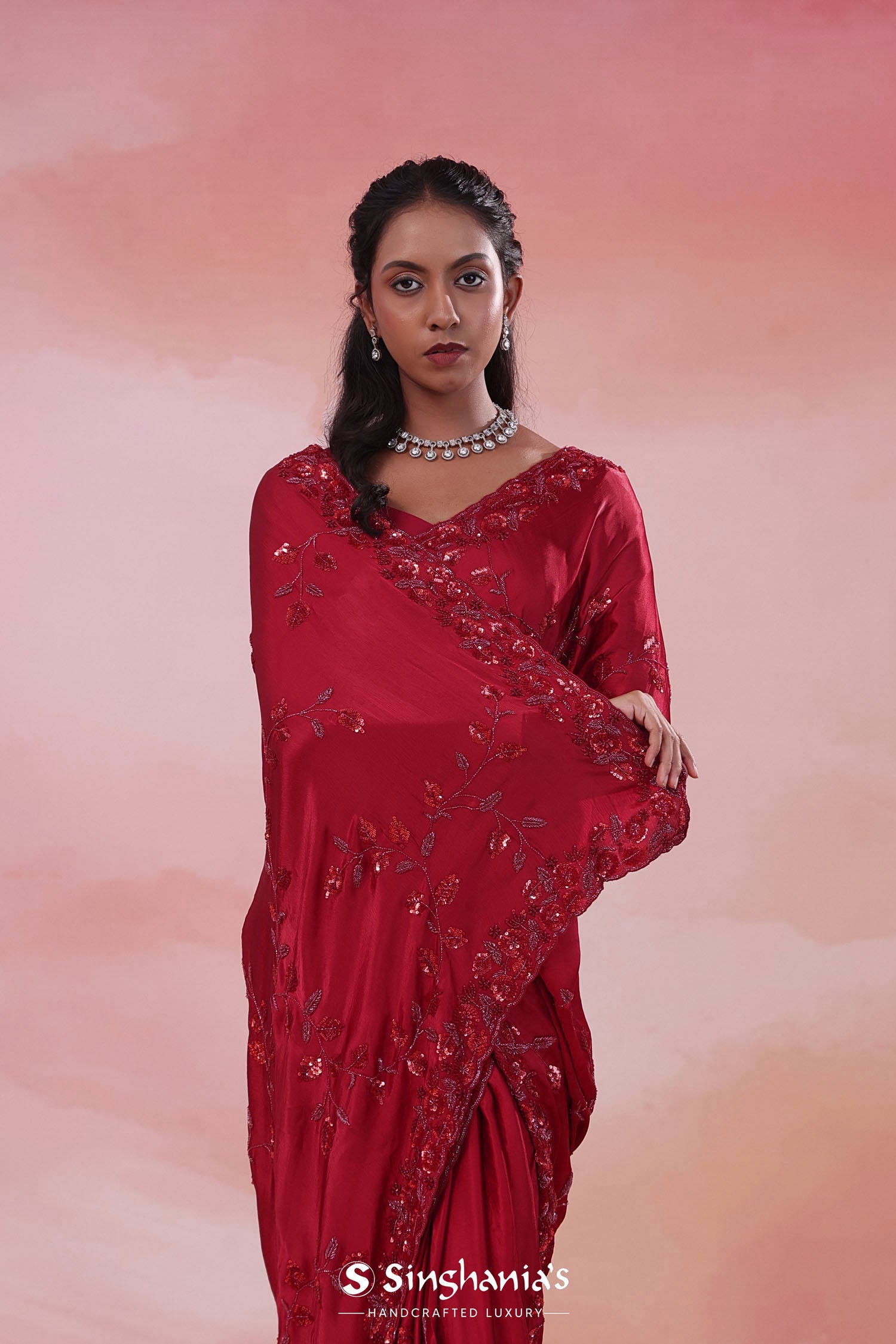 The jaal embroidered with kardana and red sequins work spread all across the body of Claret red satin crepe saree complemented with fancy border and unstitched blouse