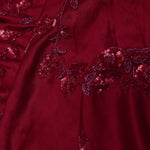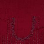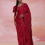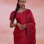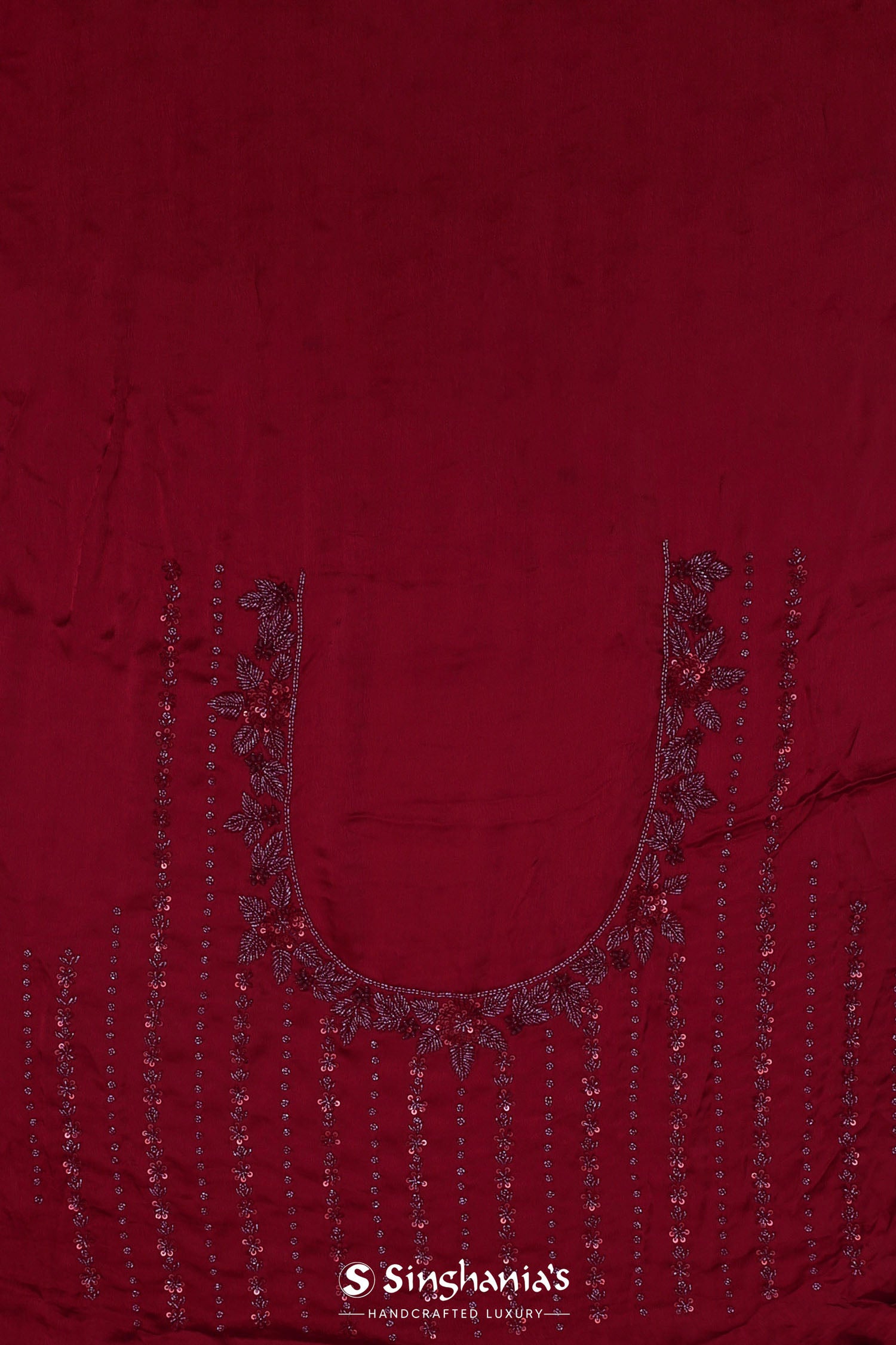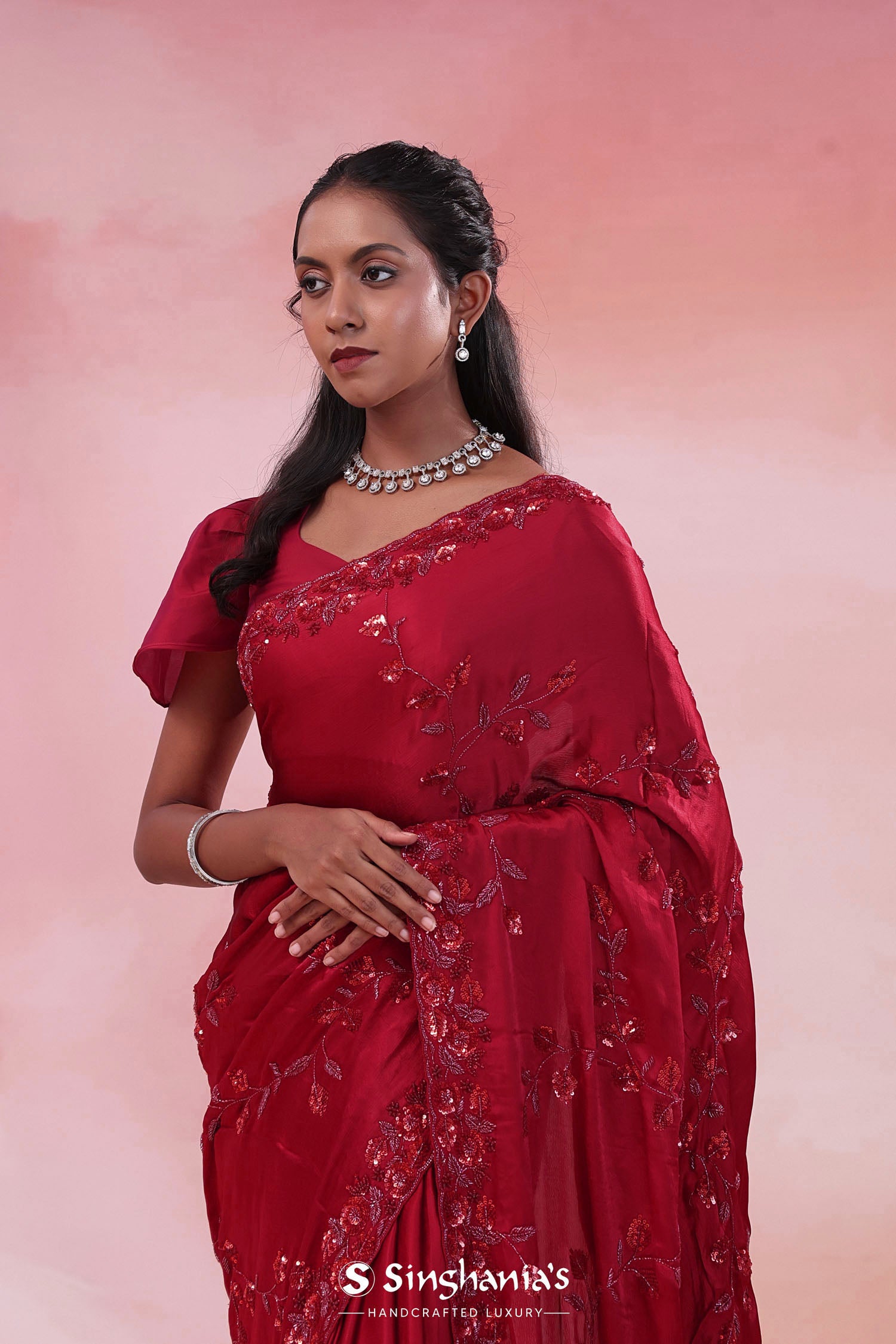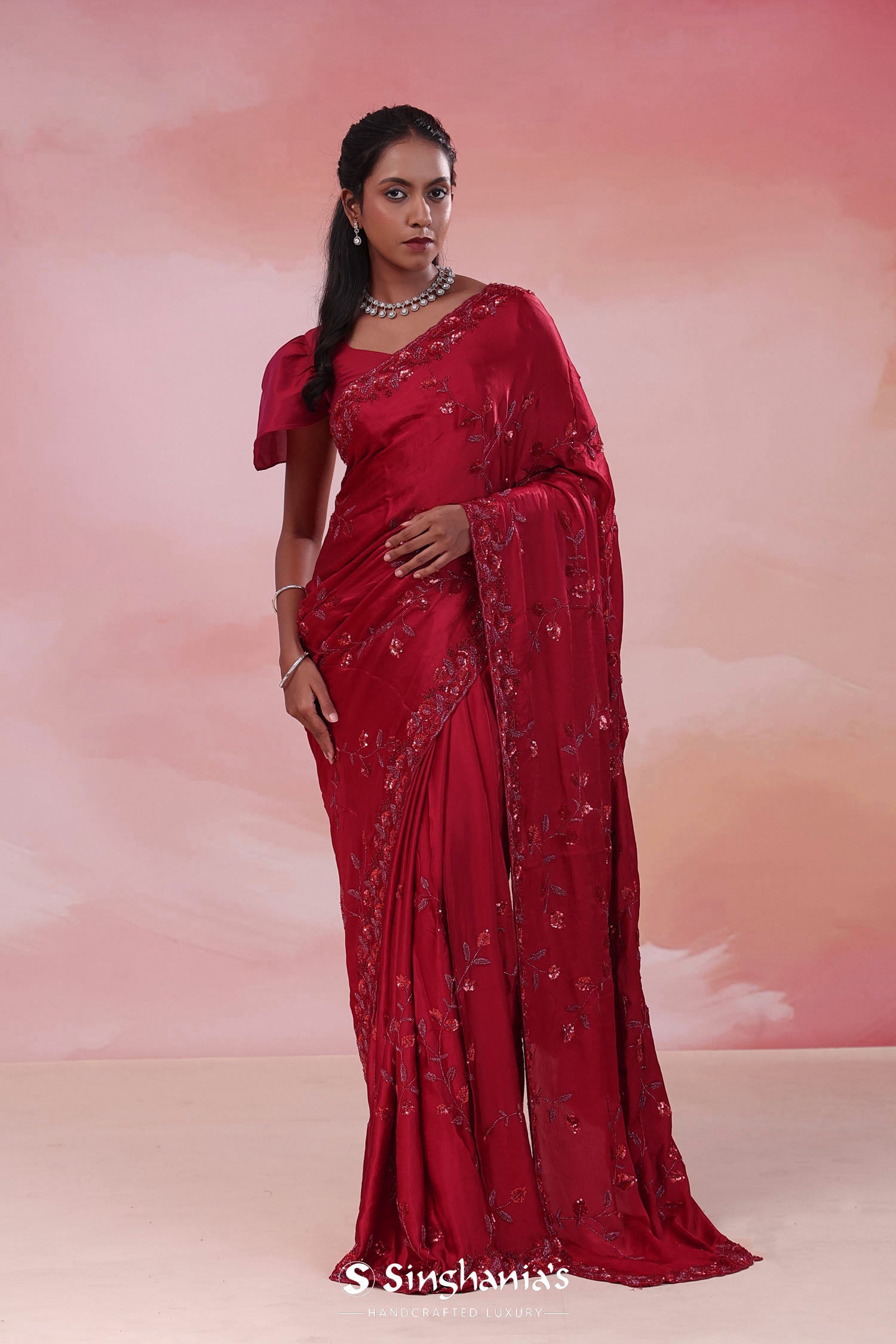 The jaal embroidered with kardana and red sequins work spread all across the body of Claret red satin crepe saree complemented with fancy border and unstitched blouse