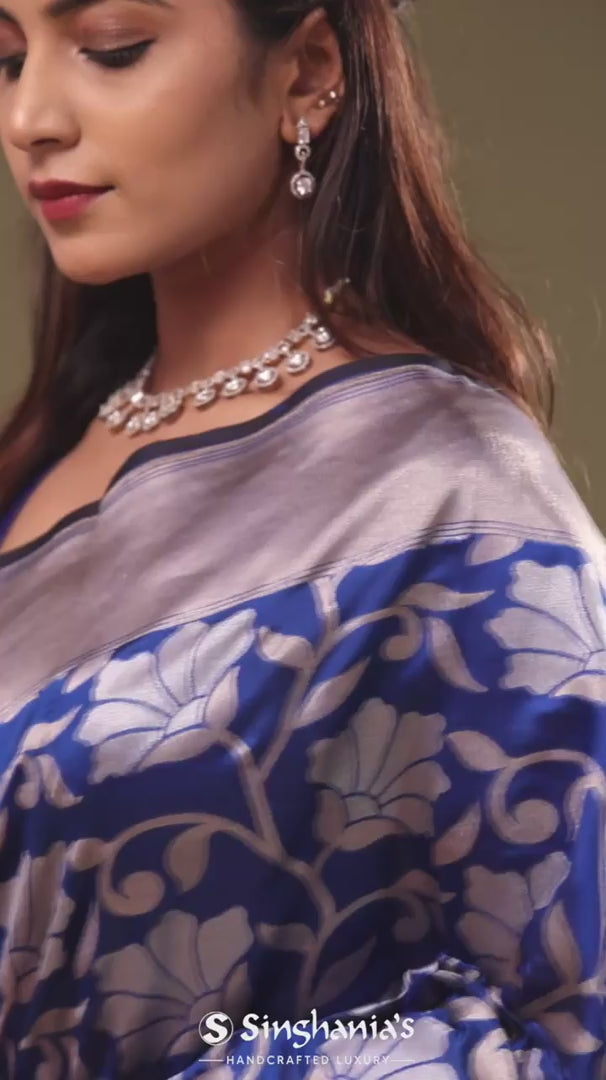 A delicate floral jaal with gold zari stems and silver zari petals adorns a deep cobalt blue Banarasi saree. The saree's rich gold zari border, which is beautifully crafted, makes for a striking contrast.