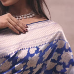 A magnificent cobalt blue Banarasi silk saree, richly woven with complex gold and silver zari floral design . The blue fabric is a perfect canvas for the shimmering butti motifs and elaborate floral patterns, creating a stunning interplay of classic and modern elegance