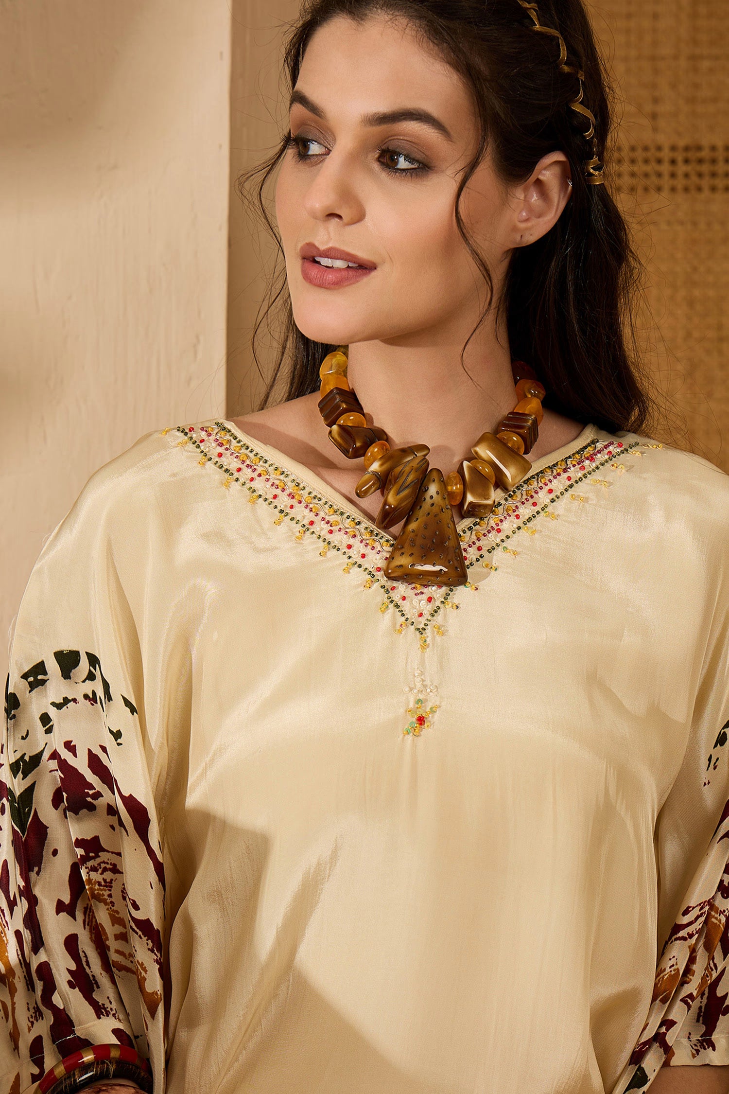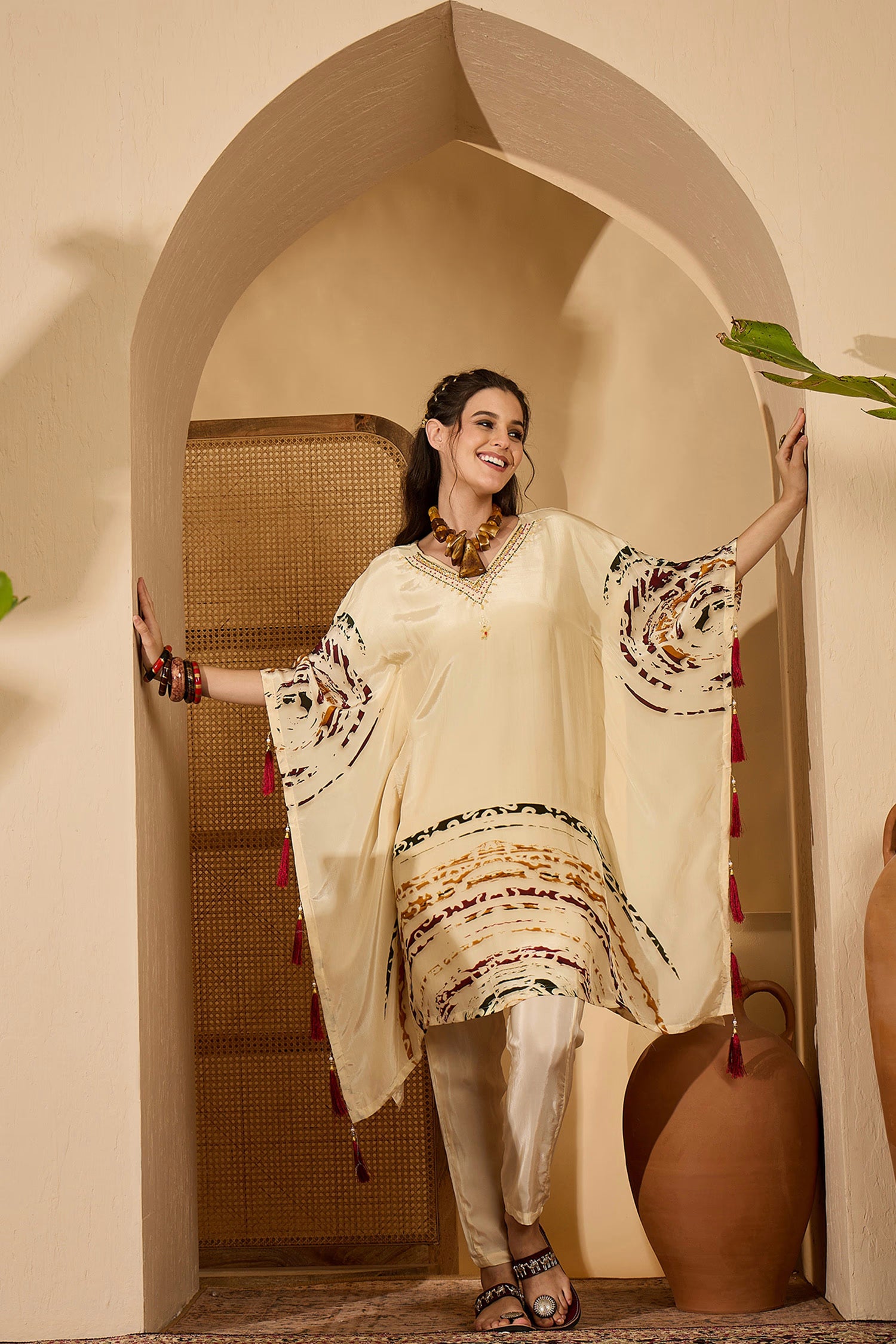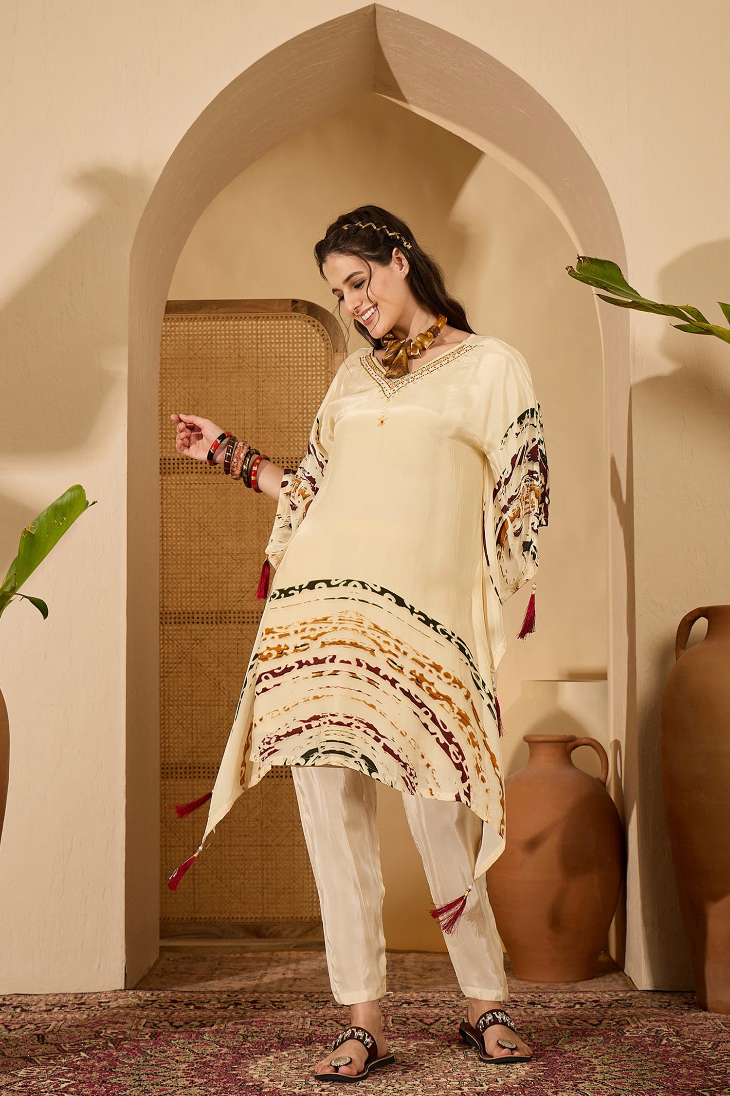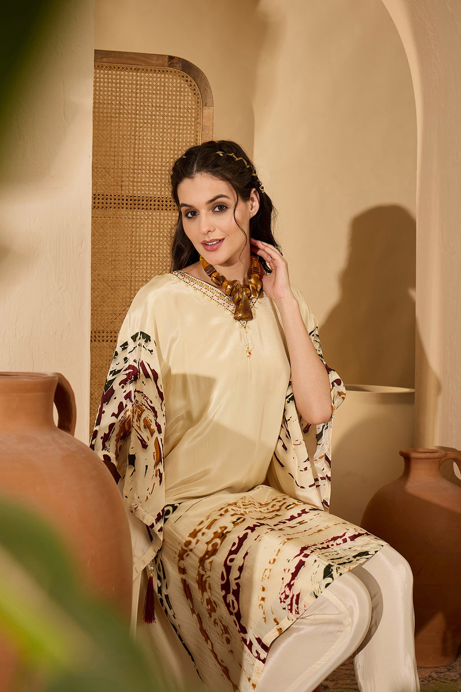 The cream silk printed kaftan style kurti set for a unique way of dressing that blends ethnic look with the modern fashion giving it a perfect classy look.