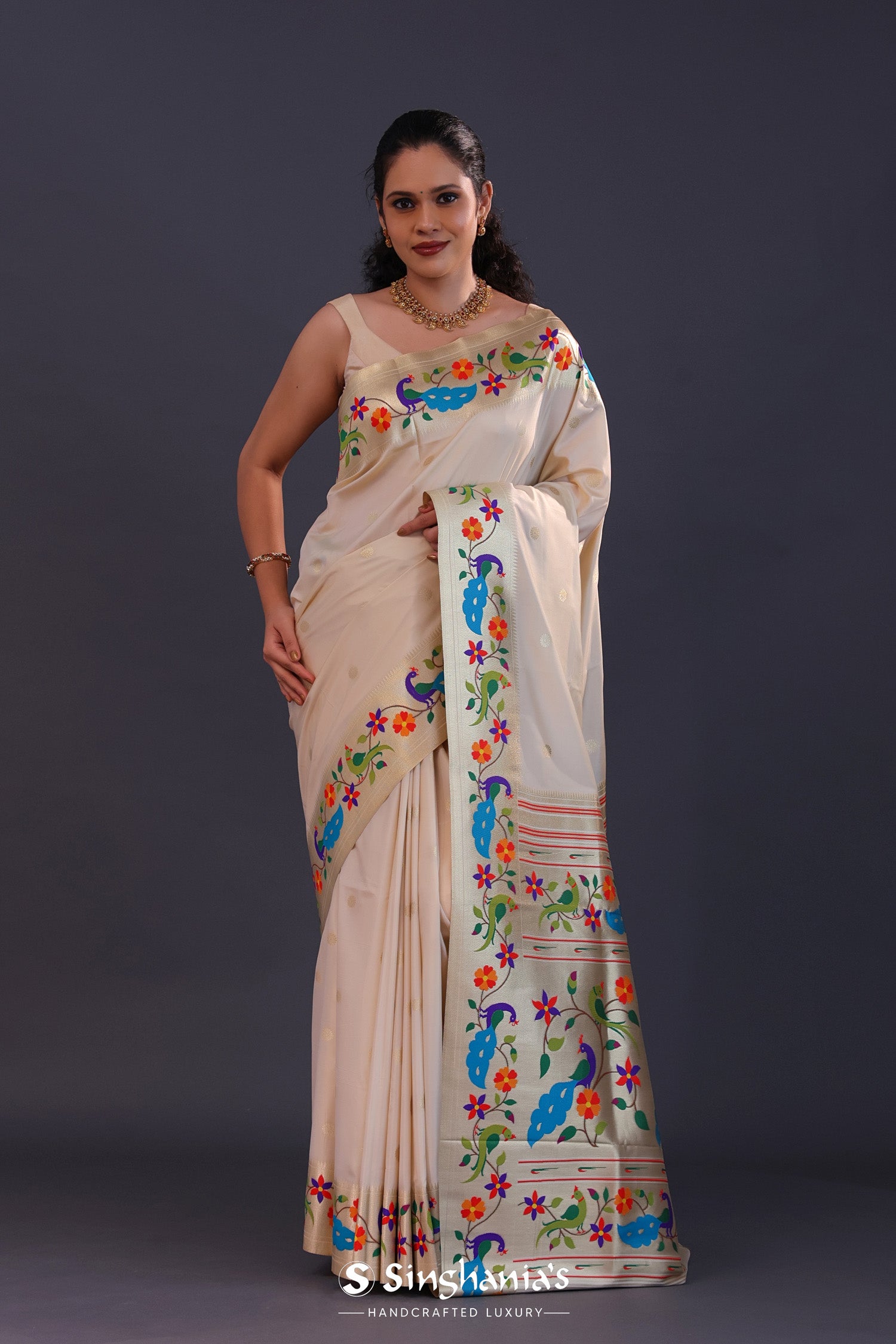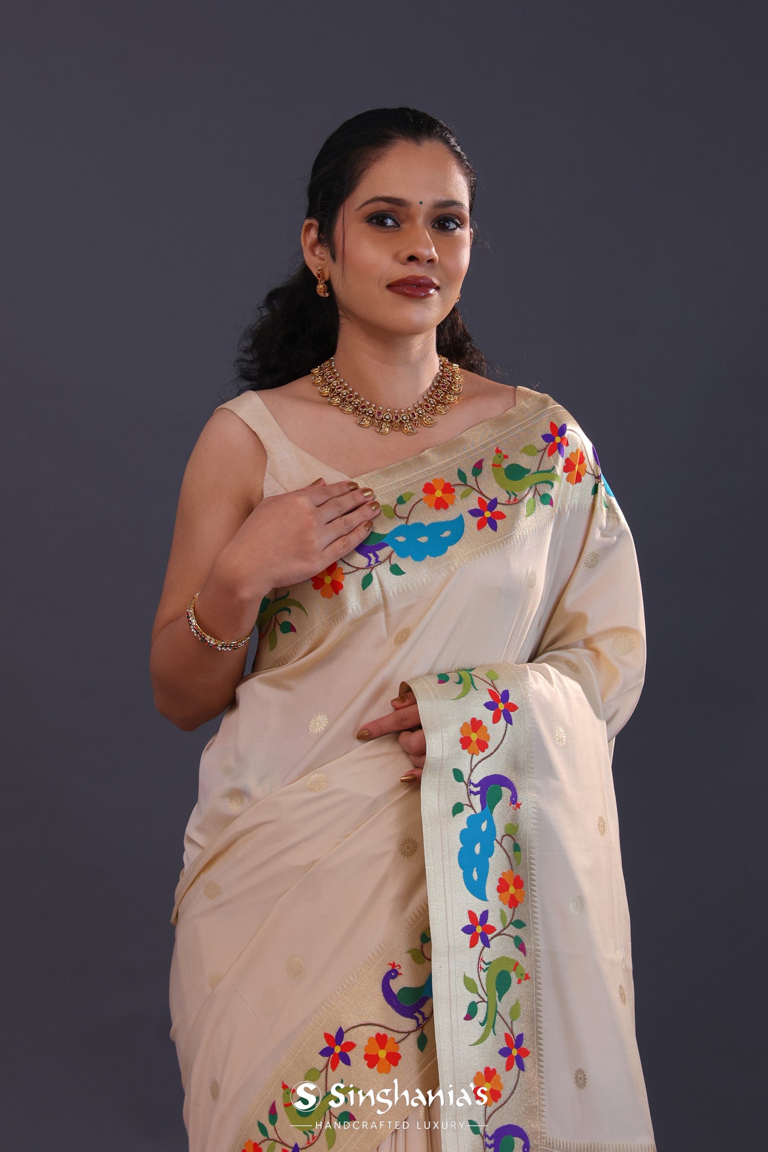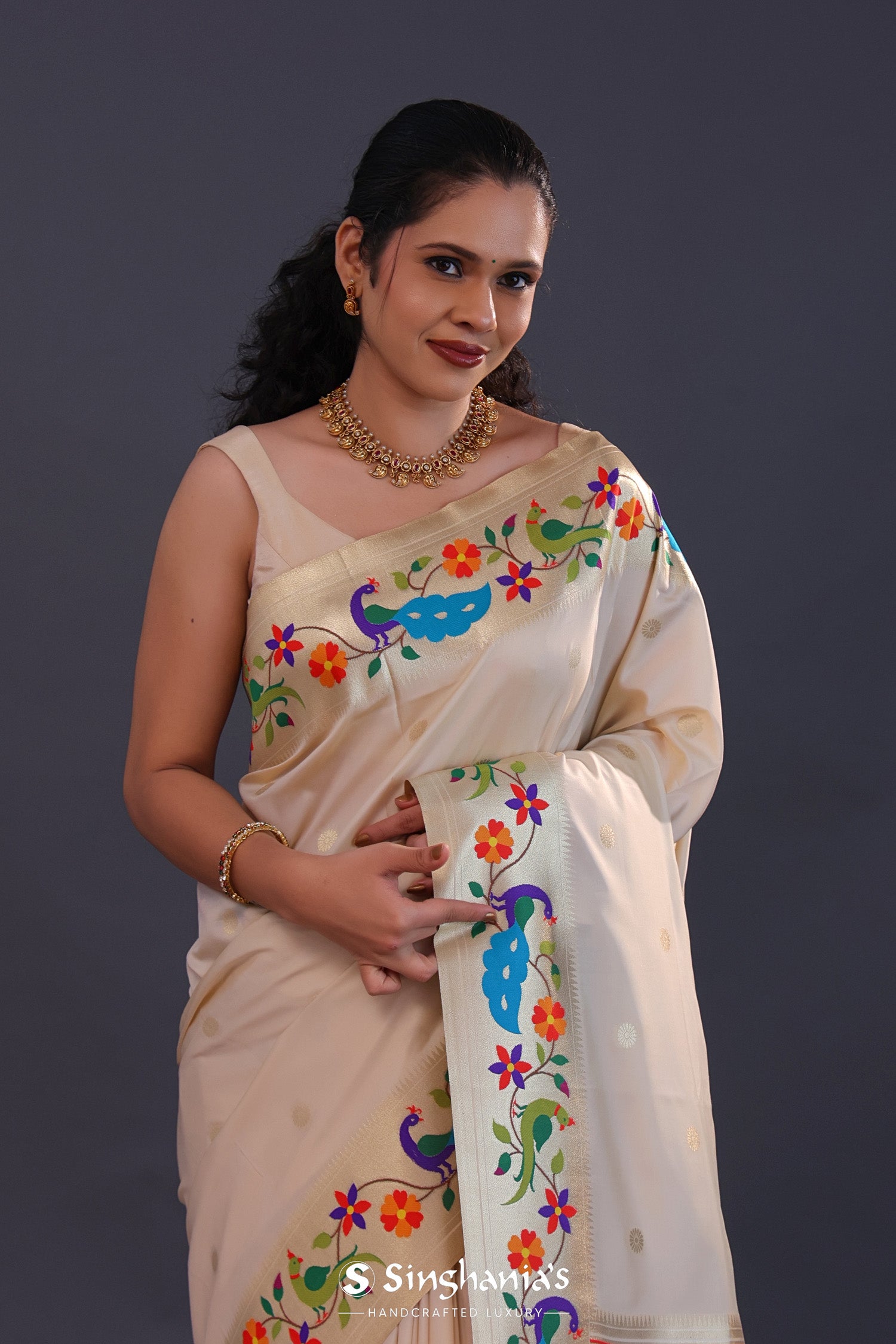 This cream tan paithani saree features floral butti's scattered all over the body of saree complemented with paithani border and unstitched blouse