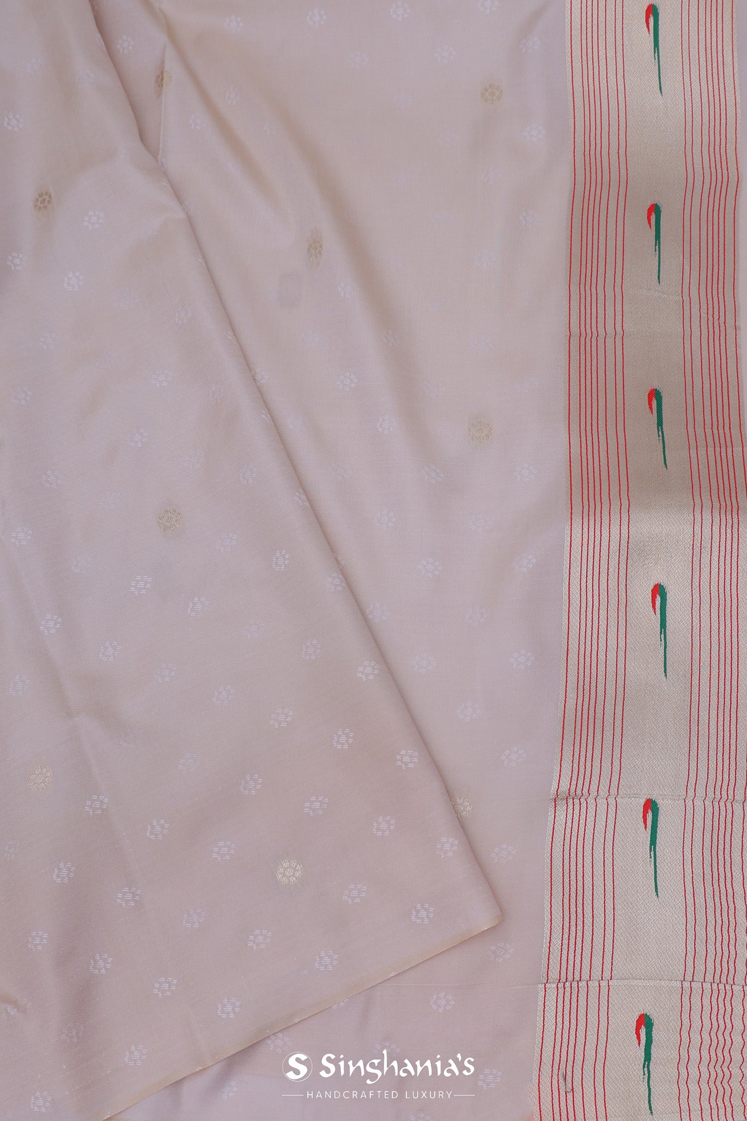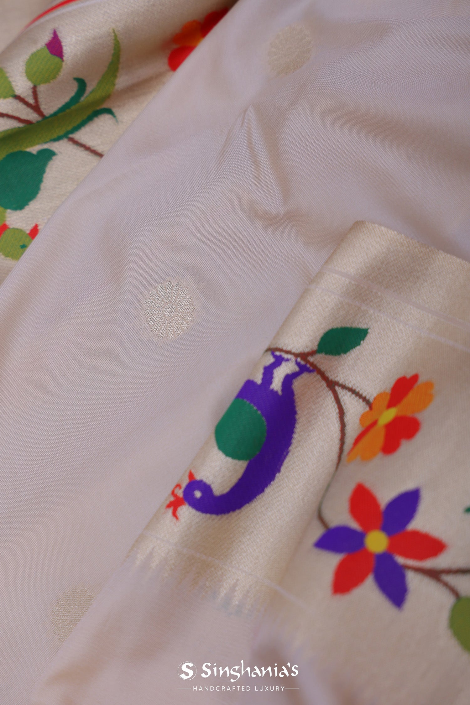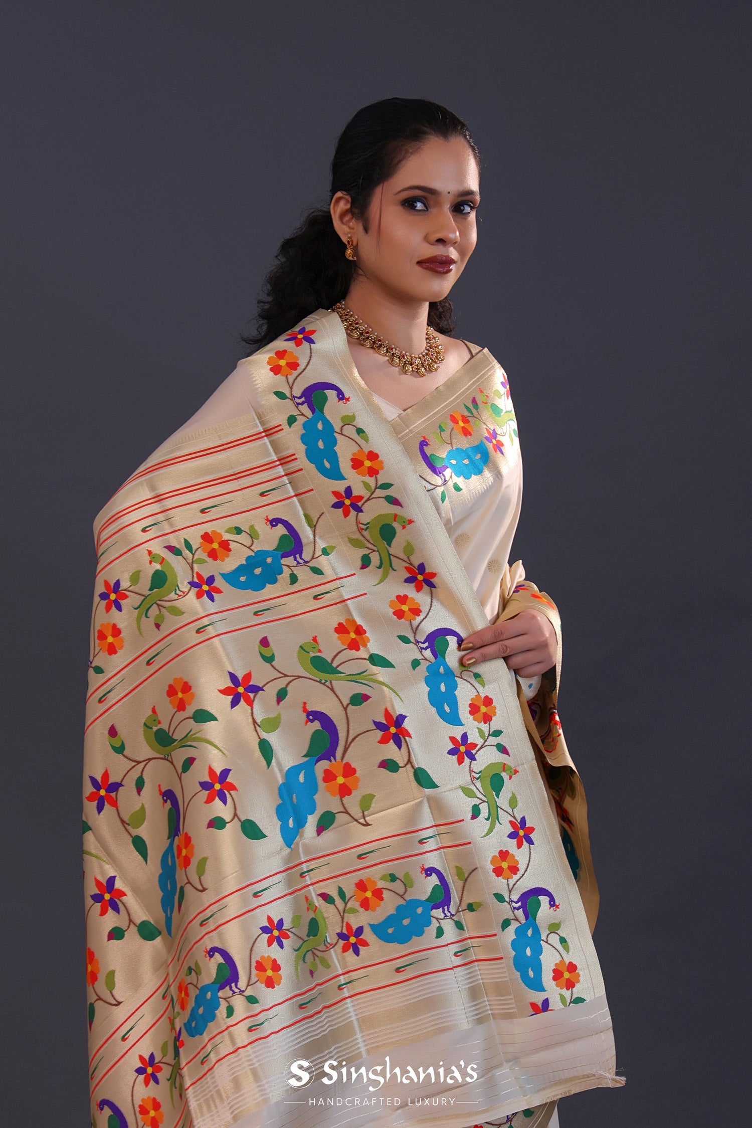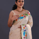 This cream tan paithani saree features floral butti's scattered all over the body of saree complemented with paithani border and unstitched blouse