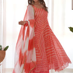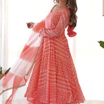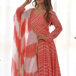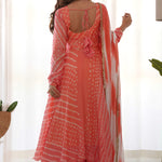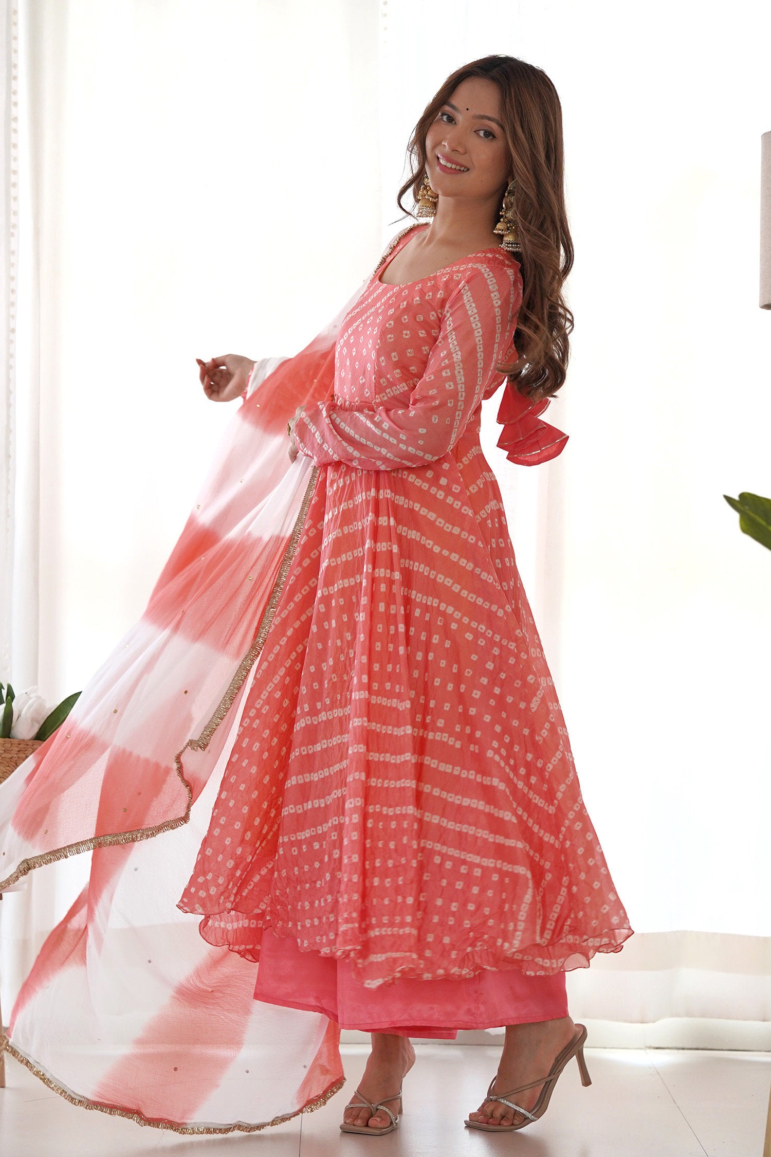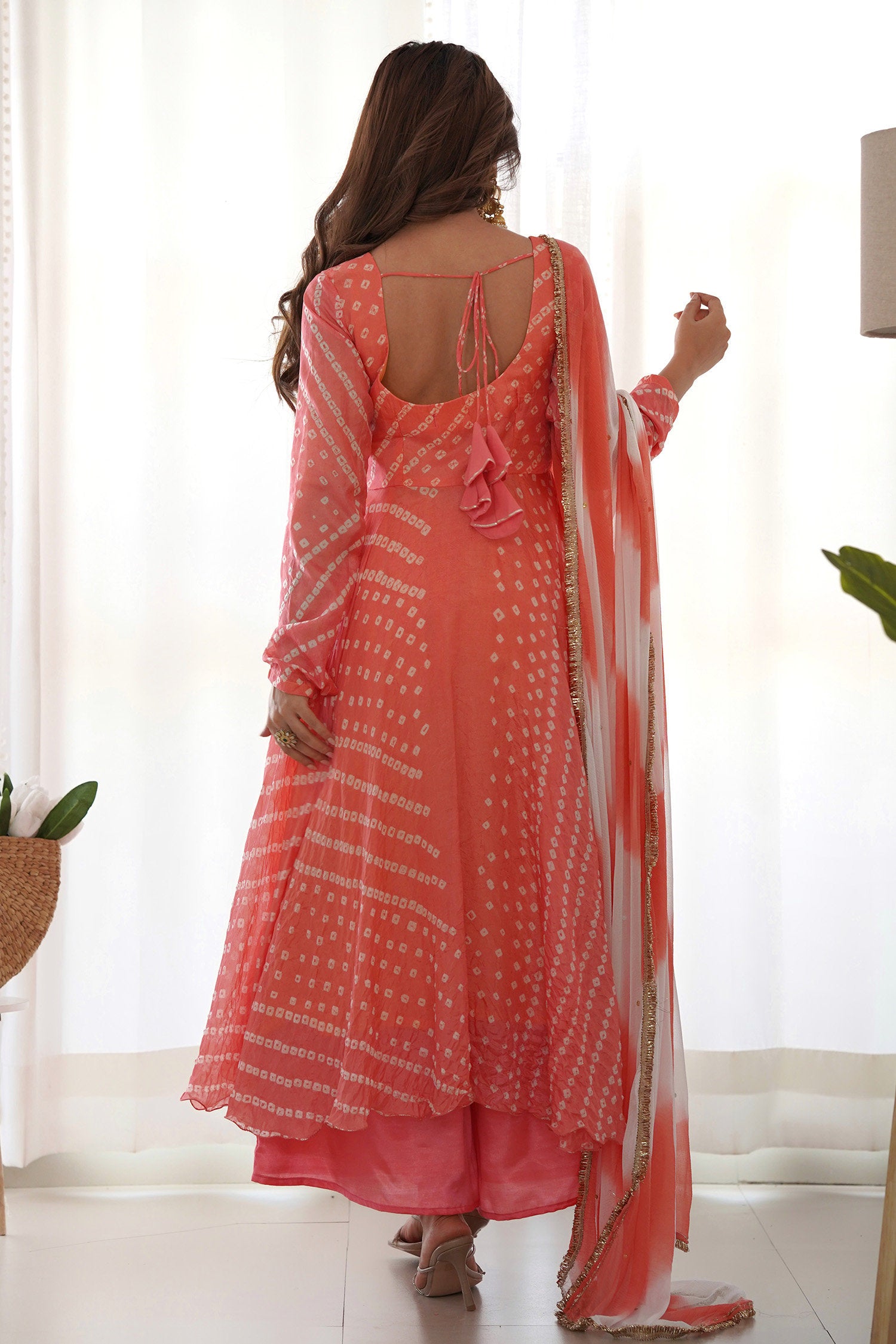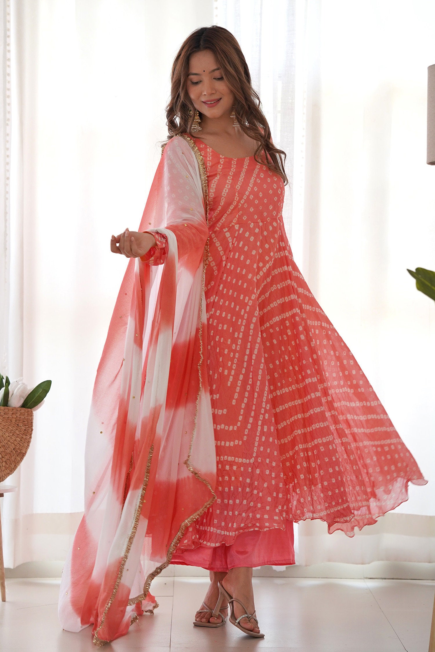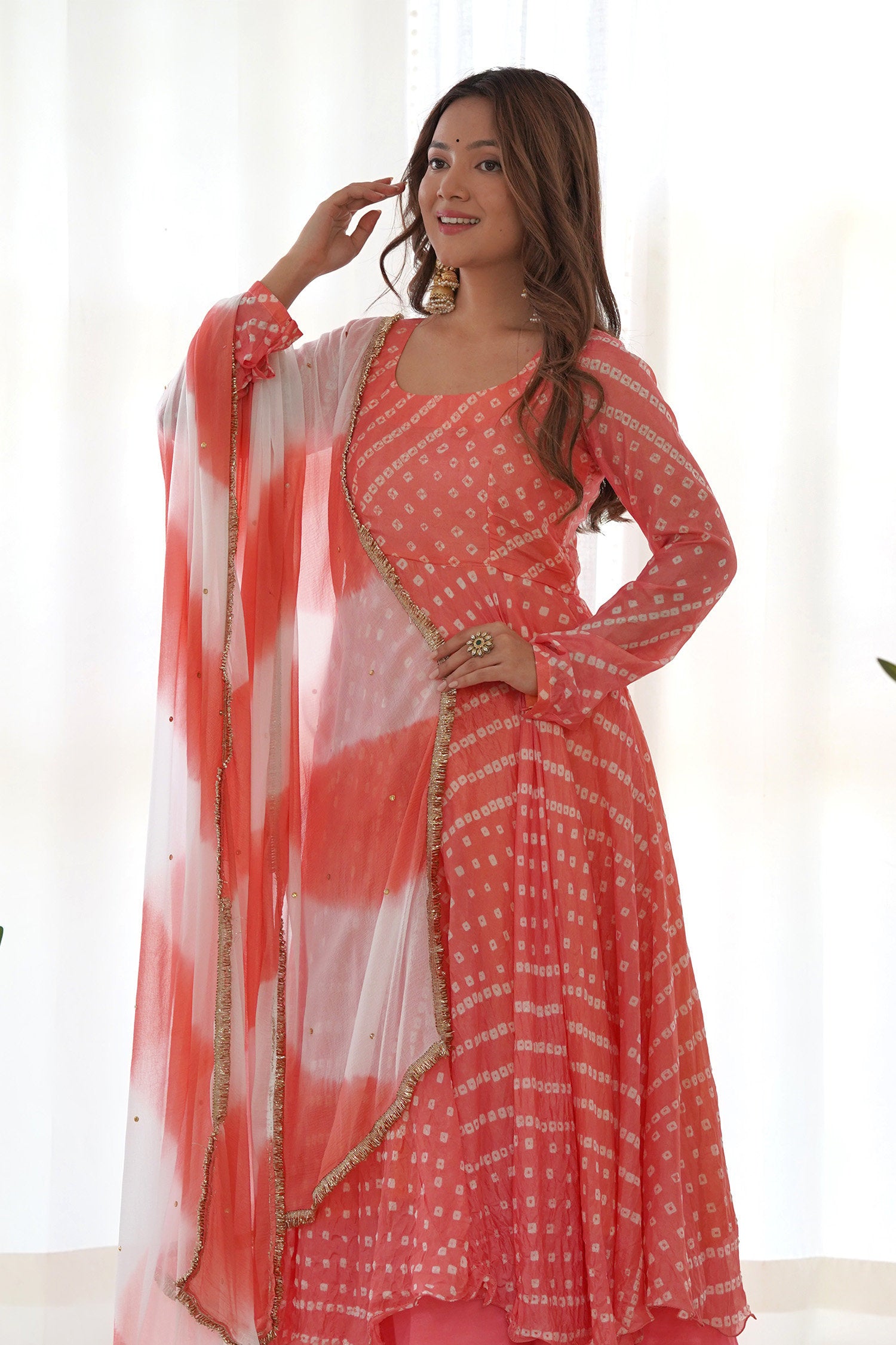 Peach anarkali set with round neck silk and chiffon Bandhani kurti and lace detailing matching Peach flared palazzo and dupatta for a combination of style with comfort.