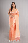 This creamy peach organza banarasi saree, graced with floral jaal weaving in gold and tilfi zari across the body, is a delightful choice for festivals, weddings and parties. The geometric border and pallu elegantly completes the overall design, enhancing its charm.