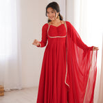The crimson red solid georgette anarkali set with subtle lace work and a matching solid dupatta for a beautiful and elegant look with every flare.