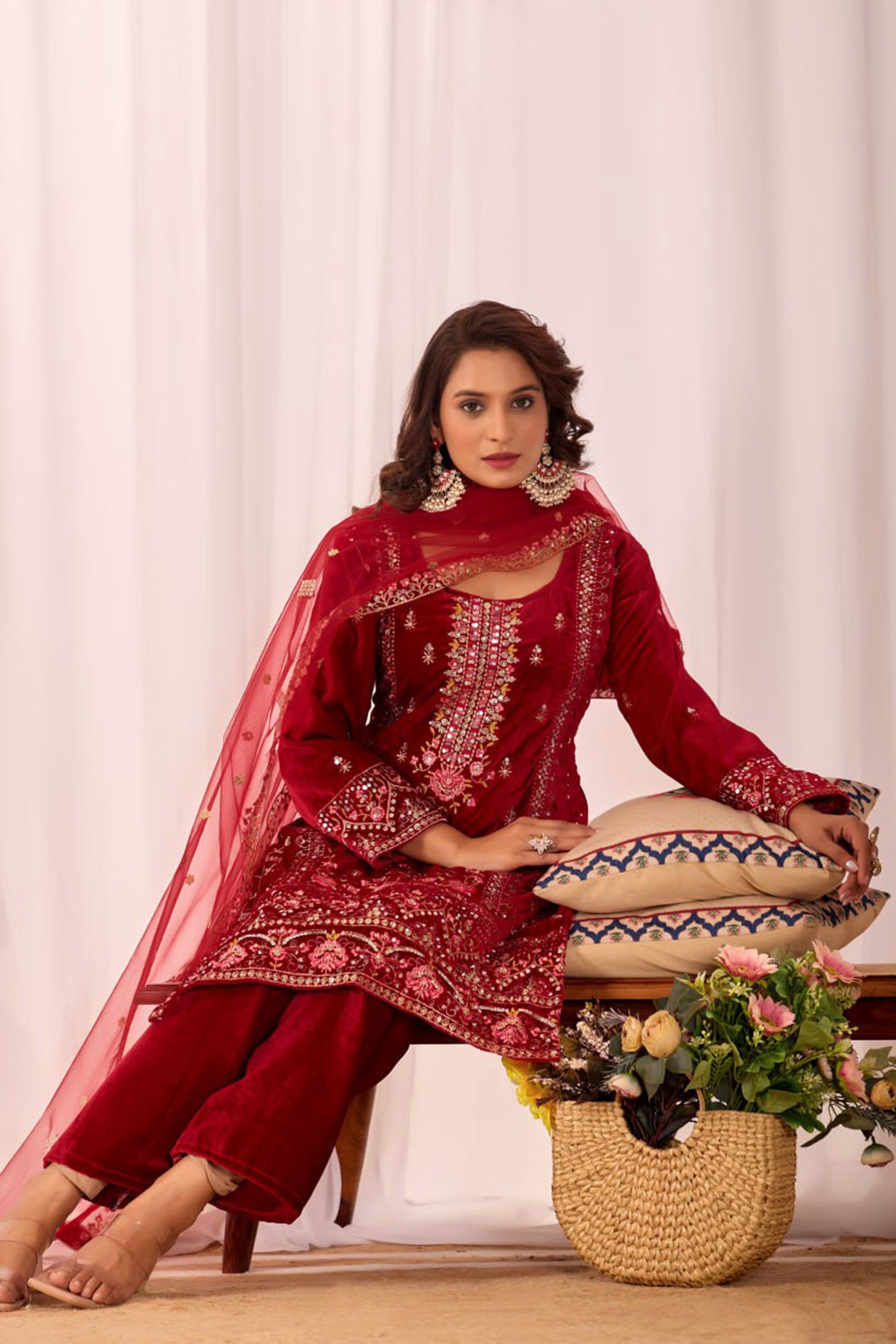 The crimson red velvet floral embroidered kurta set with embroidered straight cut kurti matching pant and net dupatta for a rich graceful look with elegance.