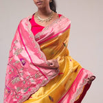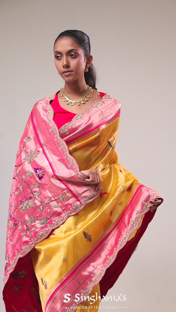 A brightly hued baby cyber yellow saree with a tissue base, which features zari weaving and bird pattern. Added with intricate embroidery & paithani munia border and pallu, which accentuates the whole look. Suitable for festive wear and wedding parties.