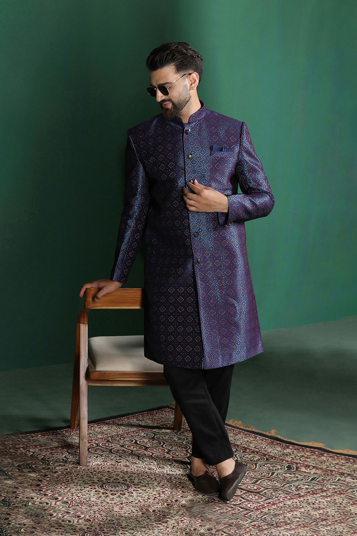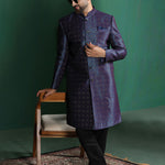 Dark Blue And Black Jacquard Texture Sherwani Set